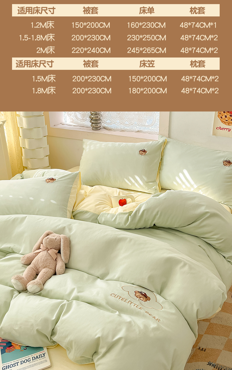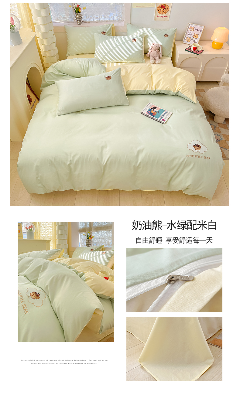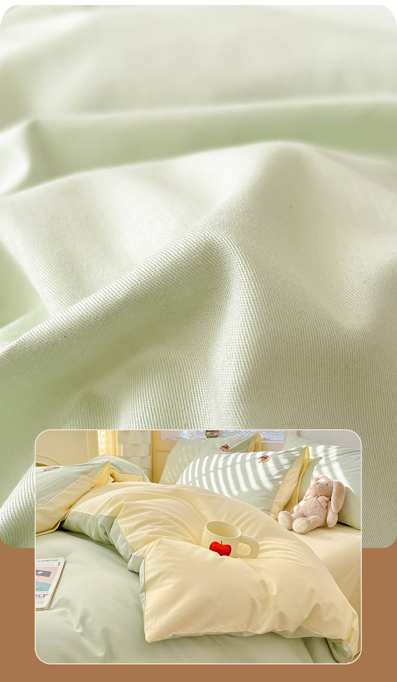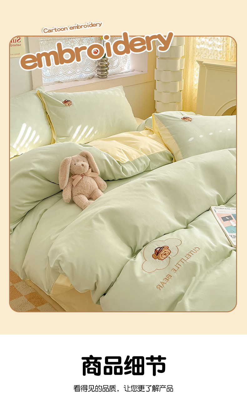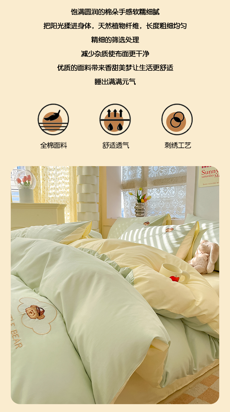 当前位置: 91家纺网 > 商品网购 > 床品套件 > 四件套 > 全棉普通四件套 > 琪格格纺织 2025新款40s全棉纯棉小熊绣花系列四件套 奶油熊 水绿配米白