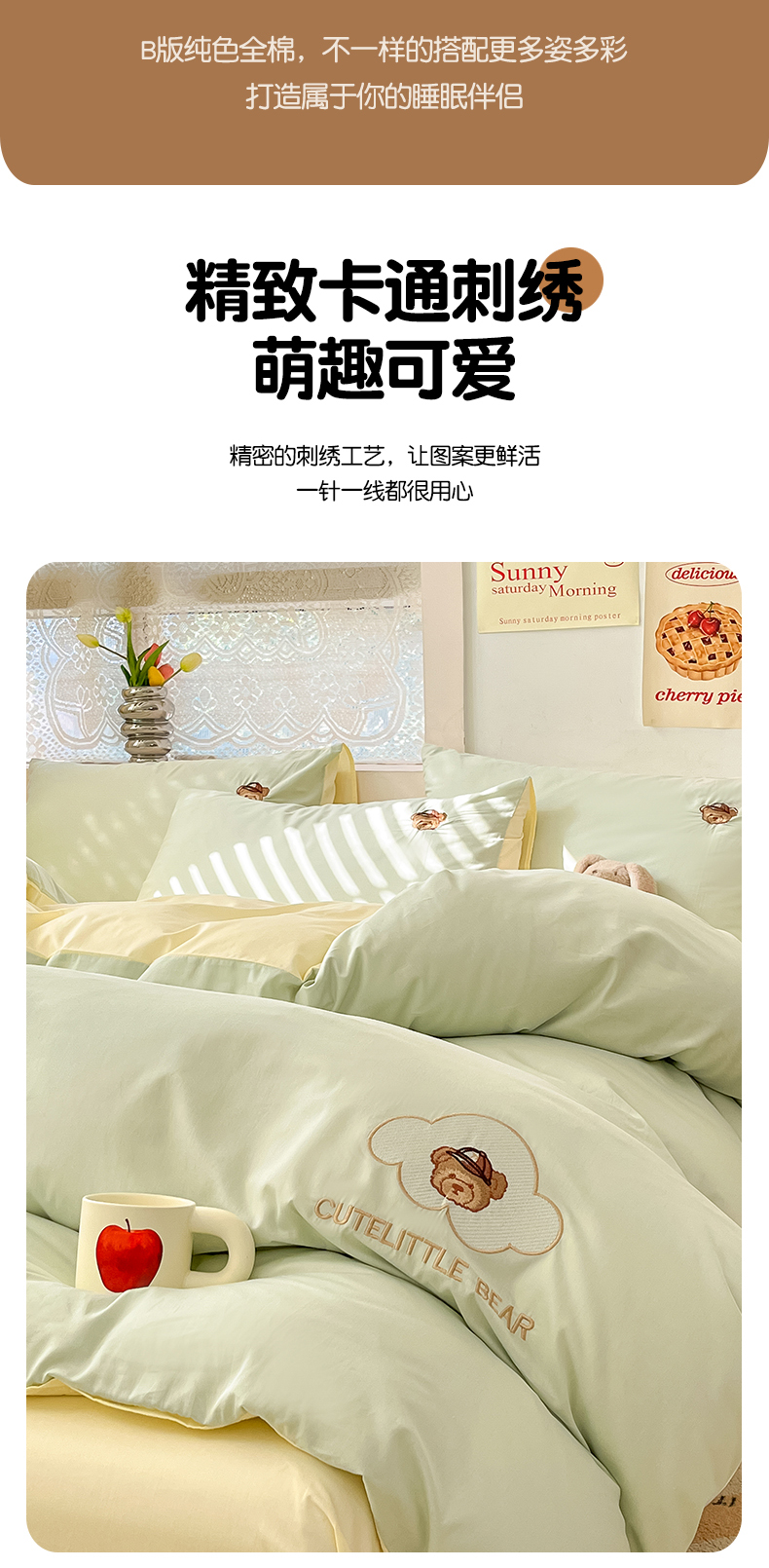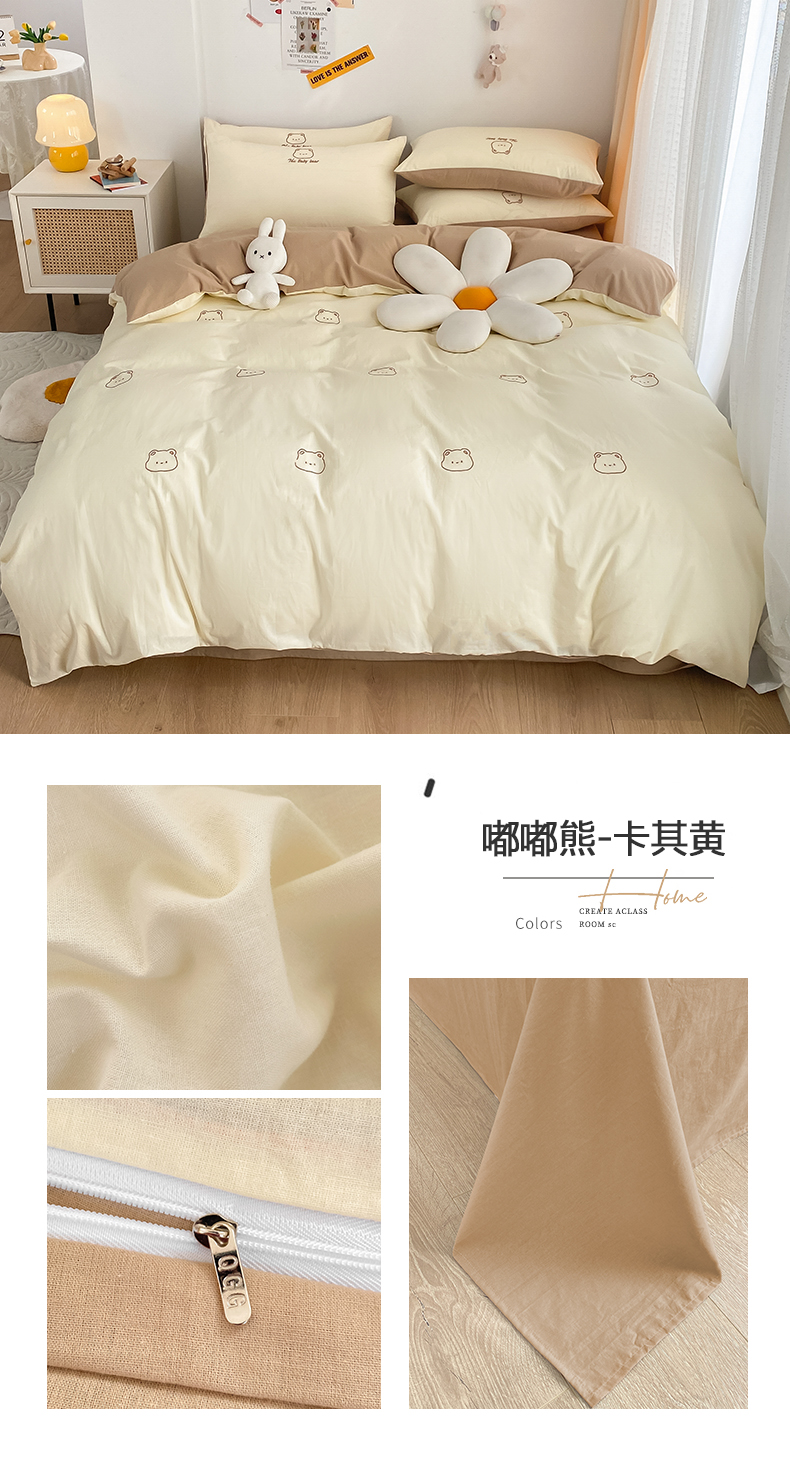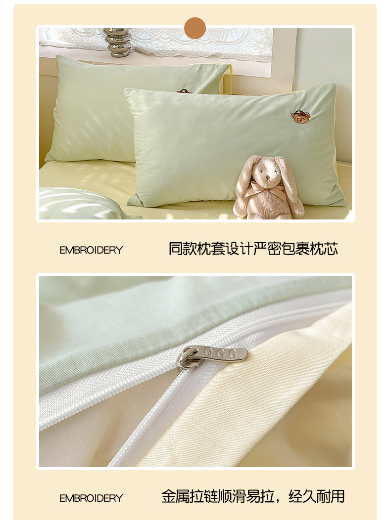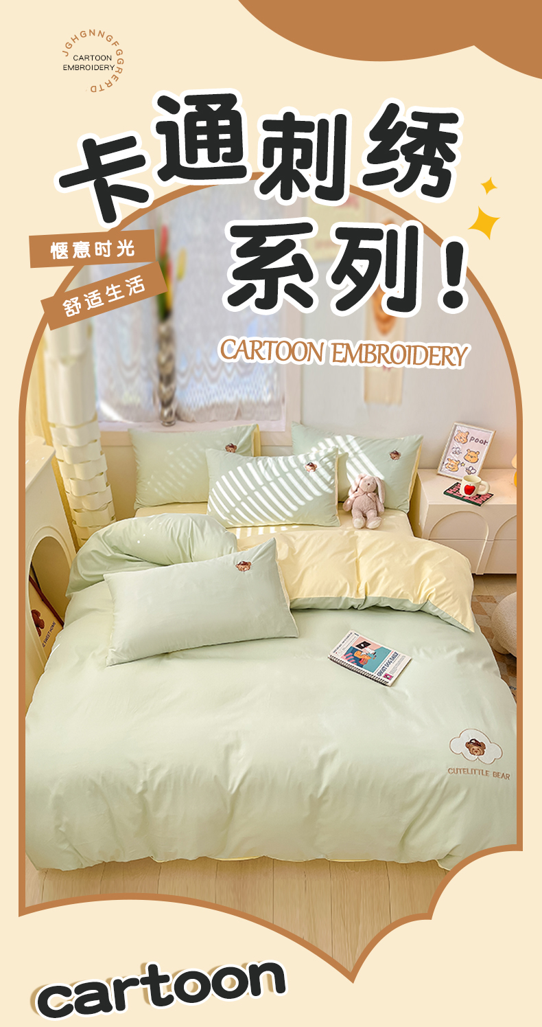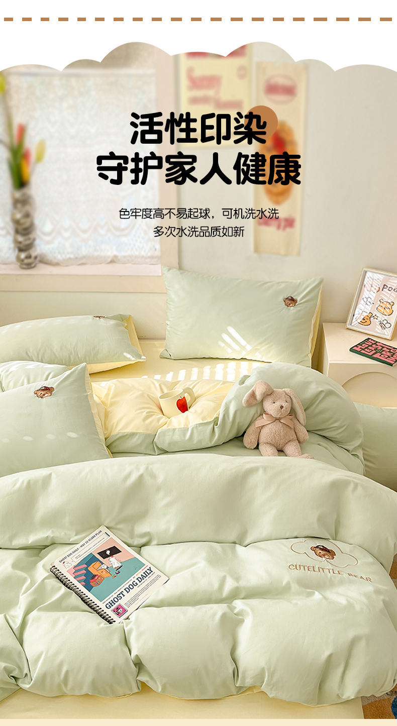 当前位置: 91家纺网 > 商品网购 > 床品套件 > 四件套 > 全棉普通四件套 > 琪格格纺织 2025新款40s全棉纯棉小熊绣花系列四件套 奶油熊 水绿配米白