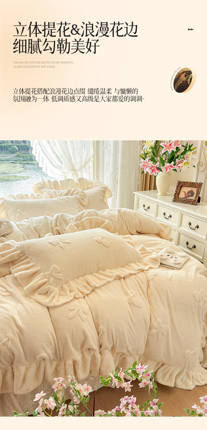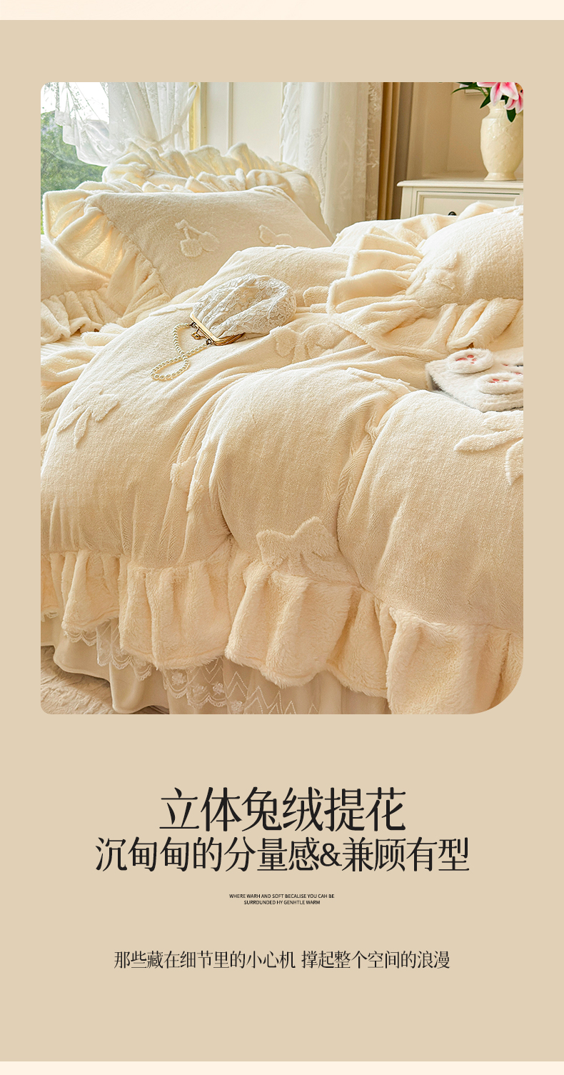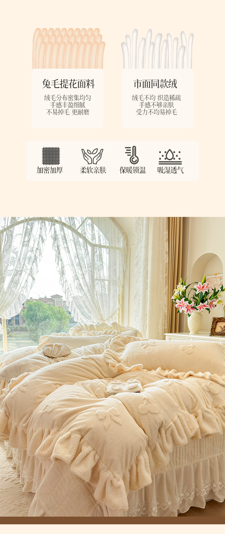 (总)宜凡家纺 2025新款兔绒提花牛奶绒夹棉床裙四件套,爱心 少女粉,爱心 粉紫,爱心 驼色,蝶舞 大红,蝶舞 米色,蝶舞 浅紫,蝶舞 玉色,简爱 苍青,简爱 豆沙紫,简爱 玉色,樱桃 苍青,樱桃 豆沙紫,樱桃 奶油白