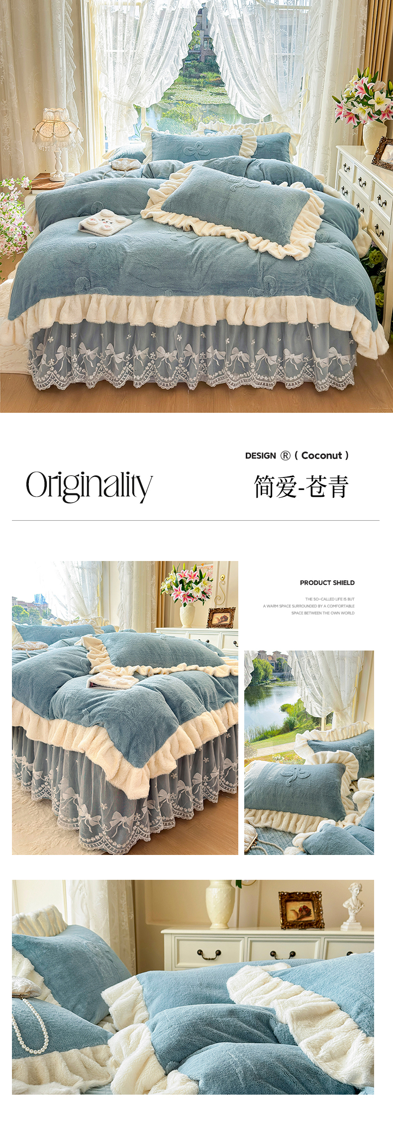 商品名称:宜凡家纺 2025新款兔绒提花牛奶绒夹棉床裙四件套 简爱 苍青
