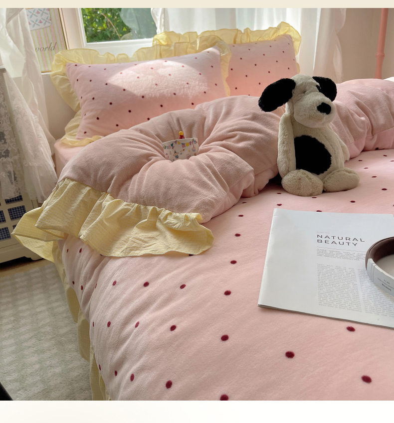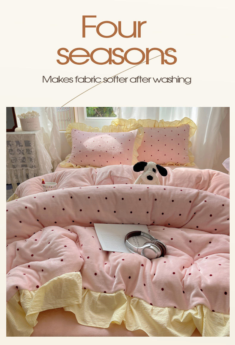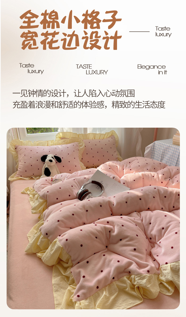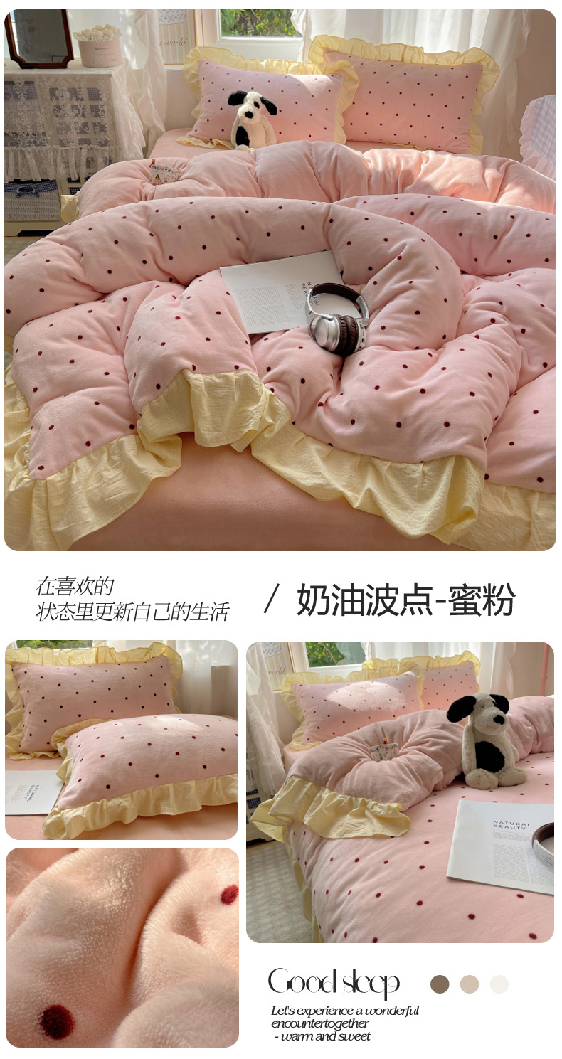 当前位置: 91家纺网 > 商品网购 > 床品套件 > 四件套 > 牛奶绒四件套 > 丽涵家纺 2025秋冬新品韩系牛奶绒波点小格子花边四件套 奶油波点-蜜粉