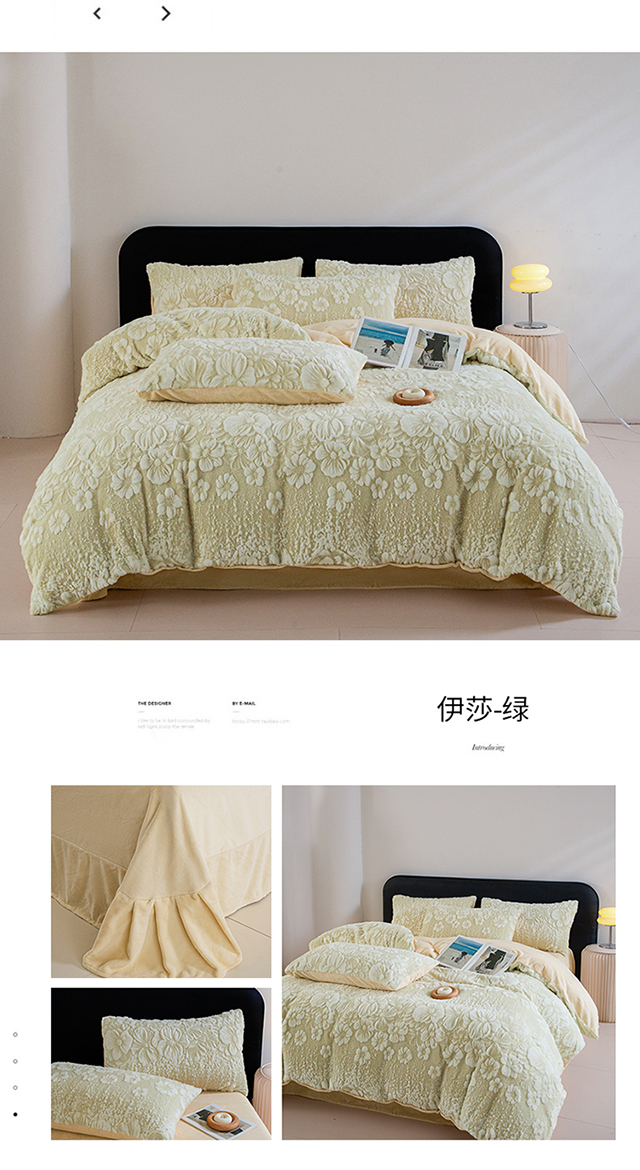 (总)诺梵家纺 2025新款立体兔毛烂花四件套,伊莎-灰,蝶梦-绿,伊莎-绿,伊莎-黄,伊莎-粉,蝶梦-黄