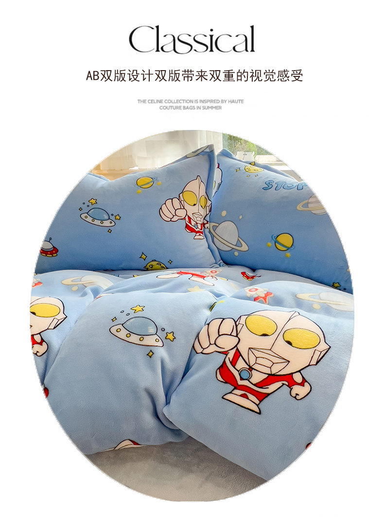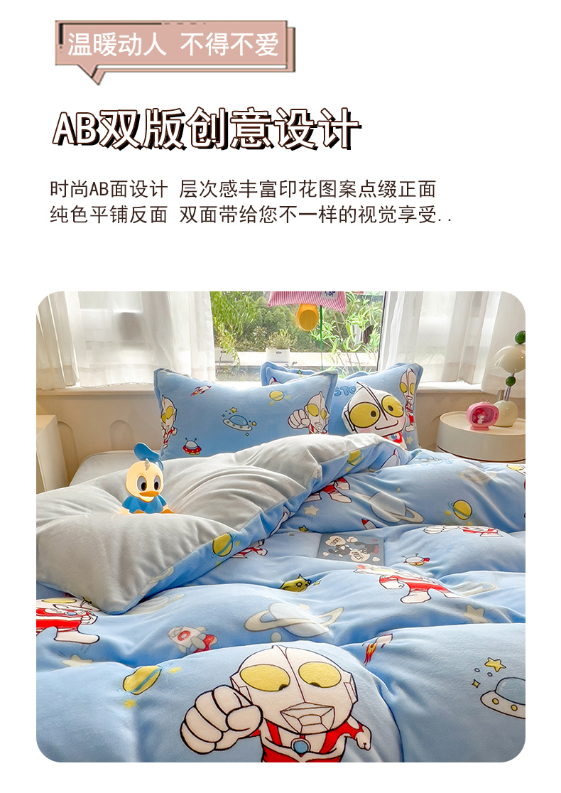 (总)云恋家纺 2025新款卡通牛奶绒四件套珊瑚法兰绒床单床笠被套儿童床上用品冬季,奥特曼降临-天蓝,爱心库洛米-紫色,奥特曼-深蓝,蛋仔家族-黄色,甜甜玉桂狗-粉色,兄弟海绵宝宝-黄色,奥特曼打怪兽-浅蓝