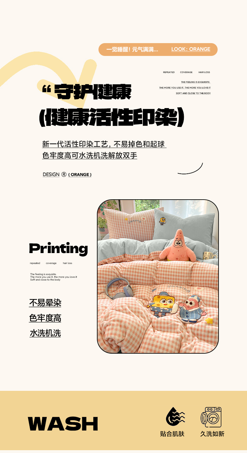商品名称:如一 2025新款卡通毛巾绣系列牛奶绒四件套 海绵宝宝