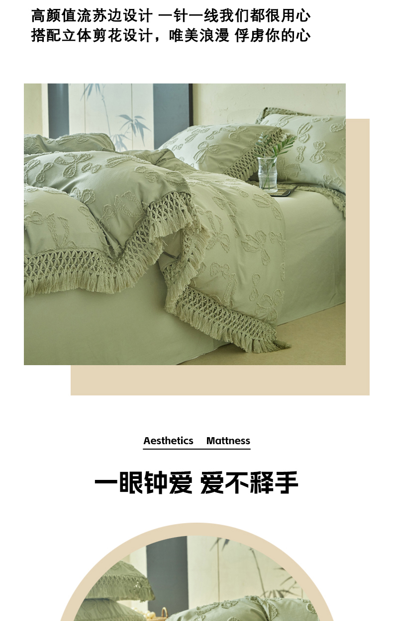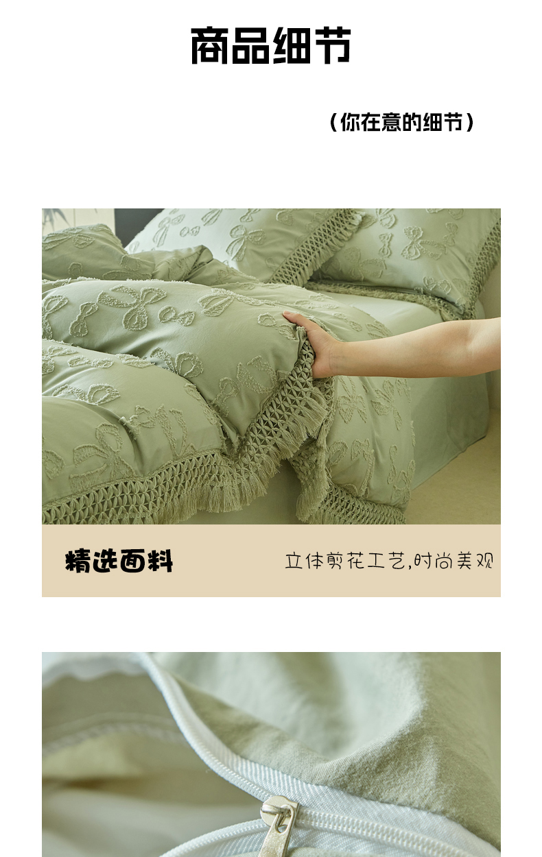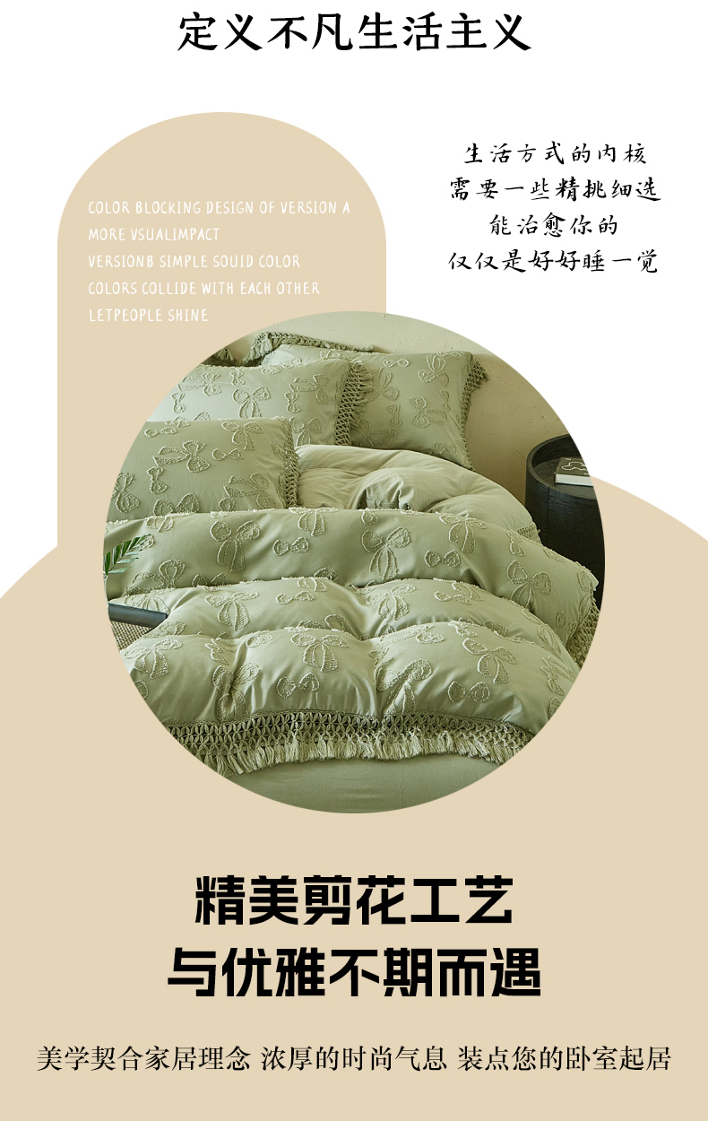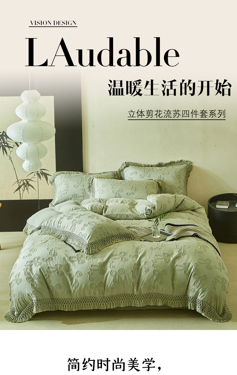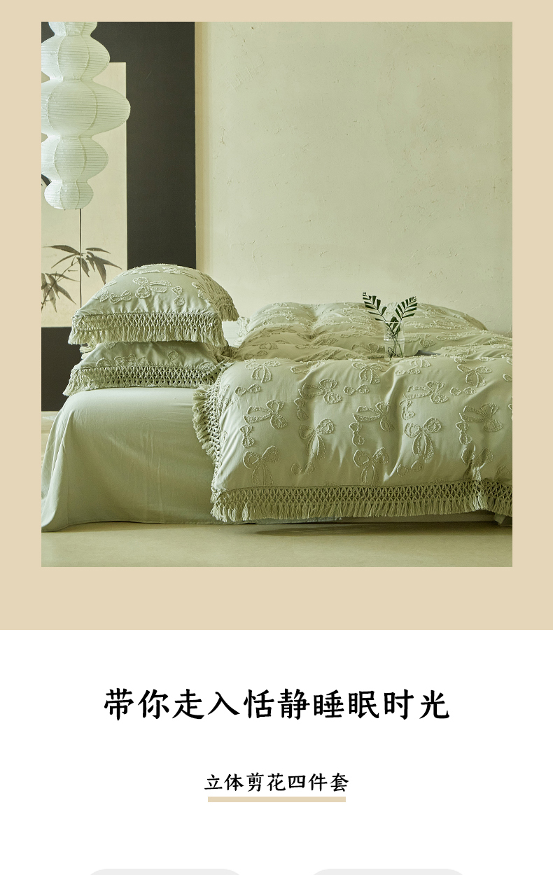 当前位置: 91家纺网 > 商品网购 > 床品套件 > 四件套 > 其它四件套 > 缘生活 2025新款立体剪花流苏四件套 四季通用-新增花型 剪花蝴蝶结 流苏+抹茶绿