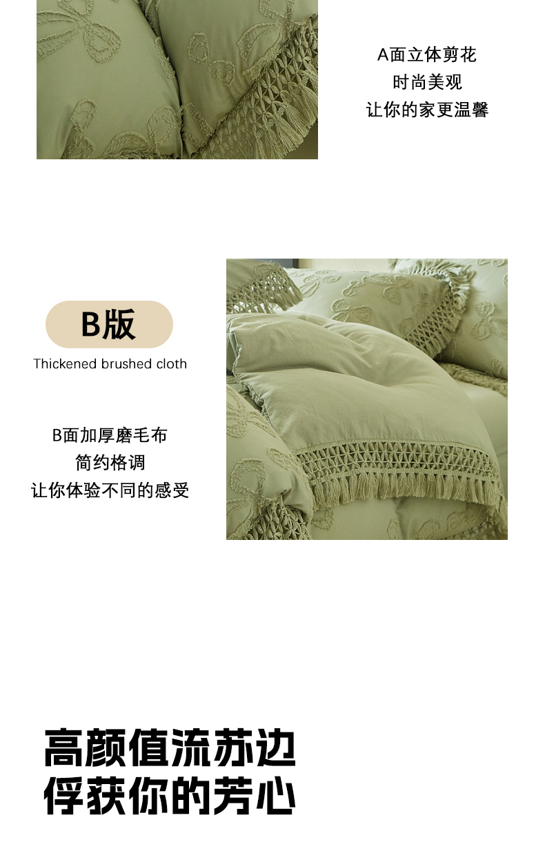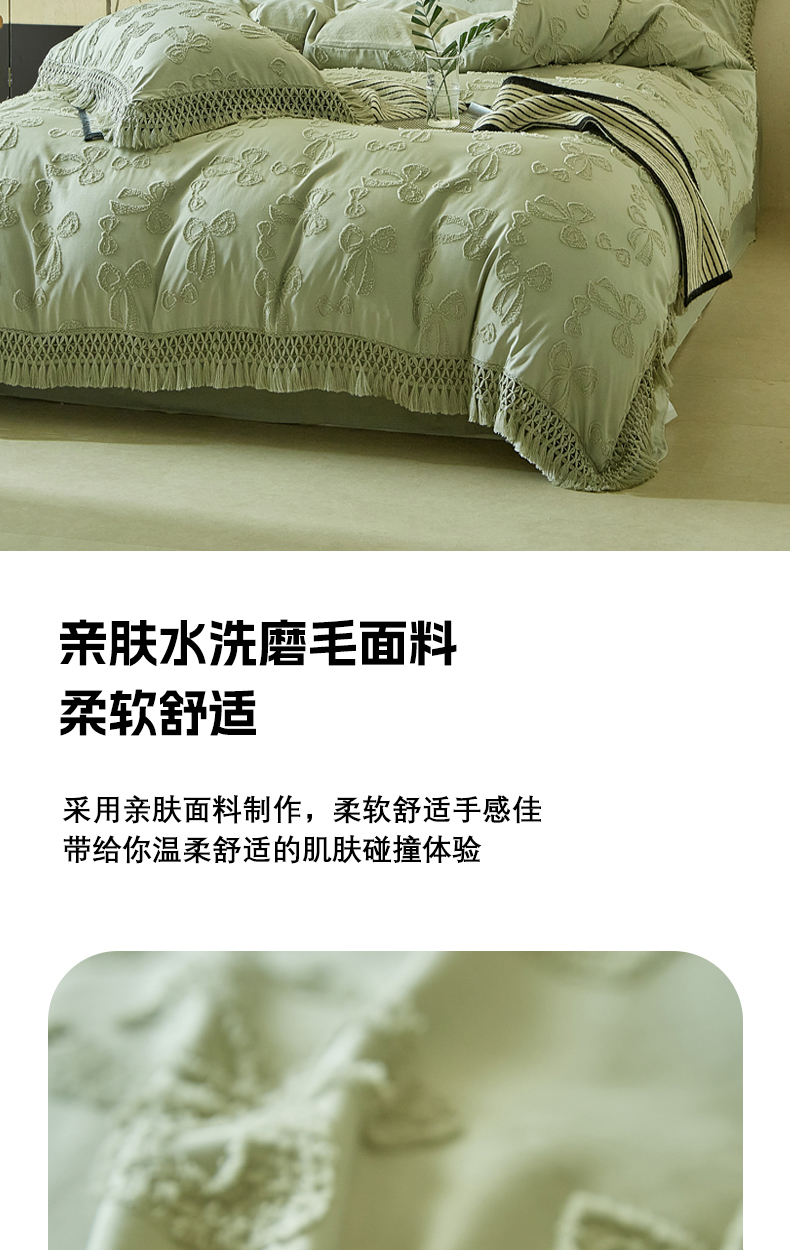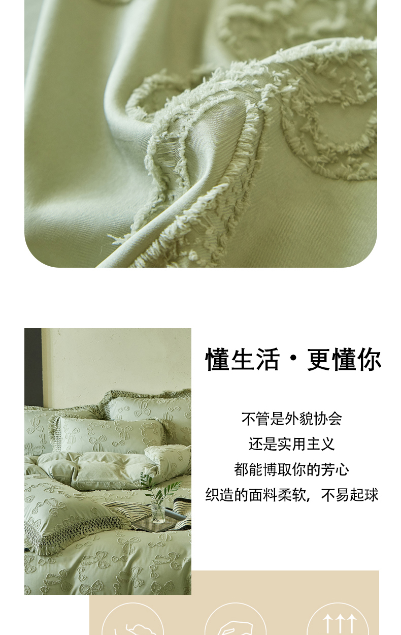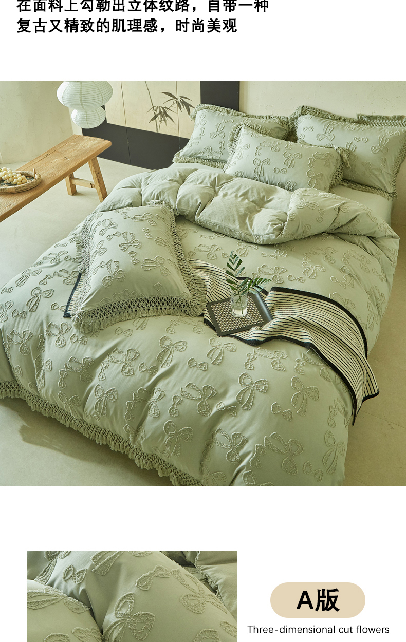 当前位置: 91家纺网 > 商品网购 > 床品套件 > 四件套 > 其它四件套 > 缘生活 2025新款立体剪花流苏四件套 四季通用-新增花型 剪花蝴蝶结 流苏+抹茶绿