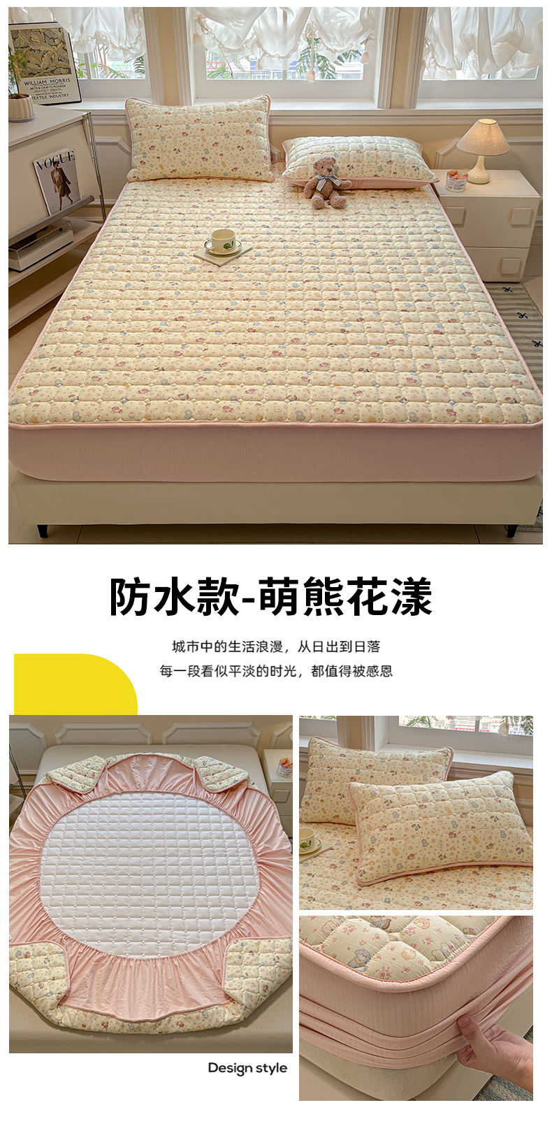 九亭家纺 2025新款A类皱皱纱印花防水夹棉床笠 普通款-萌熊花漾