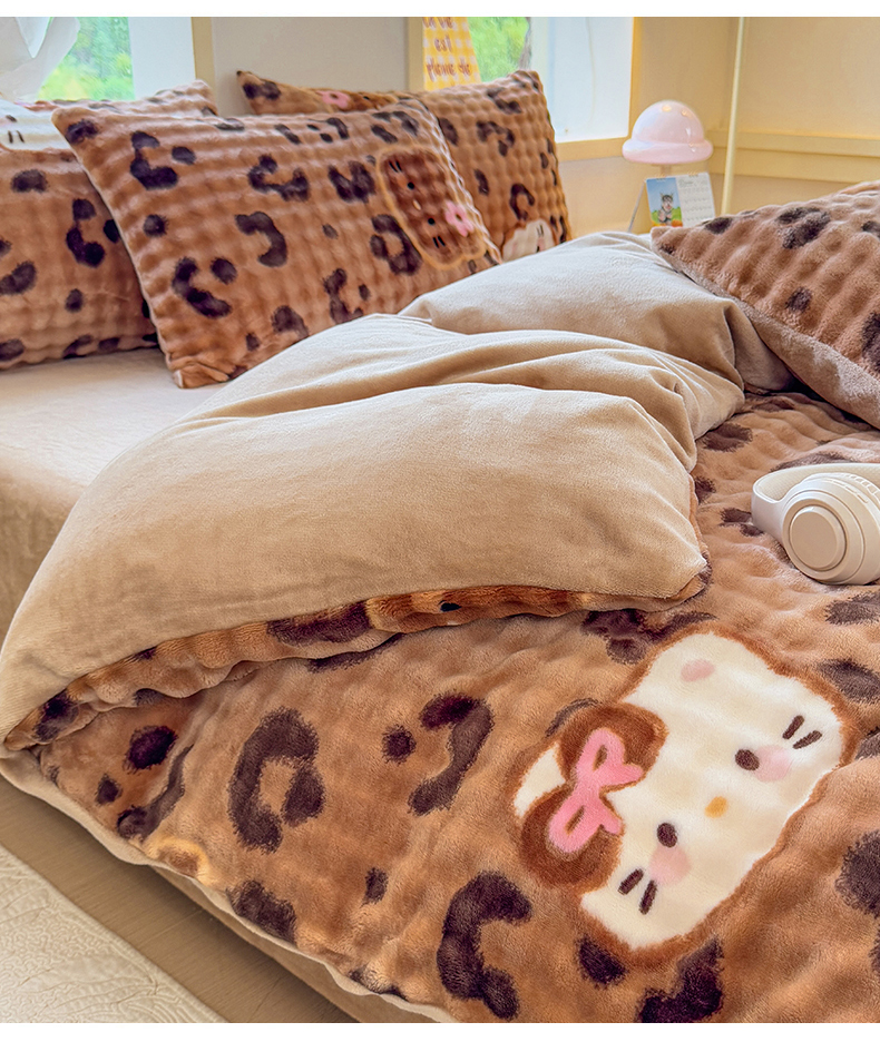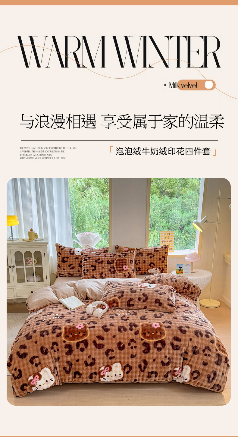 (总)仟岸家纺 2025新款牛奶绒印花四件套,豹纹咖,草莓喵,蝴蝶,蝴蝶结爱心,花妖白,花妖黑,花枝绿,玫瑰灰,玫瑰咖,顽皮狗,小点点