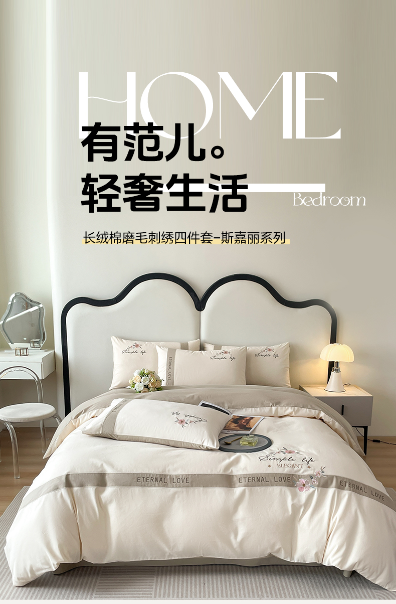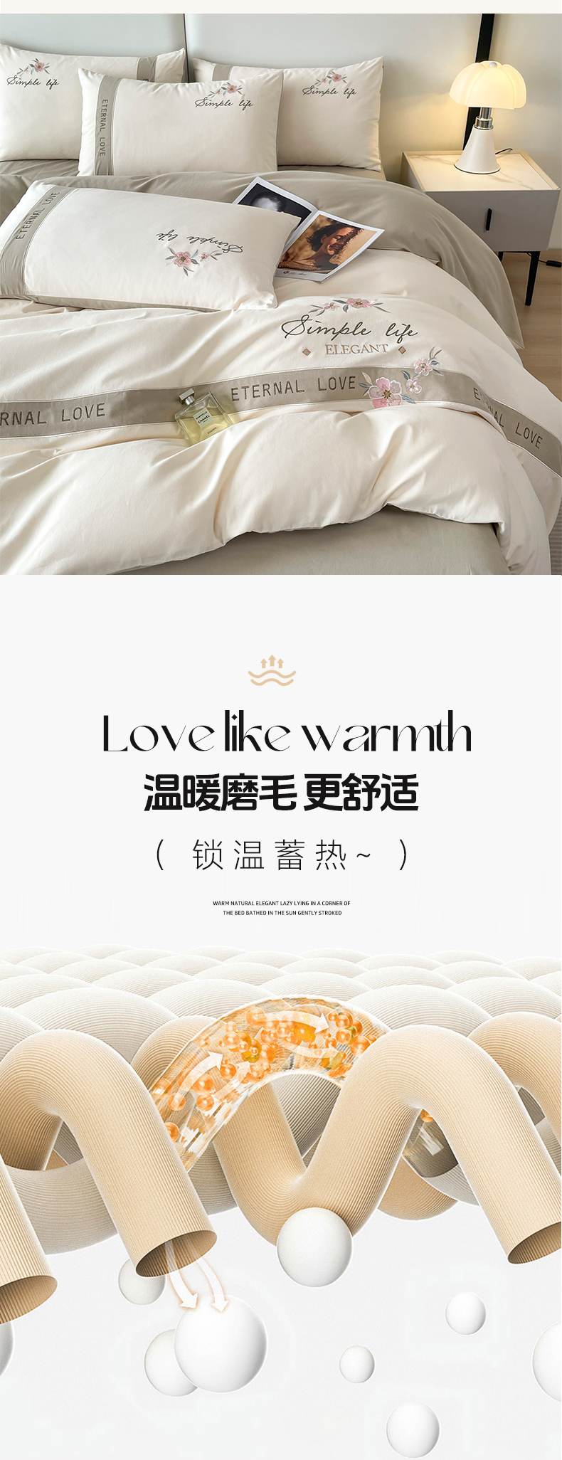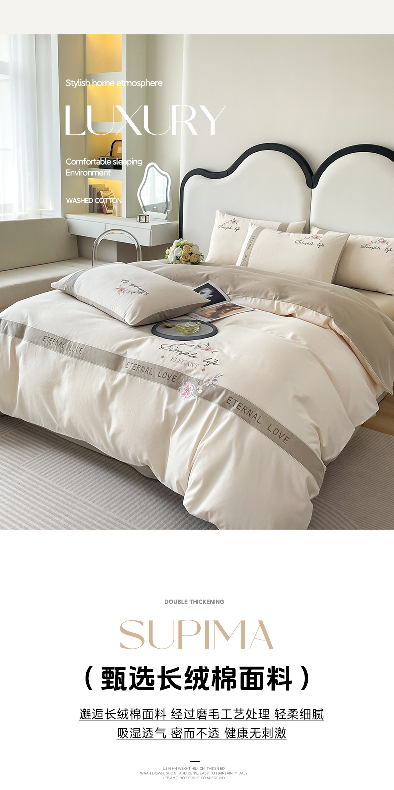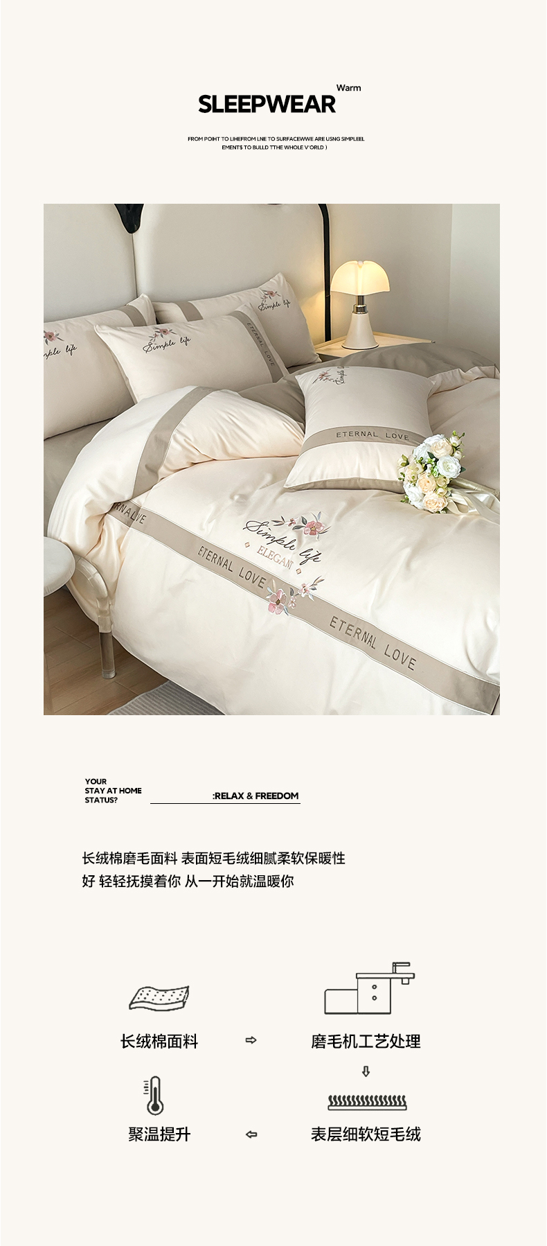 欣宜家纺 2025年秋冬新款纯棉全棉长绒棉磨毛不掉毛刺绣款绣花四件套-送高档礼盒 斯嘉丽-香槟