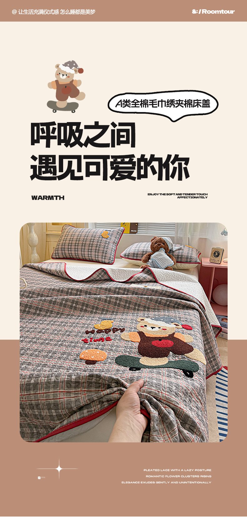 • 91家纺网 家纺一手货源 找家纺 (总)鑫喜莱家纺 2026新款全棉纯棉原创毛巾绣床盖三件套单床盖软床垫,滑板小熊仔,酷酷的小熊,面包小狗,南瓜小兔,胖熊的星星,苹果小狗,线团小黑猫,星星人,组合图仅供展示-不可下单