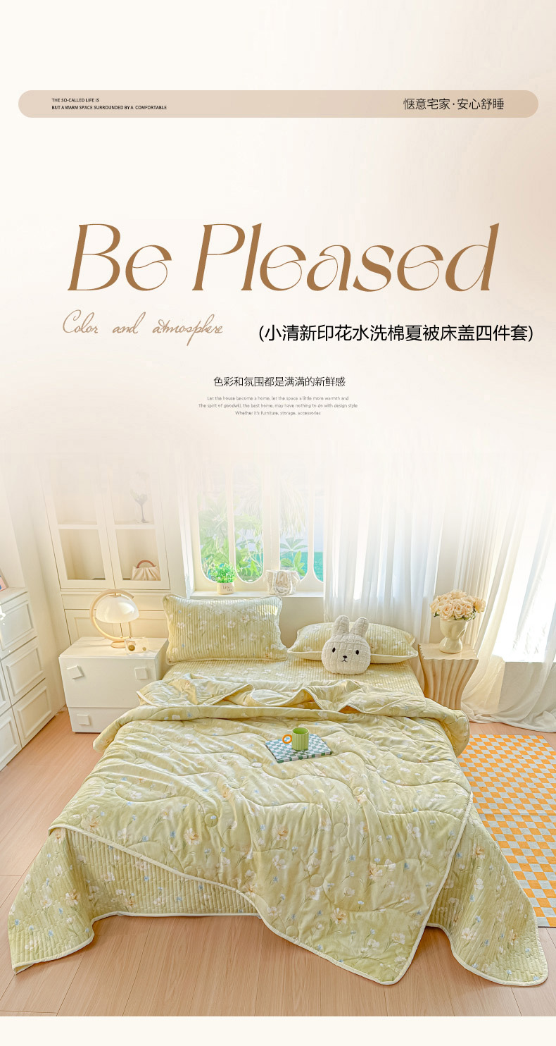 (总)慕澄家纺 2026新款小清新印花水洗棉床盖夏被四件套,小玫瑰,彩色南瓜,敦煌,灰叶,可爱小熊,蓝花樱桃,绿尧,汀兰,组合图