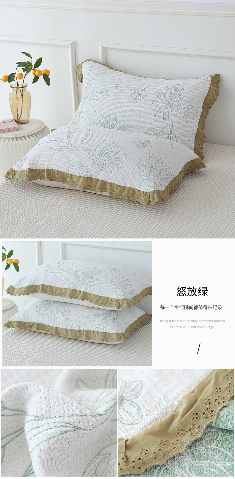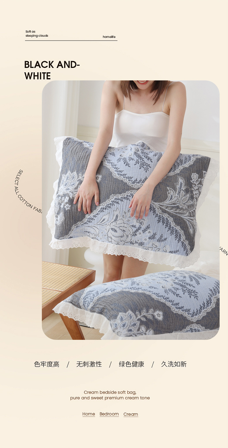 朴尔家纺-毛巾被 2026新款韩式花边四层纱枕巾纯棉竹纤维加大成人纱布枕头巾 樱桃日记-蓝