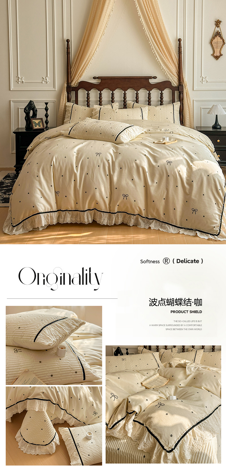 (总)美梦家纺 2025新款亲肤舒适全棉13372床盖款四件套,波点-咖,蝴蝶结-咖