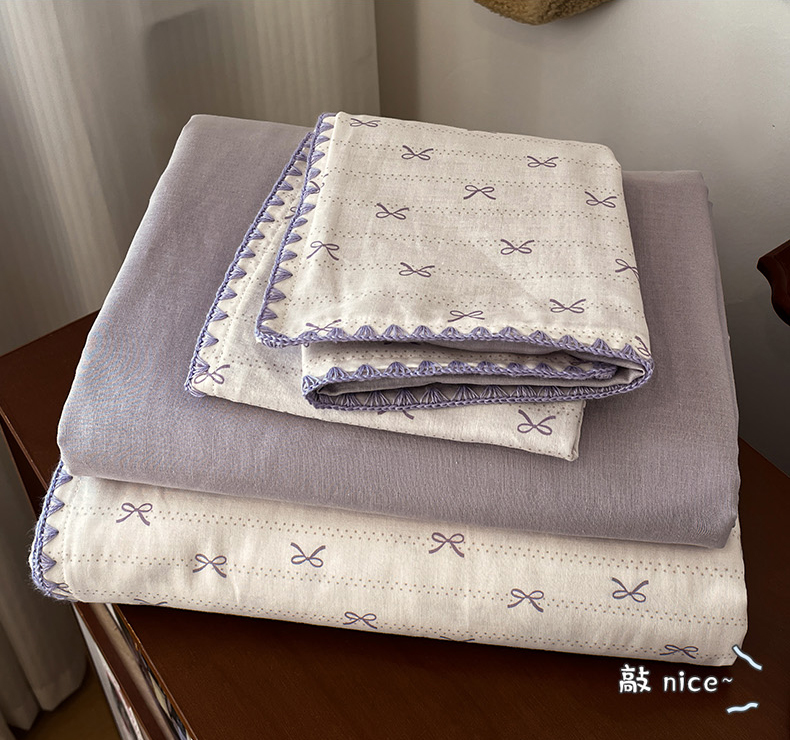 忆生活家纺 2026新款A类全棉有氧双层纱贝壳边三角针四件套 蝴蝶结-紫