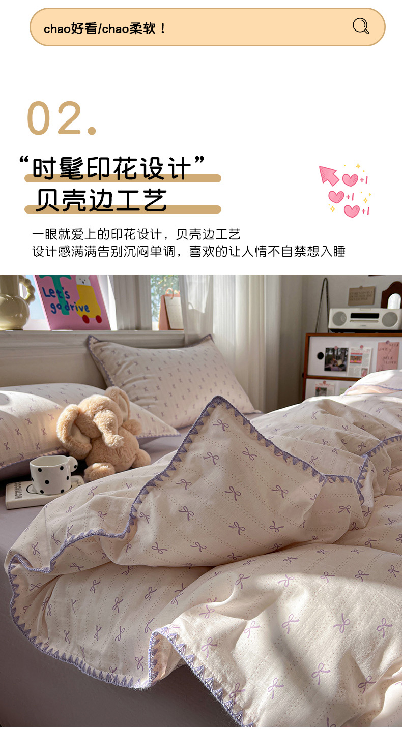 商品名称:忆生活家纺 2026新款A类全棉有氧双层纱贝壳边三角针四件套 蝴蝶结-紫