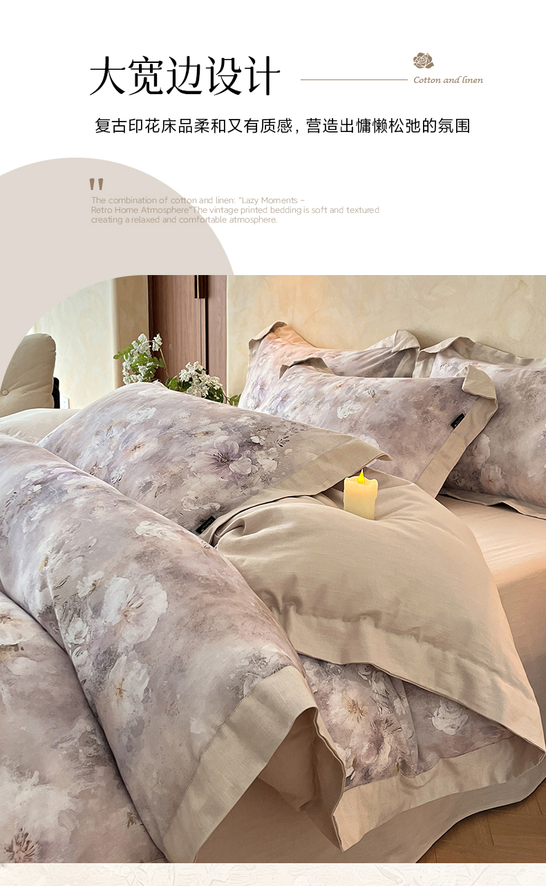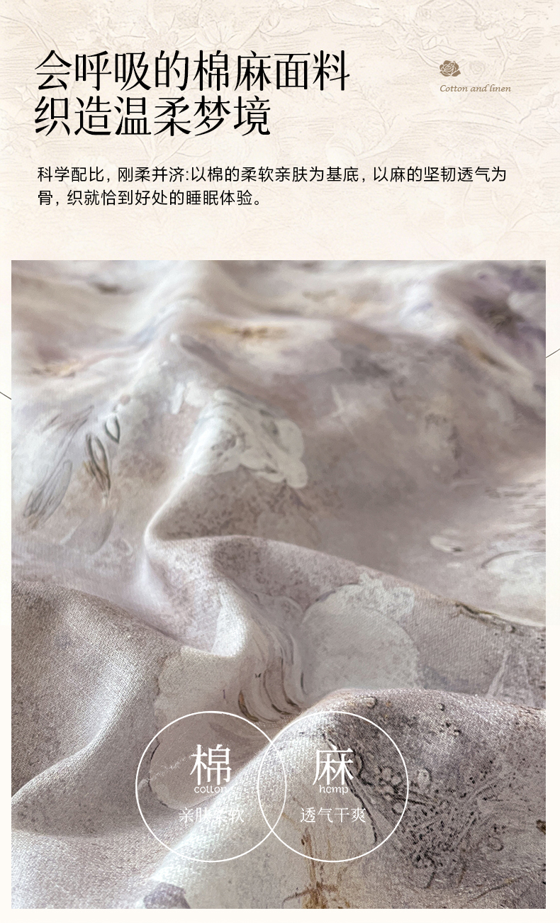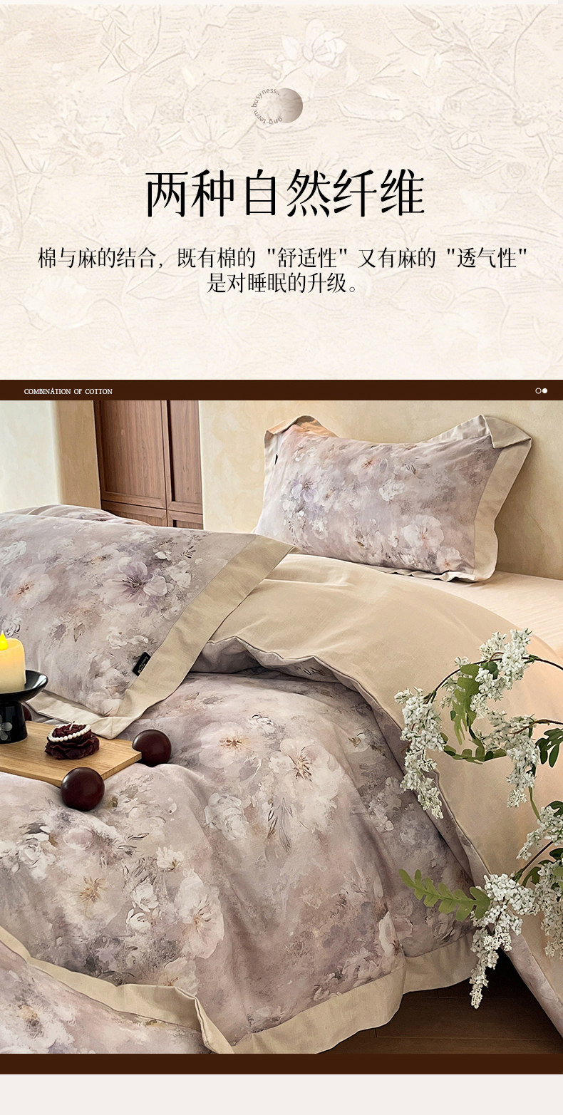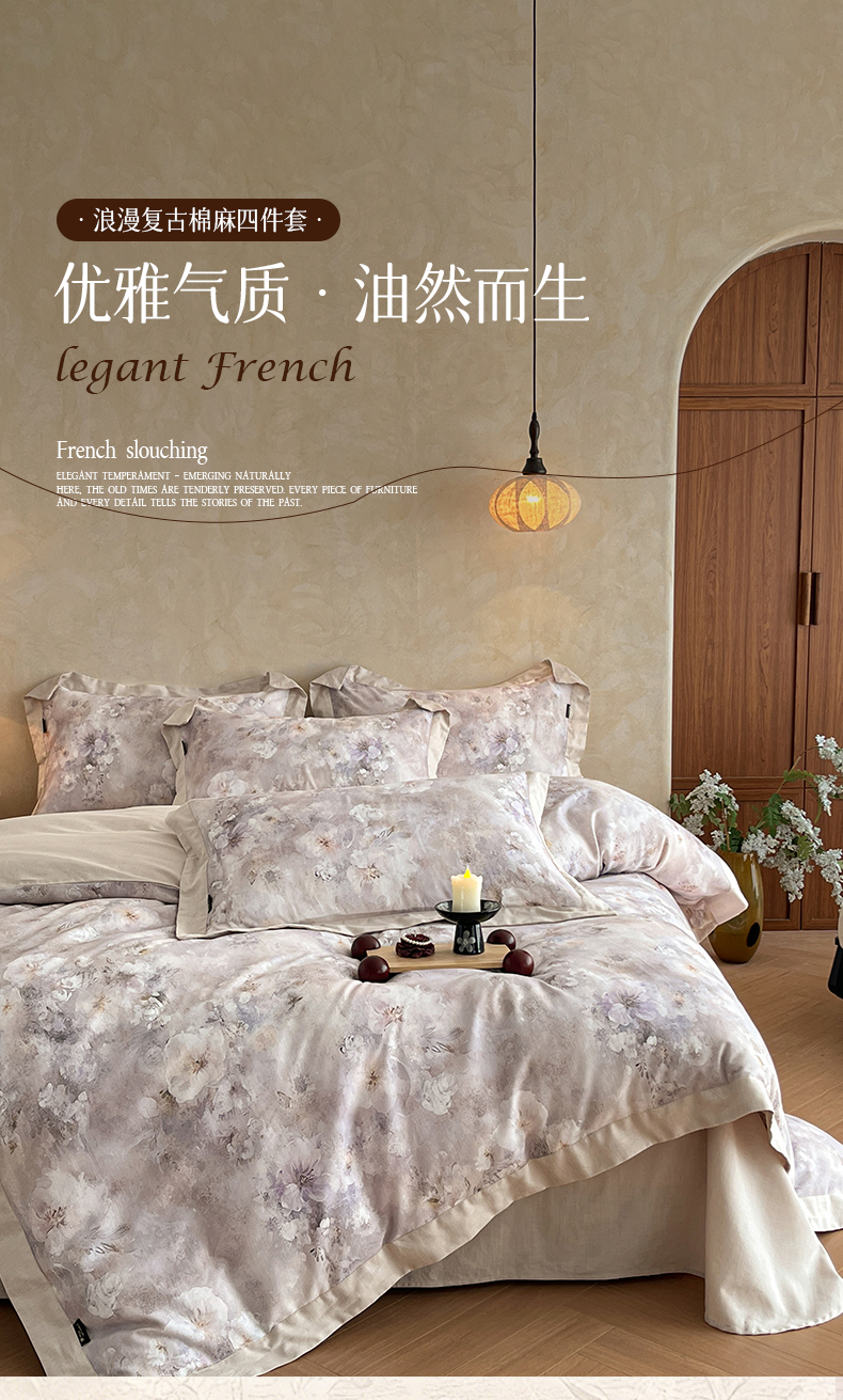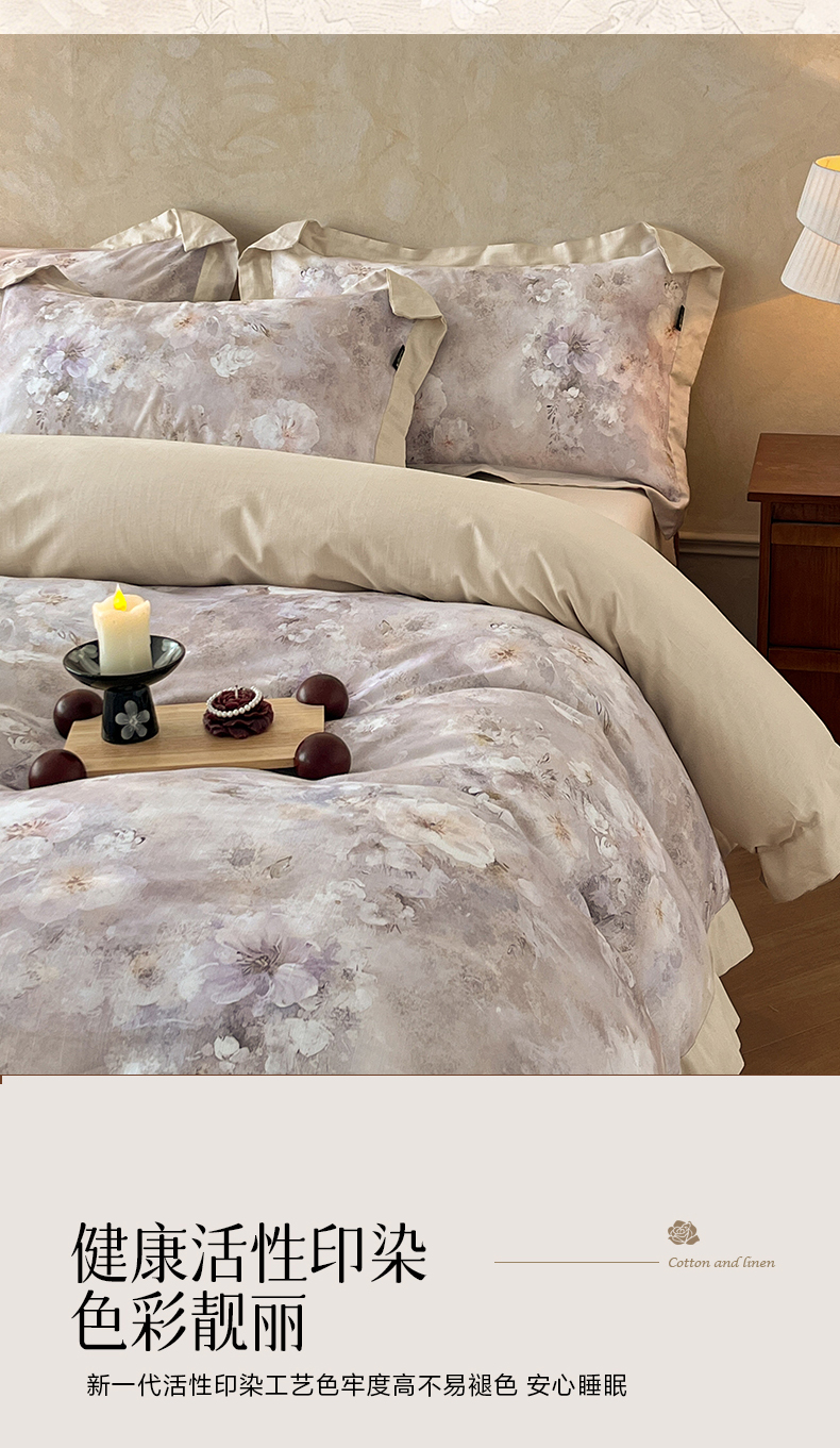 (总)金昱纺 2026新款拼角工艺款数码印花棉麻四件套,薇光-兰,布拉格-兰,辰梦-绿,恋恋时光-紫,梦幻巴黎-灰,岁晚-咖,万川-咖,叶璃-咖