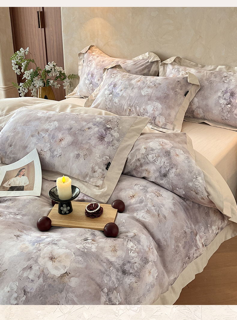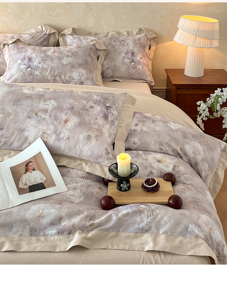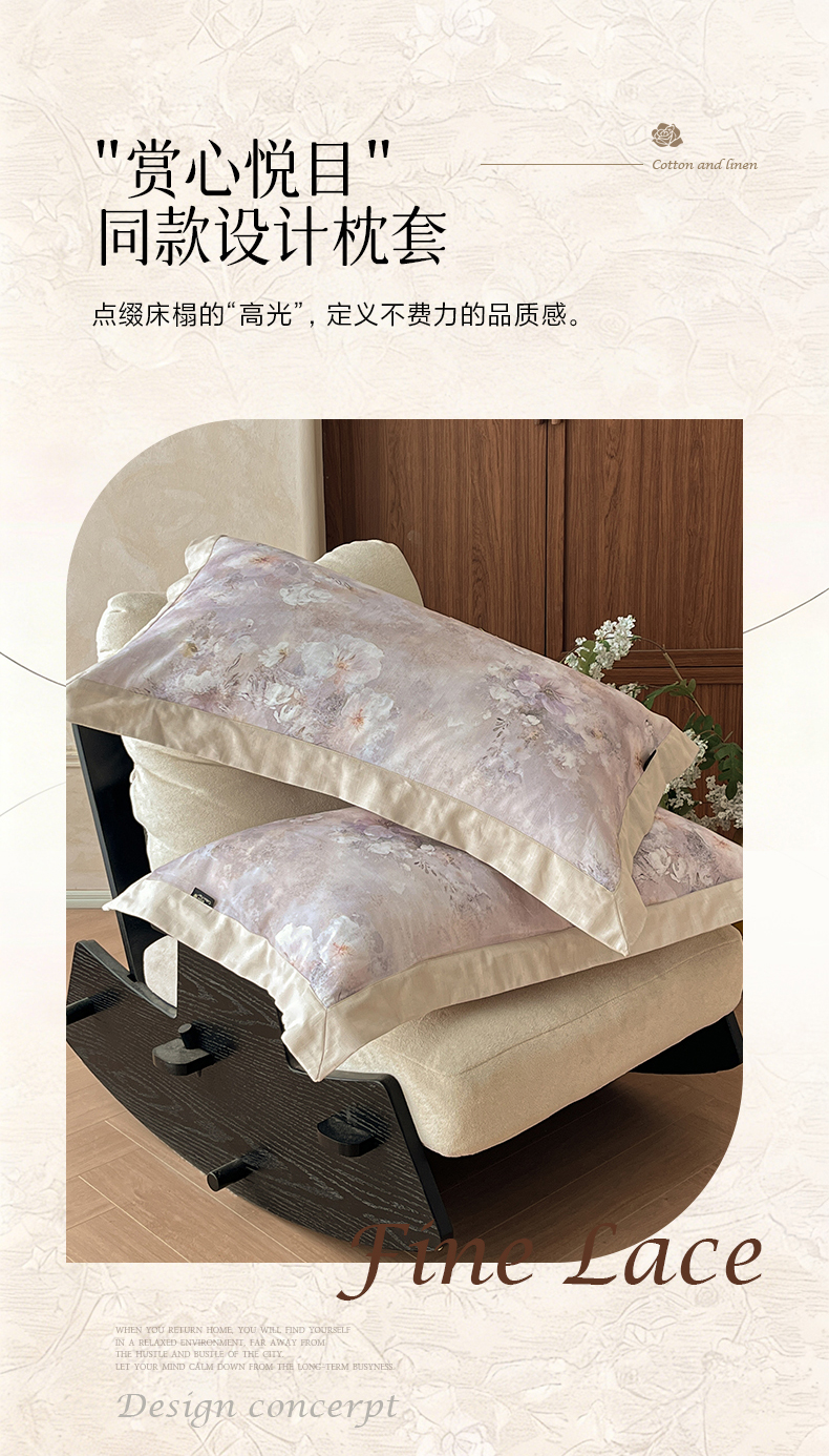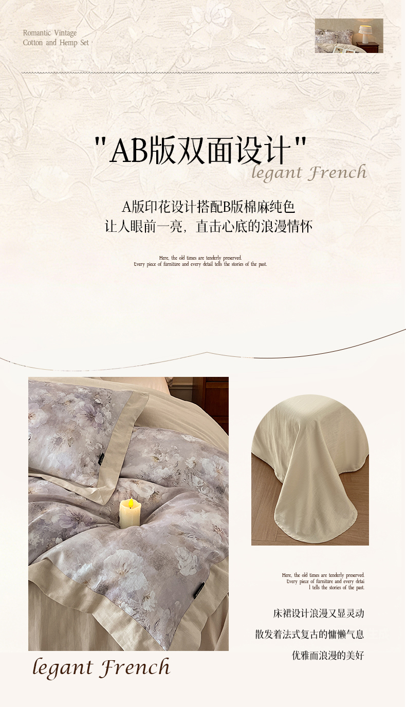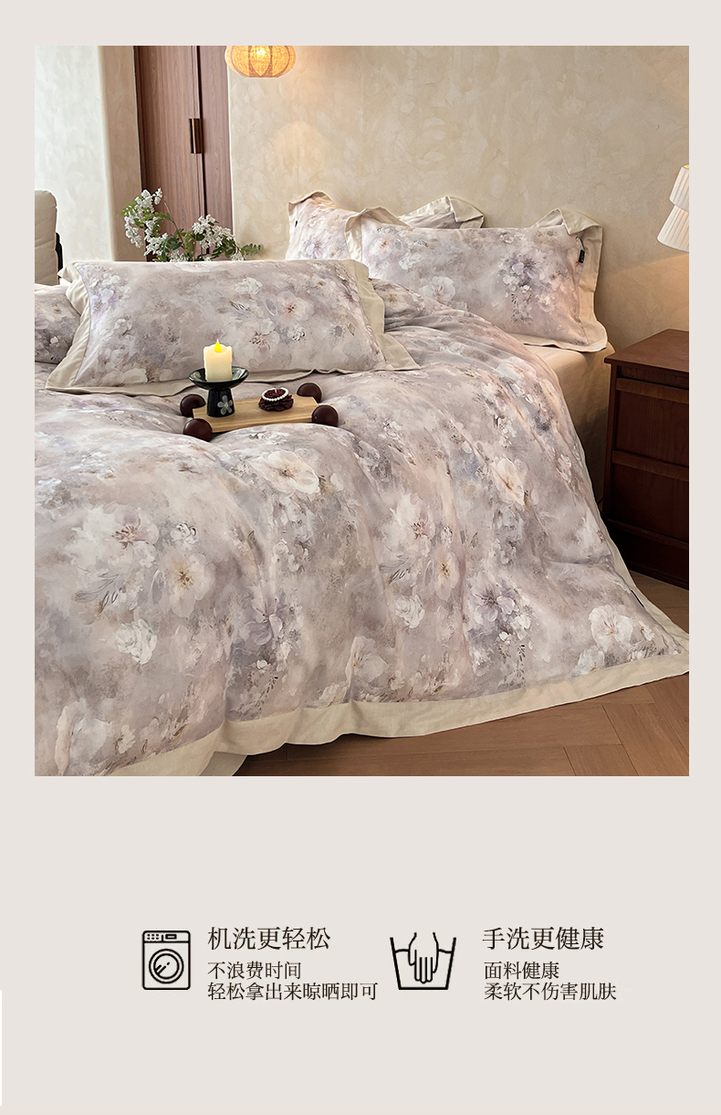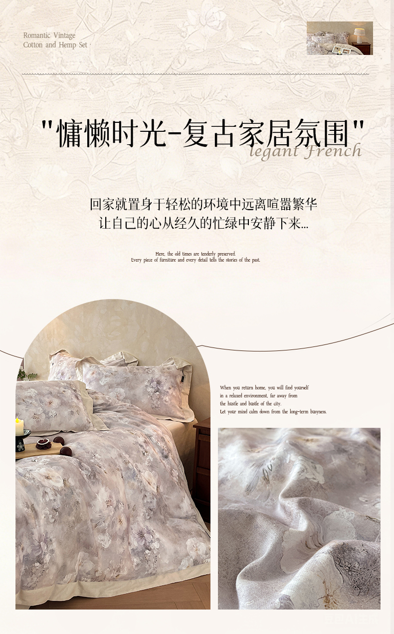 (总)金昱纺 2026新款拼角工艺款数码印花棉麻四件套,薇光-兰,布拉格-兰,辰梦-绿,恋恋时光-紫,梦幻巴黎-灰,岁晚-咖,万川-咖,叶璃-咖