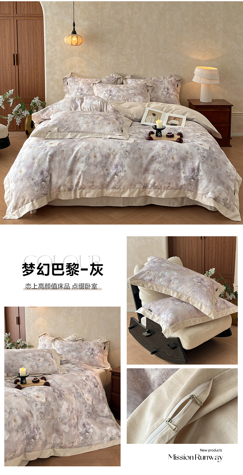 商品名称:金昱纺 2026新款拼角工艺款数码印花棉麻四件套 梦幻巴黎-灰