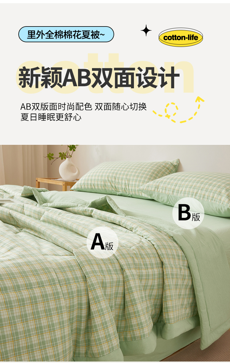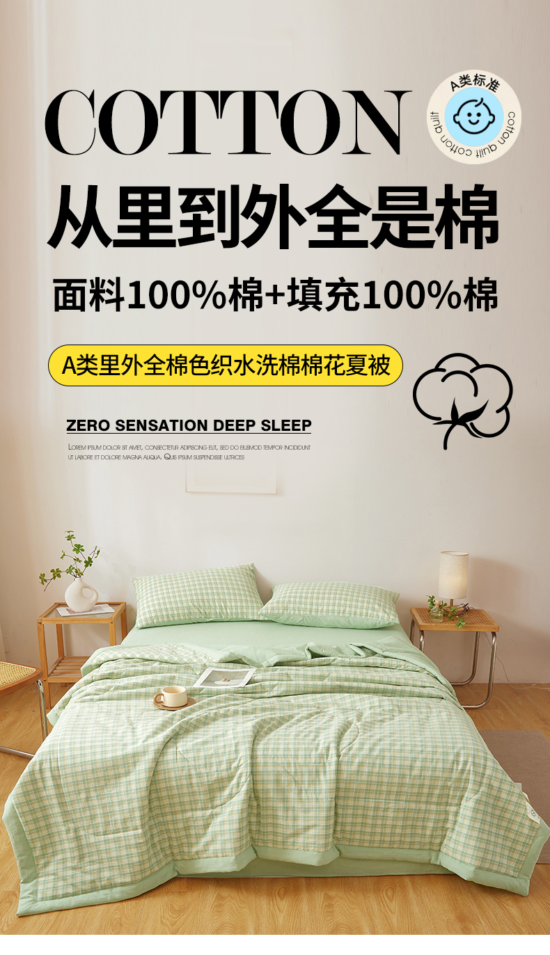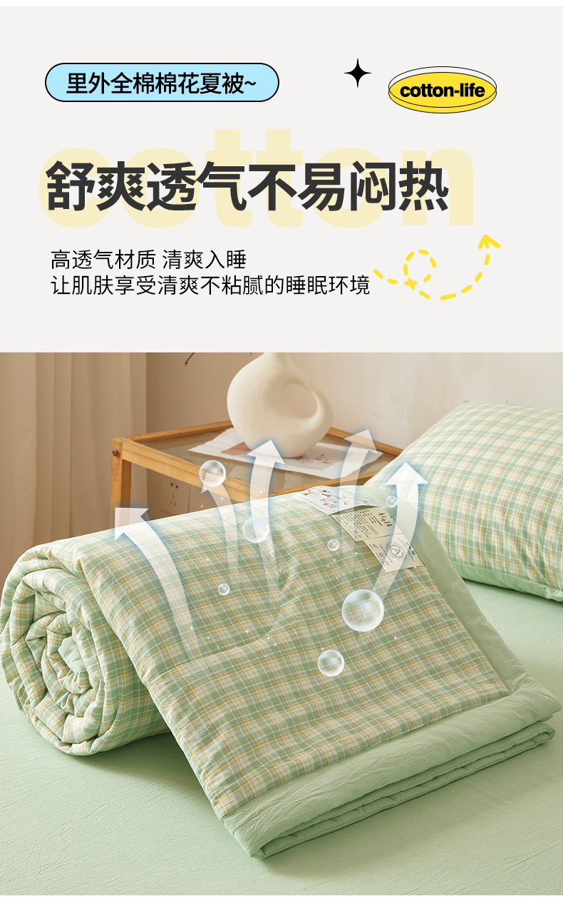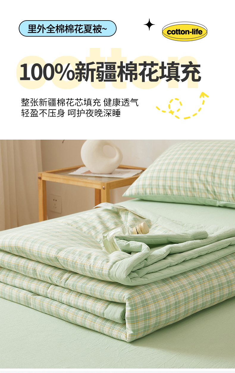 2026新款A类里外全棉夏凉被100%新疆棉纯棉全棉填充无印格子款空调被全棉夏被 里外全棉-彩绿格