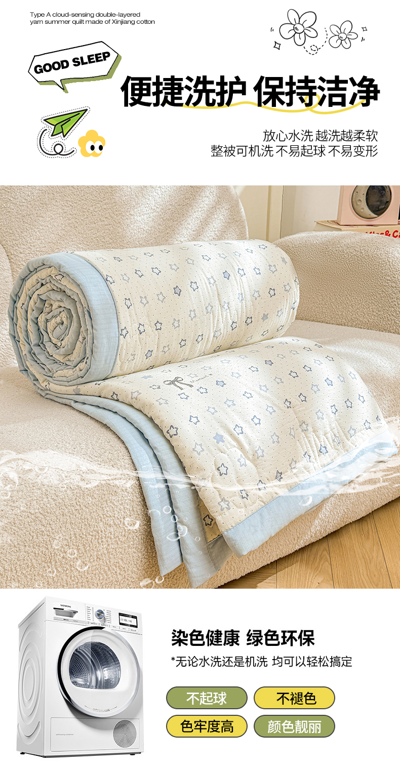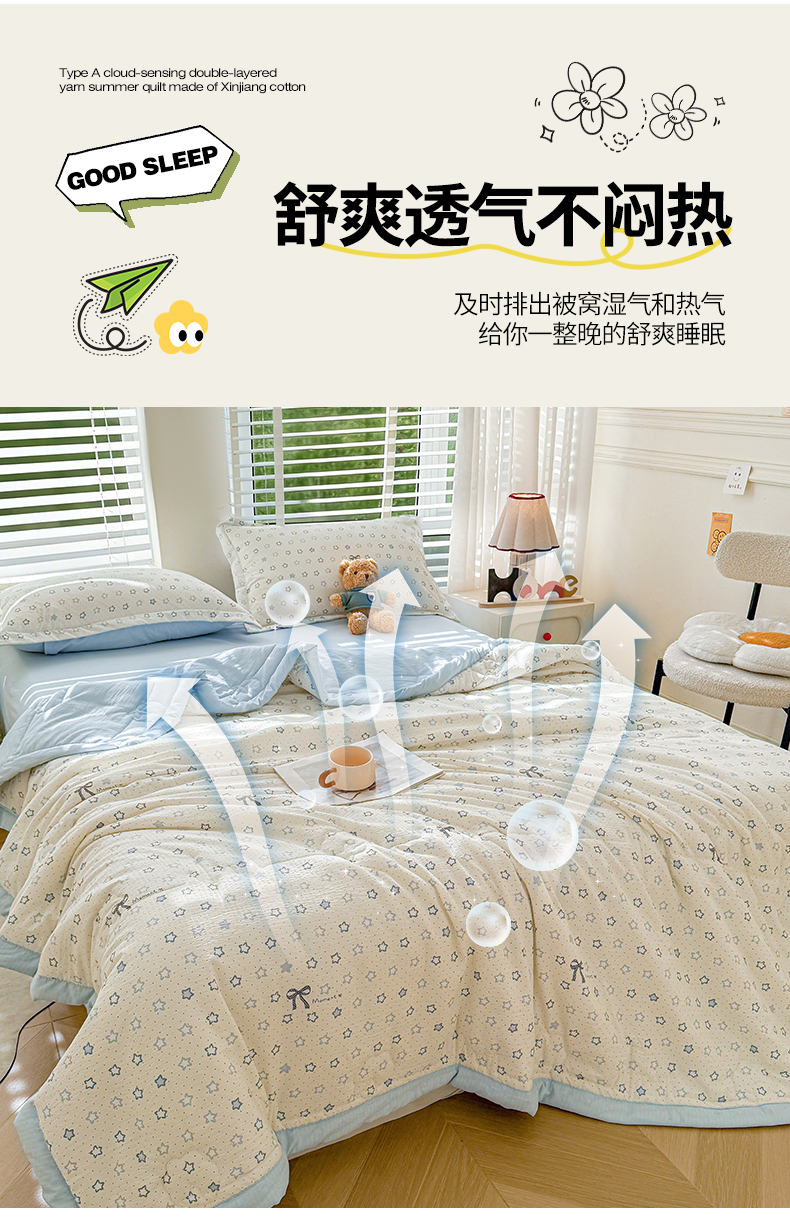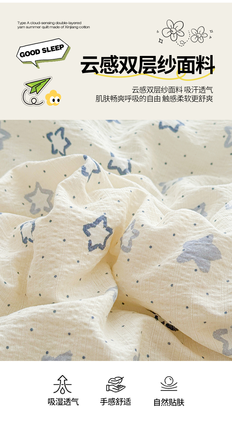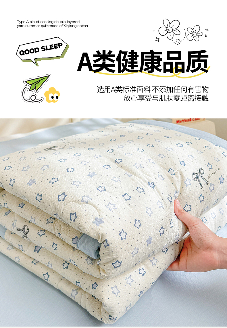 商品名称:2026新款A类新疆棉花夏凉被加宽包边水洗棉卡通印花吸湿透气棉花夏被空调被 云感星星