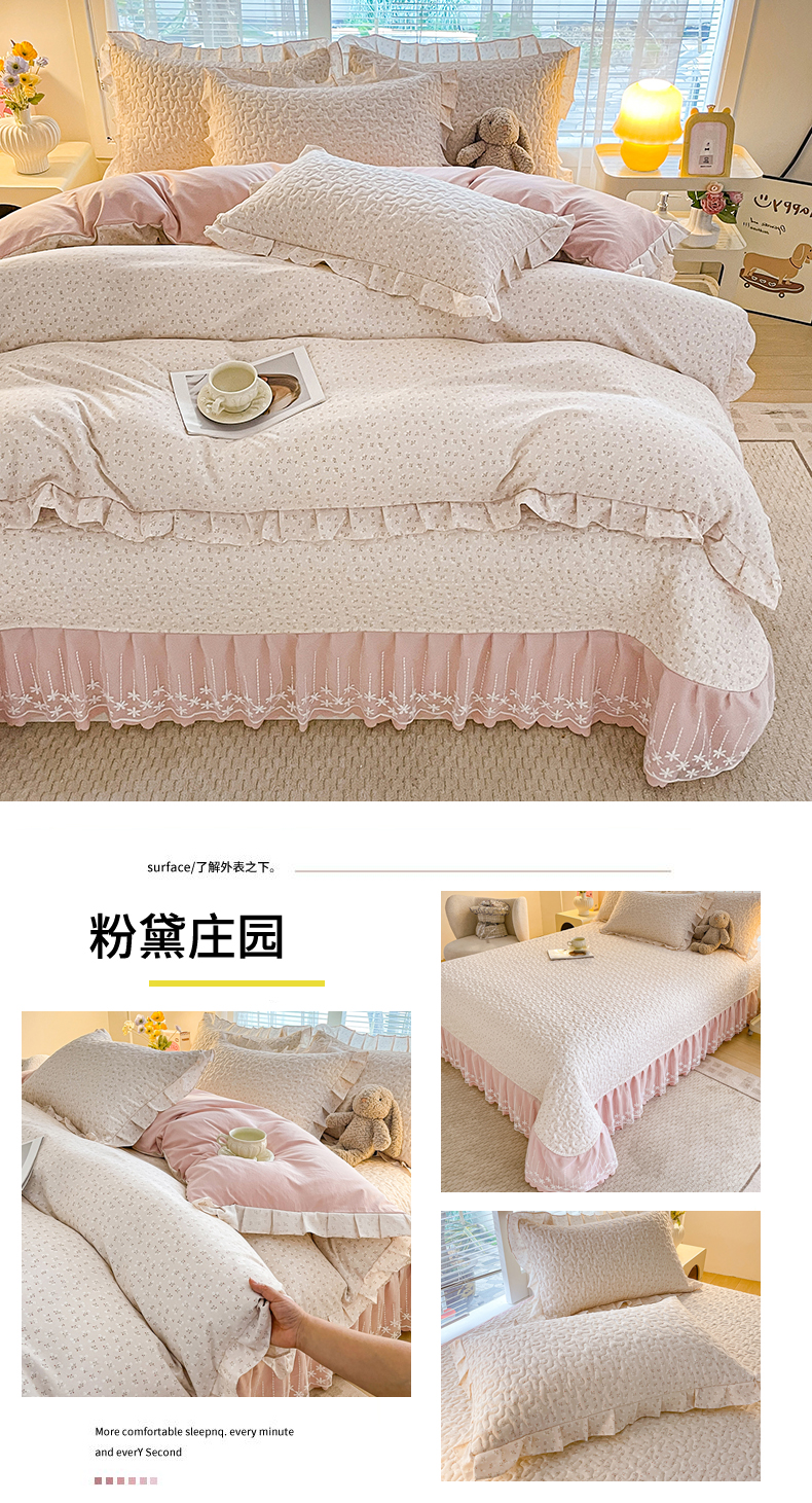 当前位置: 91家纺网 > 商品网购 > 床品套件 > 四件套 > 其它四件套 > 艺慕家纺 2026新款直播热款古法仿棉水洗棉印花双层蕾丝花边床盖四件套 粉黛庄园