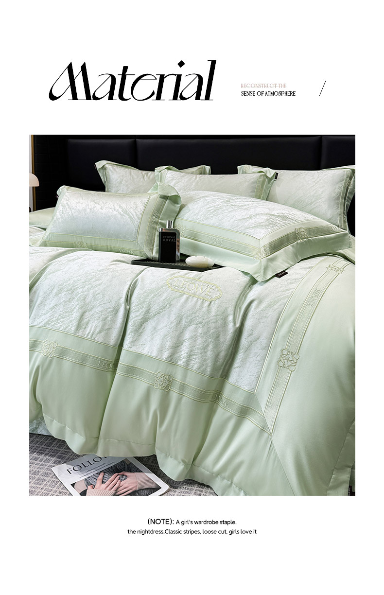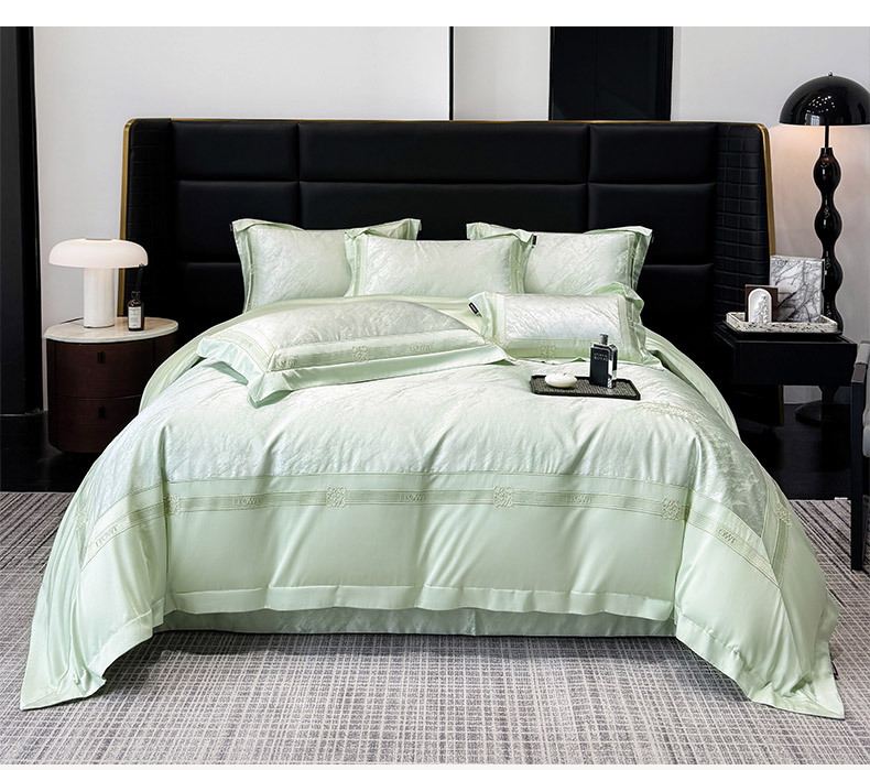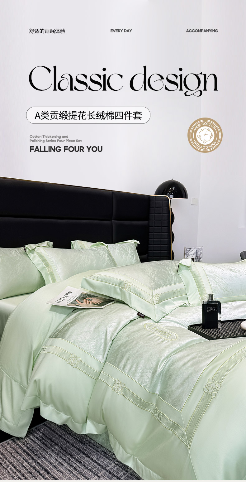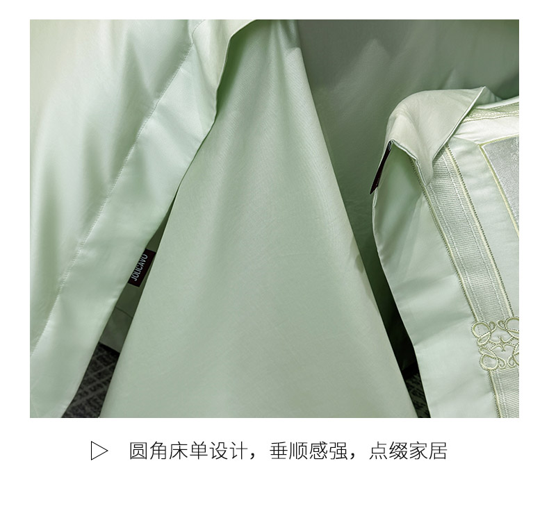 当前位置: 91家纺网 > 商品网购 > 床品套件 > 四件套 > 长绒棉四件套 > 爱妮菲家纺 2026春夏新品高端A类贡缎提花长绒棉纯棉四件套100全棉提花被套床单床笠高级感床上用品-慕笙 慕笙-浅松绿