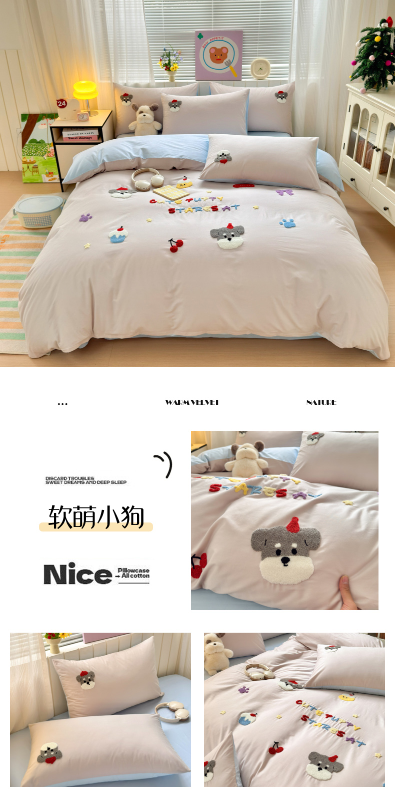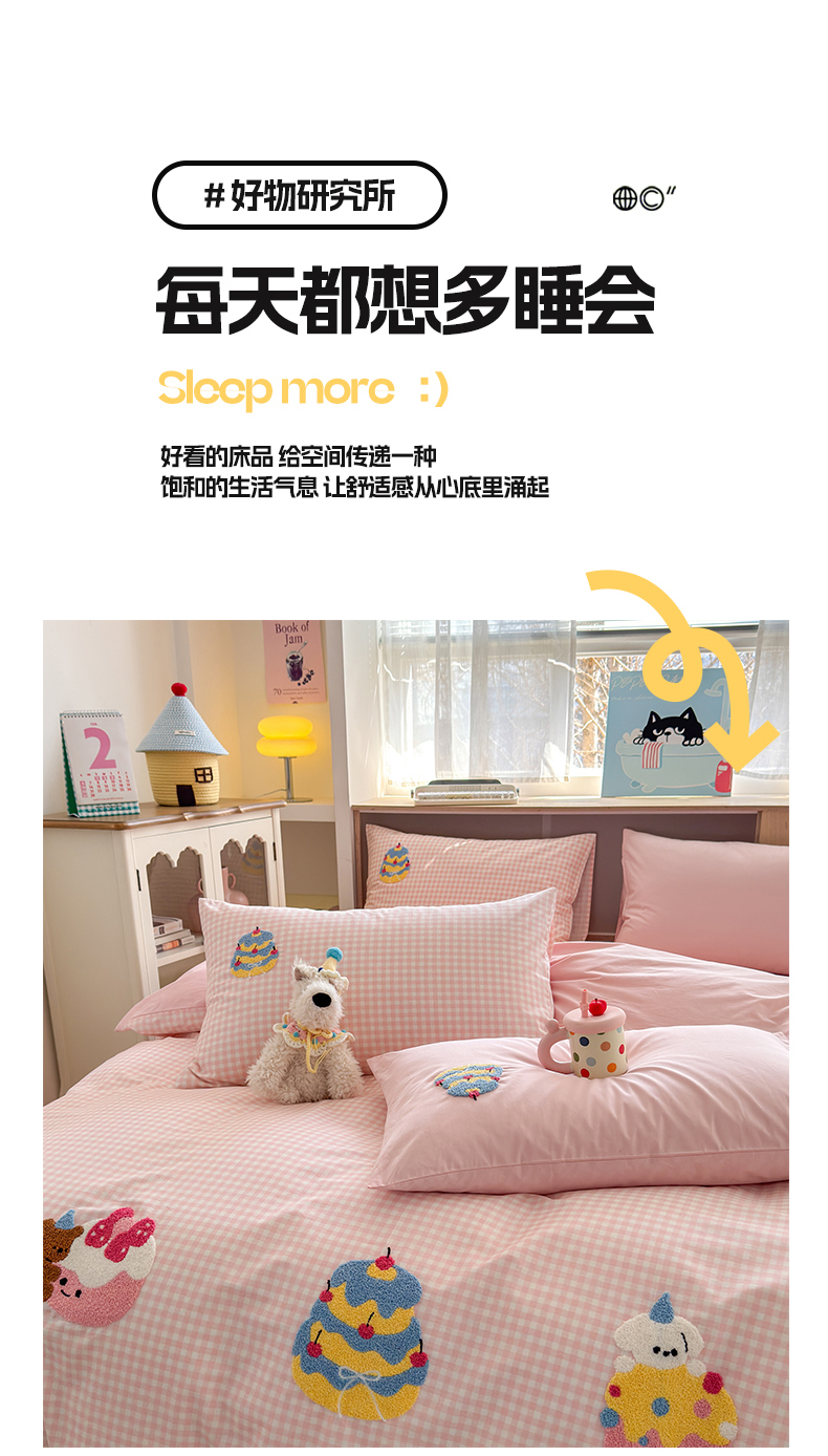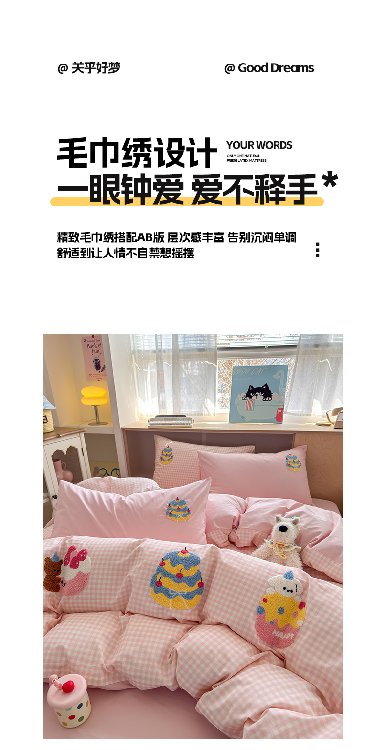 (总)如意朵 2026新款超柔高密全棉小清新绣花四件套(专版花型),喜乐萌狗,番茄萌喵,粉格萌喵,礼物狗狗,摩卡萌喵,甜点萌狗,甜睡小兔,幸运喵喵,招财萌喵