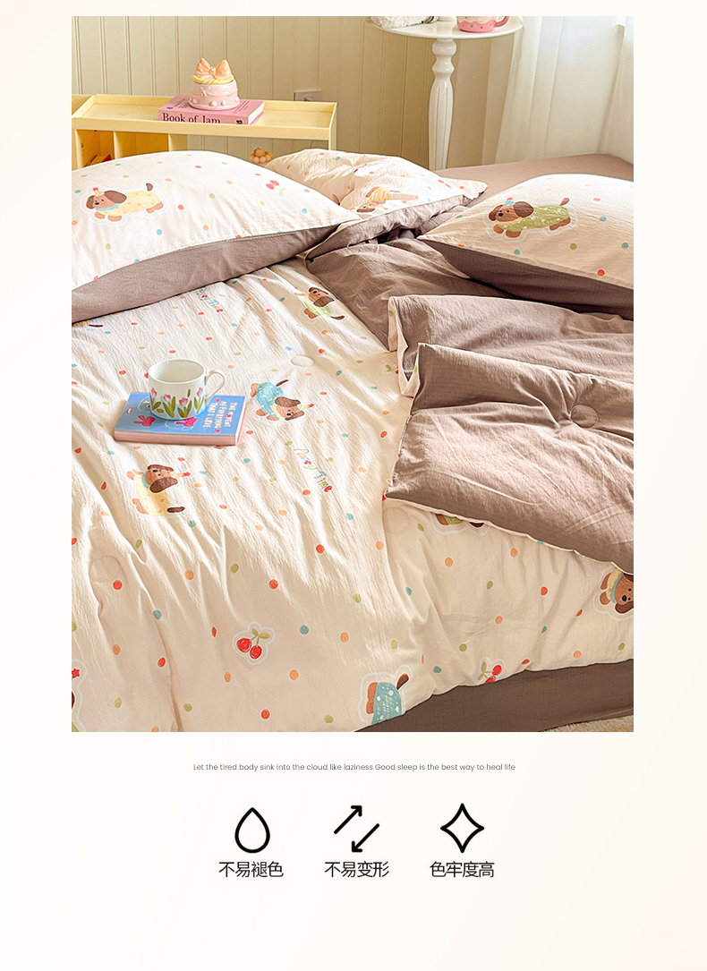 • 91家纺网 家纺一手货源 找家纺 盛秋家纺 2026新款皱皱纱印花夏被-萝拉 派对狗+深咖
