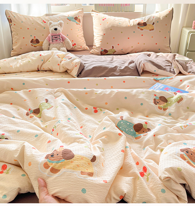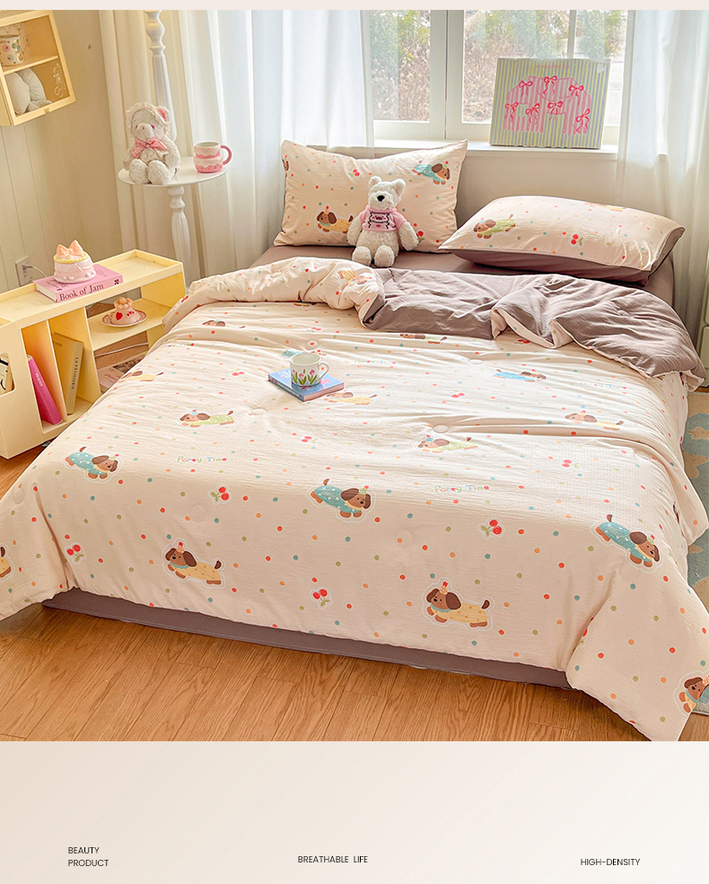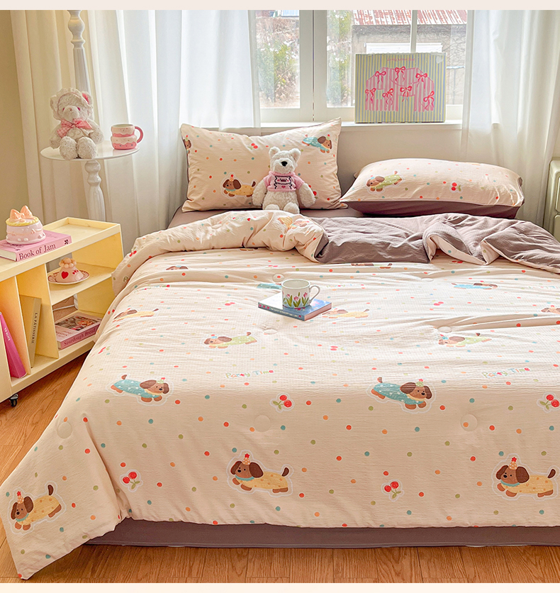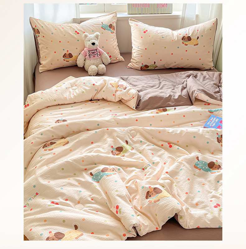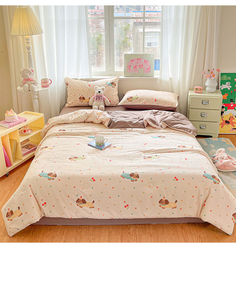 盛秋家纺 2026新款皱皱纱印花夏被-萝拉 派对狗+深咖