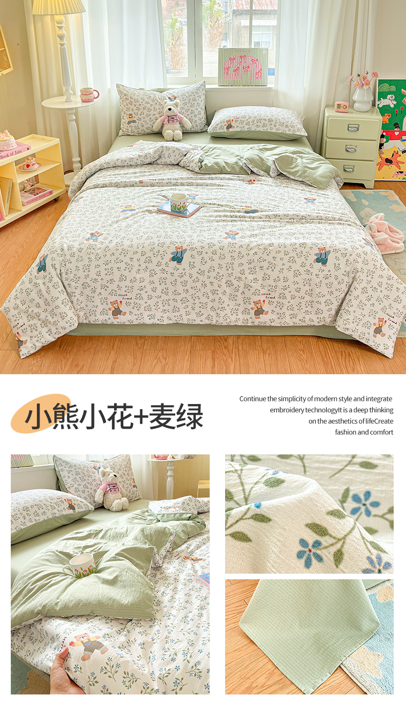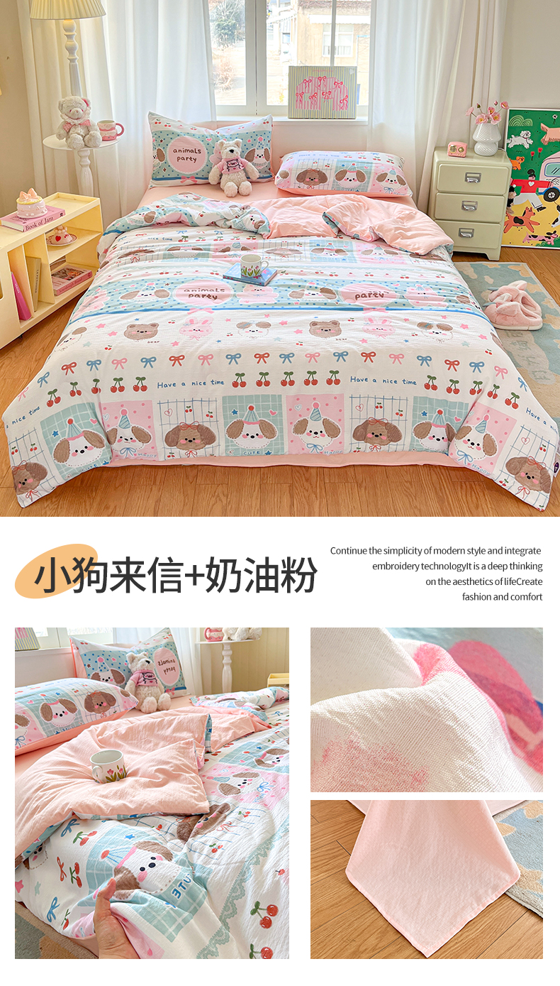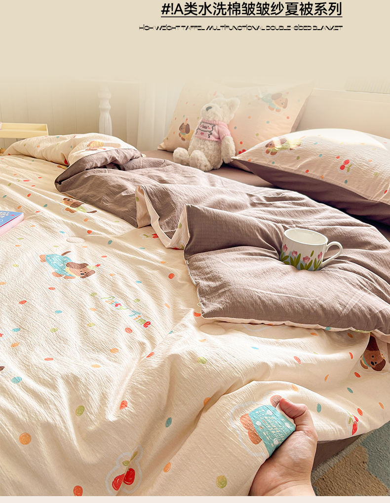 (总)盛秋家纺 2026新款皱皱纱印花夏被-萝拉,生日派对+清新绿,格子花园+奶油粉,格子铺粉+天空蓝,花丛小熊+奶油粉,可可颂蓝+天空蓝,恐龙游记+天空蓝,快乐时光+深咖,麻薯团+米驼,派对狗+深咖,森林小象+奶油粉,小狗来信+奶油粉,小伙伴+米驼,小熊小花+麦绿,修勾咖+米驼