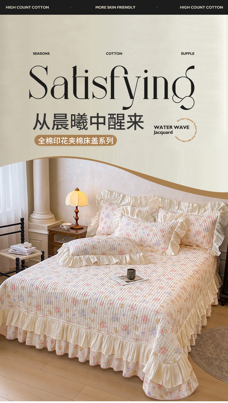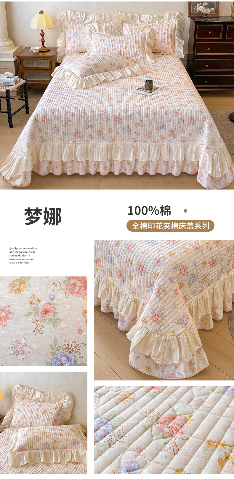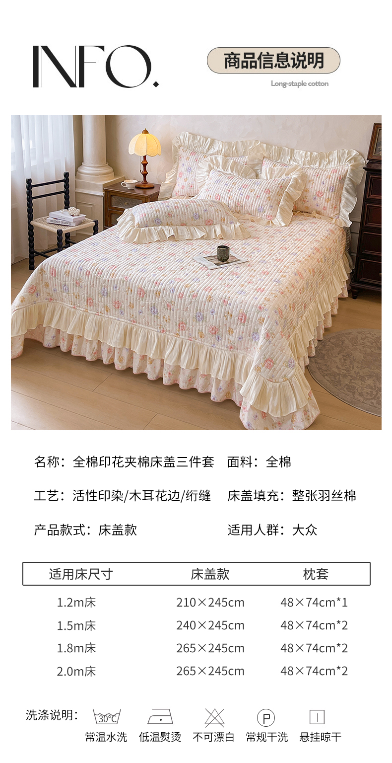 当前位置: 91家纺网 > 商品网购 > 床品套件 > 三件套 > 宜凡家纺 2026新款全棉印花公主风夹棉床盖三件套 梦娜