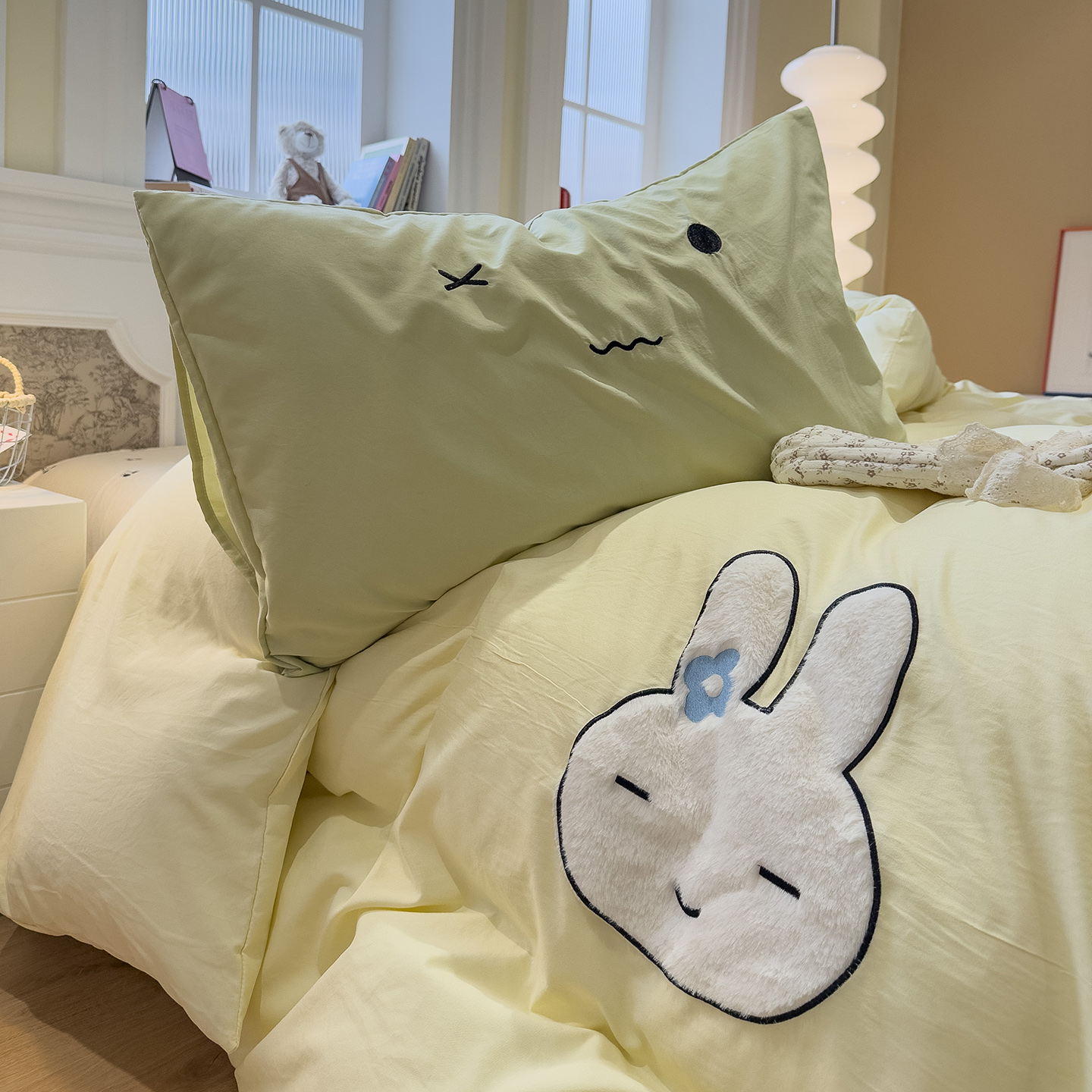 曼谷 新款毛巾绣四件套ins煤球图案柔软磨毛水洗棉套件 煤球-芝士绿,煤球-芝士绿
