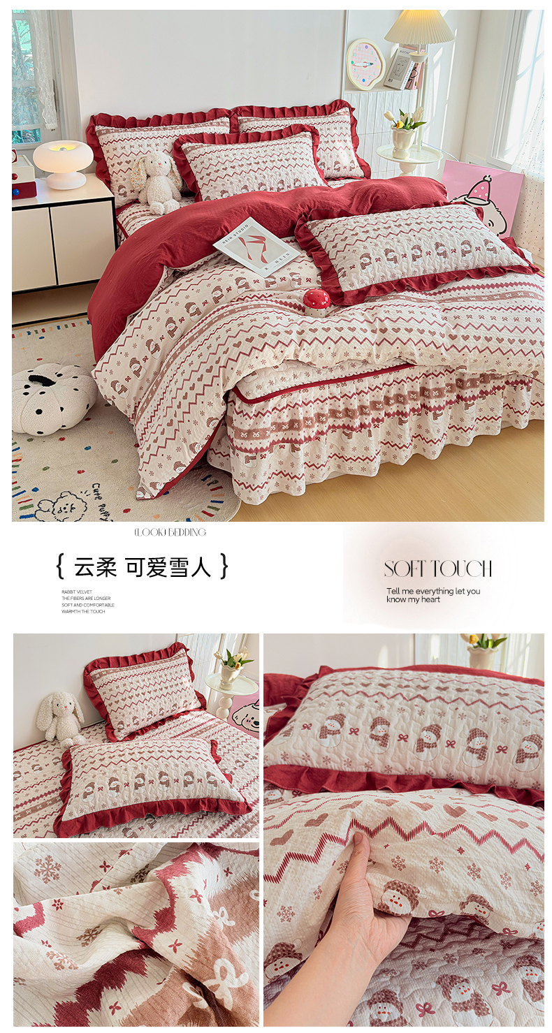 铠畅 2026新款泡芙纱皱皱棉床裙款四件套 云柔 可爱雪人