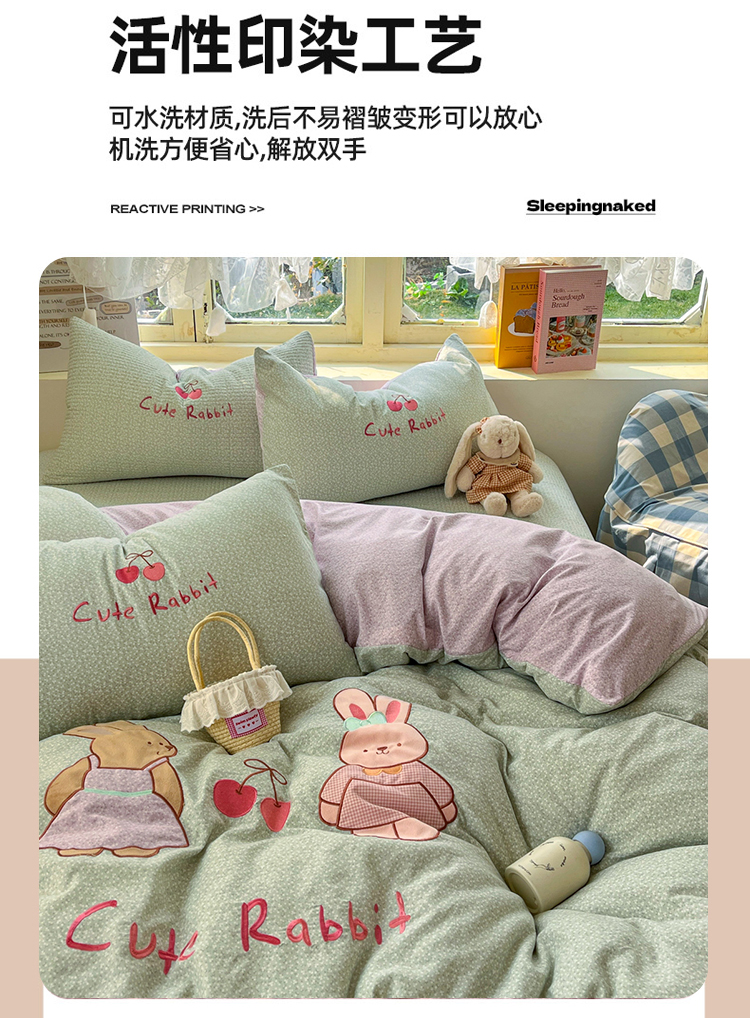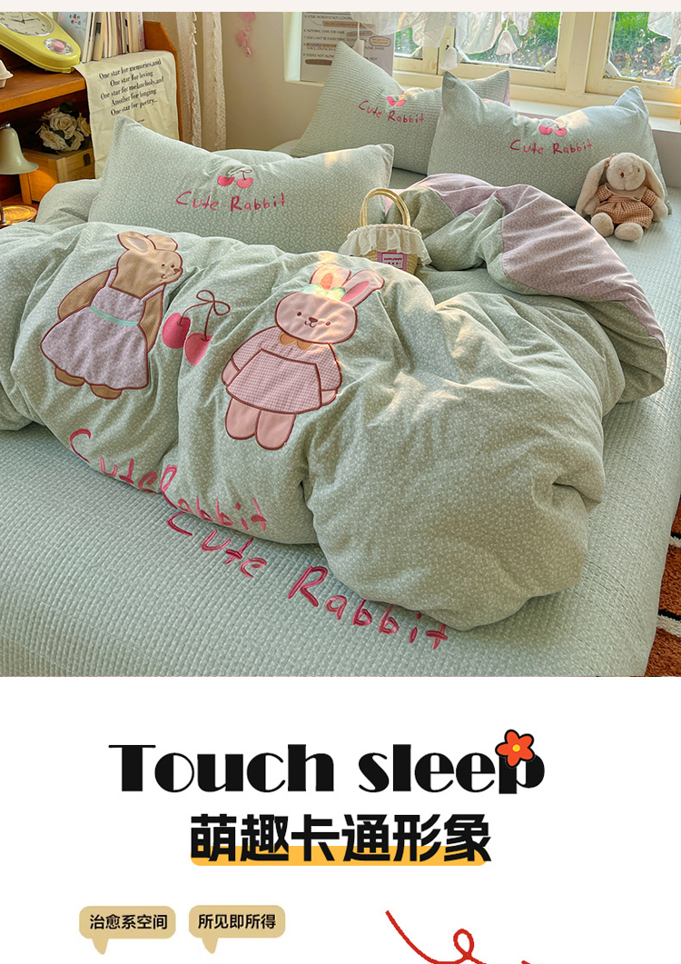 • 91家纺网 家纺一手货源 找家纺 萌飞 2026直播热款贴布绣加厚仿棉古法水洗棉夹棉床盖 萌萌兔绿