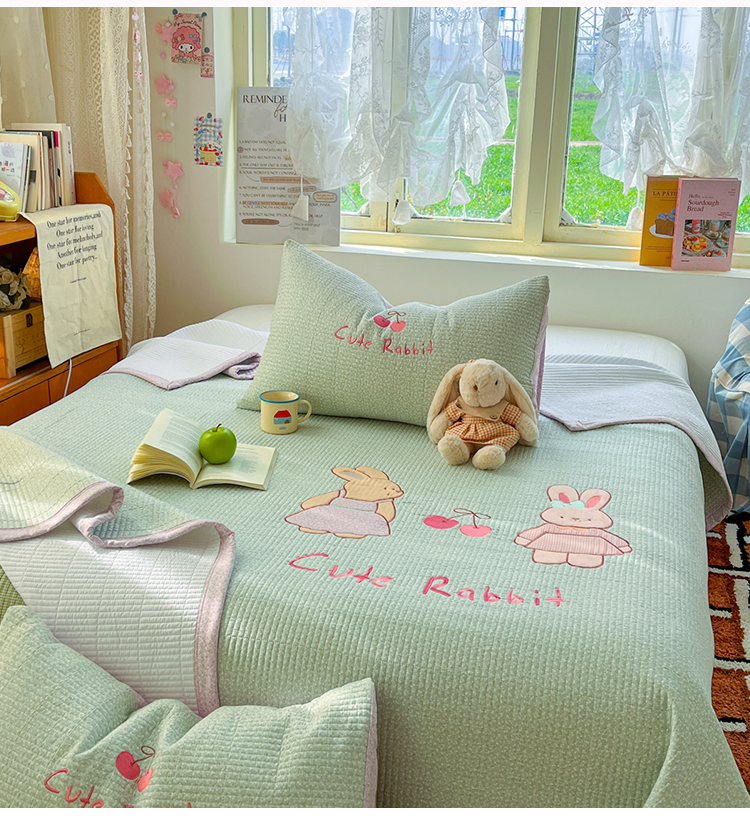 萌飞 2026直播热款贴布绣加厚仿棉古法水洗棉夹棉床盖 萌萌兔绿