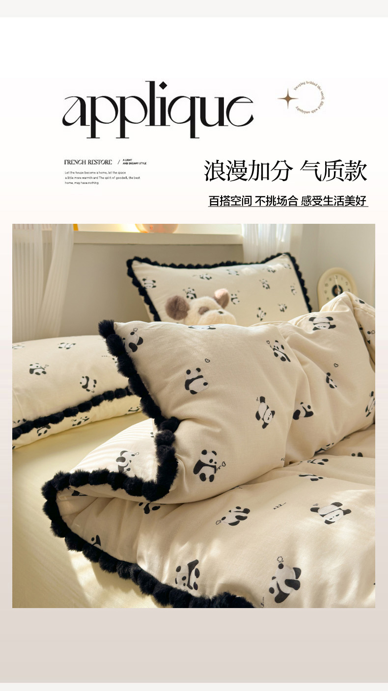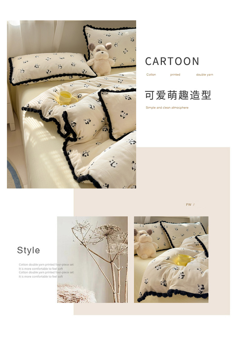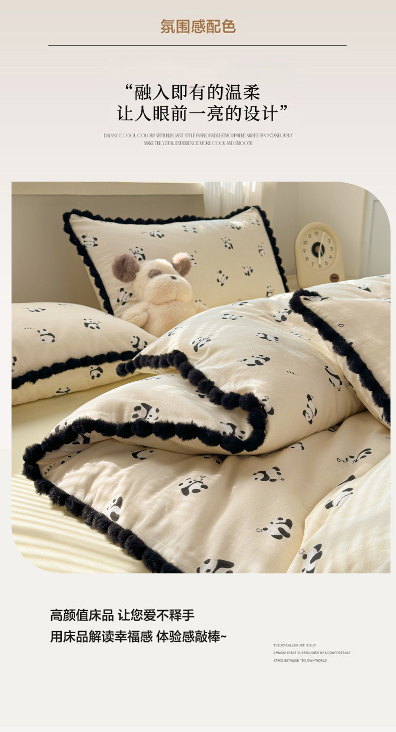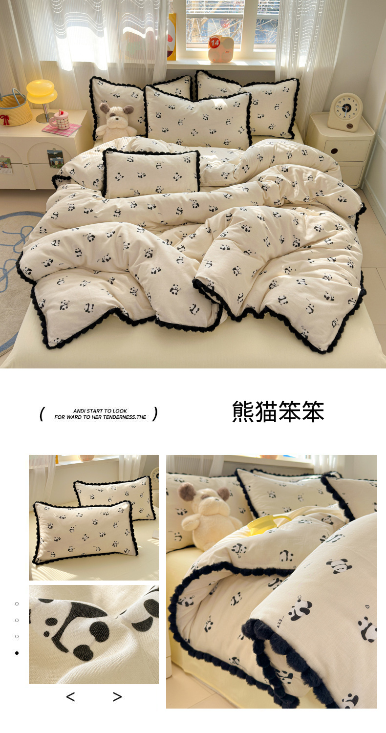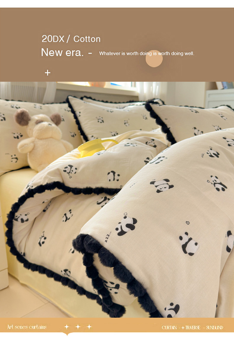 当前位置: 91家纺网 > 商品网购 > 床品套件 > 四件套 > 全棉普通四件套 > 丽涵家纺 2026新款全棉双层纱全棉纯棉大雁纹毛球花边四件套 熊猫笨笨