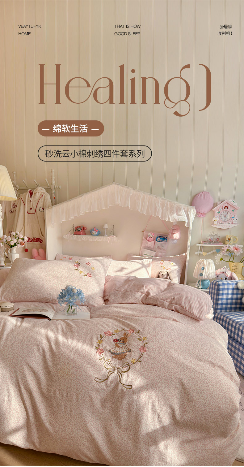 金梦拉家纺 2026春夏新款刺绣碎花仿棉水洗棉小清新系列四件套 花园兔-粽