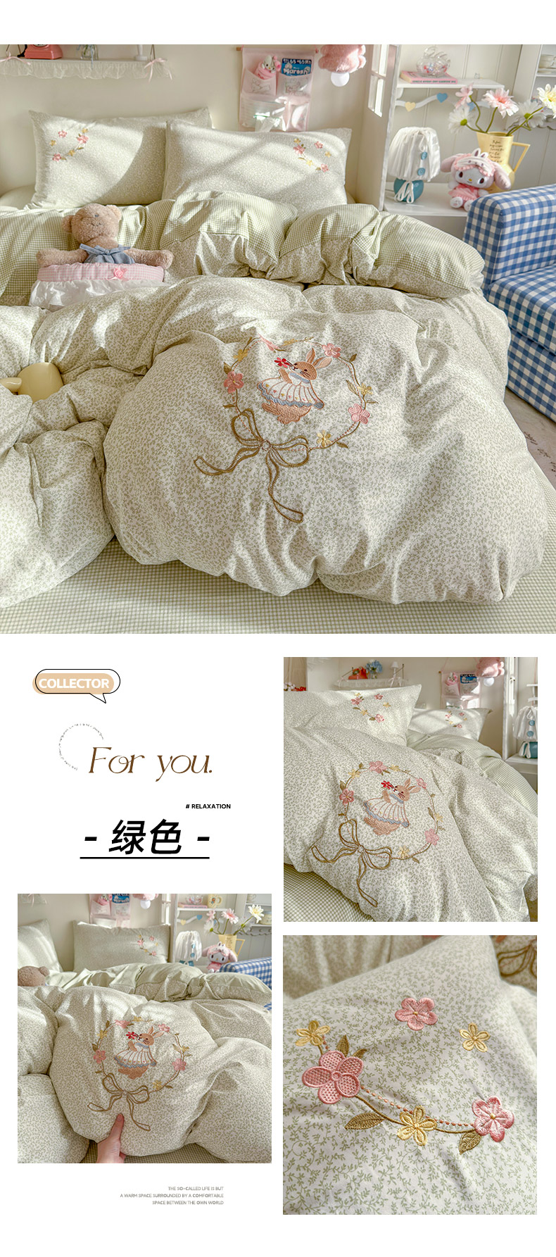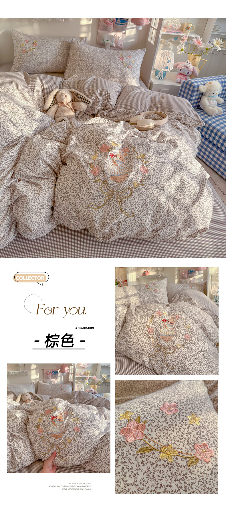 商品名称:金梦拉家纺 2026春夏新款刺绣碎花仿棉水洗棉小清新系列四件套 花园兔-粽