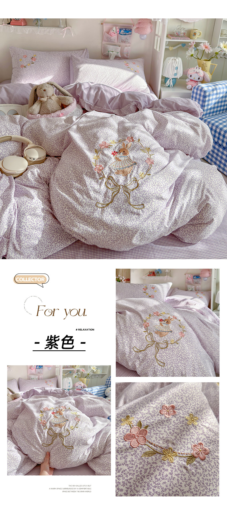 (总)金梦拉家纺 2026春夏新款刺绣碎花仿棉水洗棉小清新系列四件套,花园兔-粉,花园兔-黄,花园兔-蓝,花园兔-绿,花园兔-紫,花园兔-粽