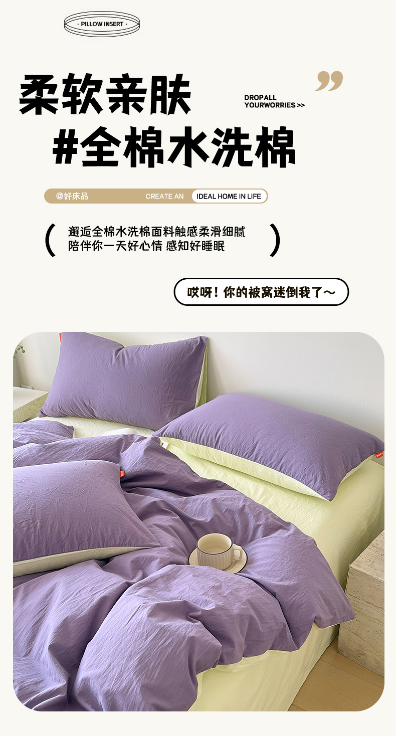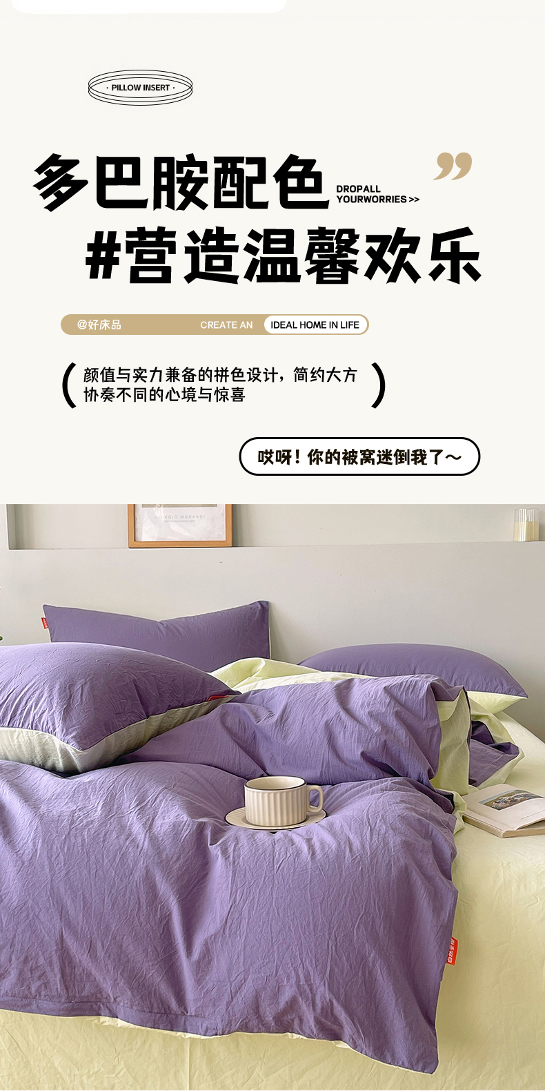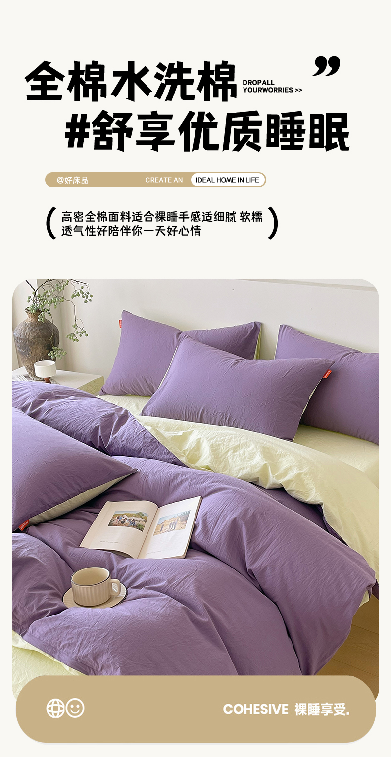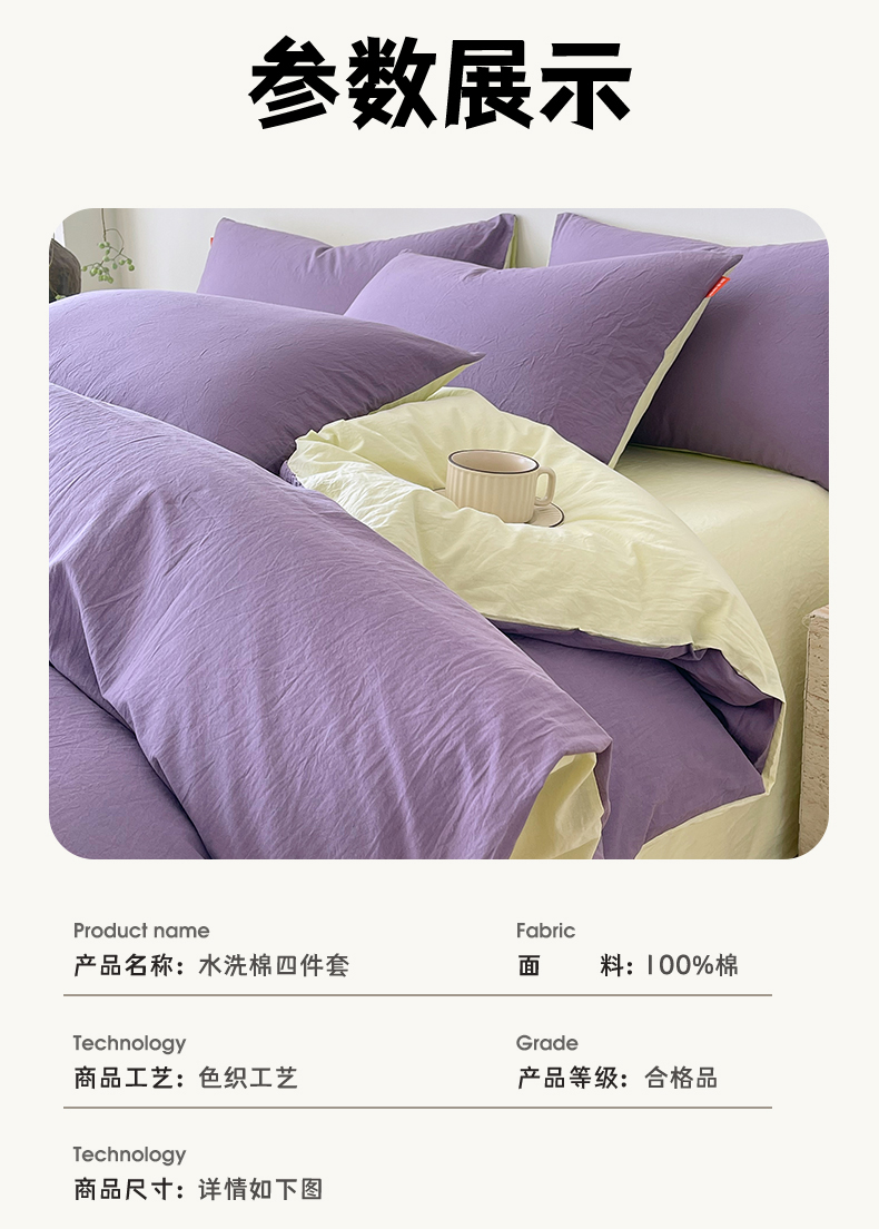 当前位置: 91家纺网 > 商品网购 > 床品套件 > 四件套 > 全棉普通四件套 > 春皖家纺 2026春夏新款双拼全棉纯棉水洗棉四件套 水晶紫-淡黄