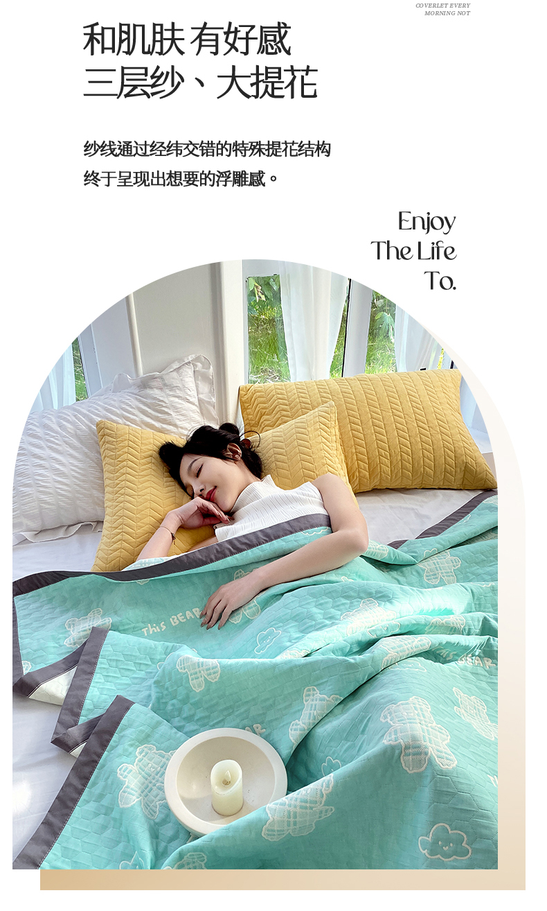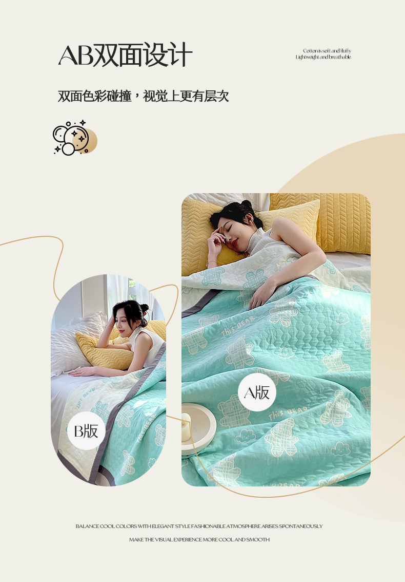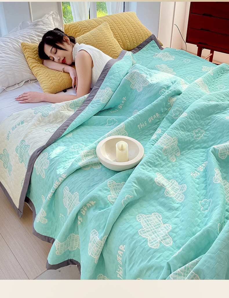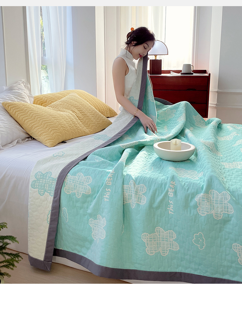 商品名称:云天家纺 2026新款A类全棉三层纱多功能毛巾被(盖毯床单夏被) 云朵小熊-绿