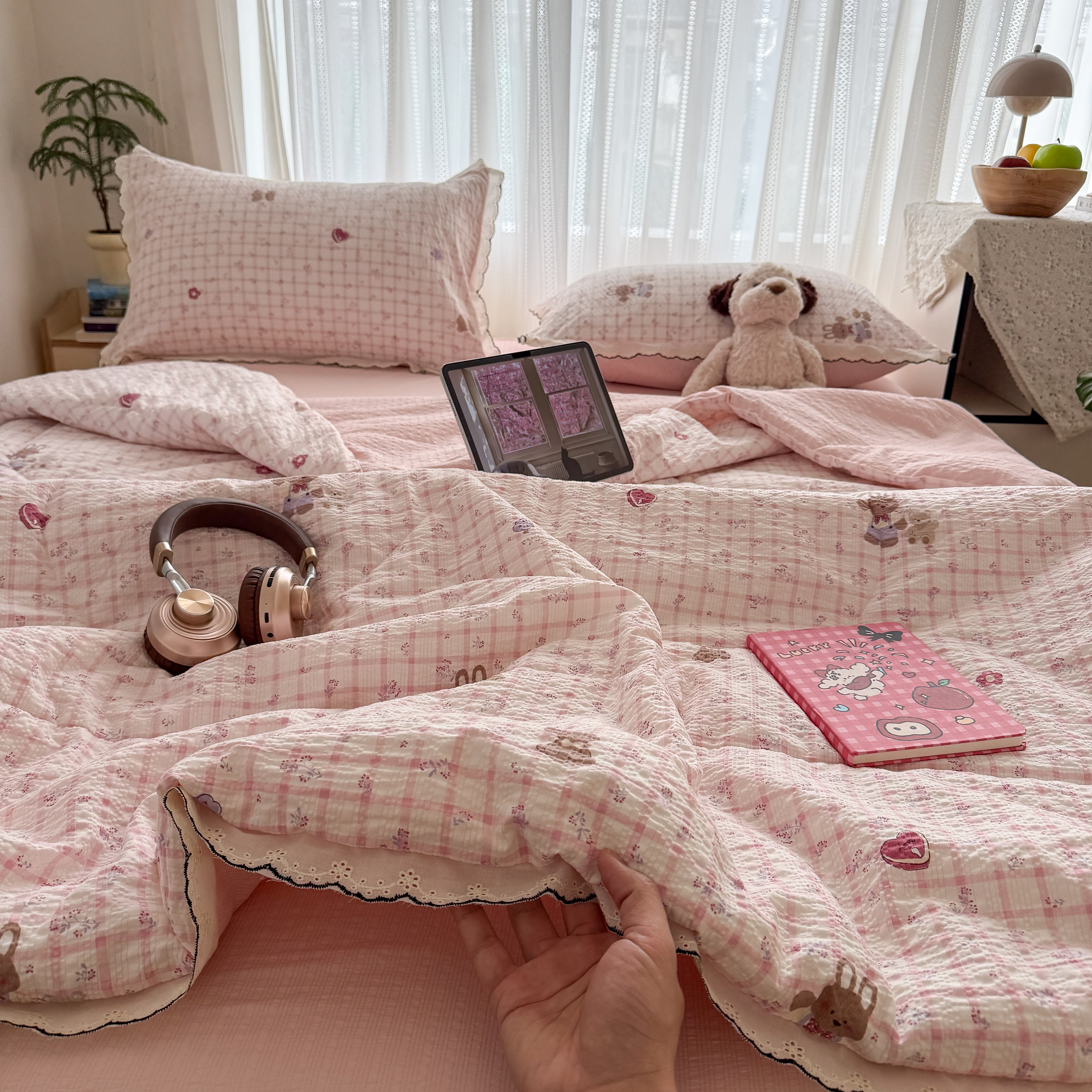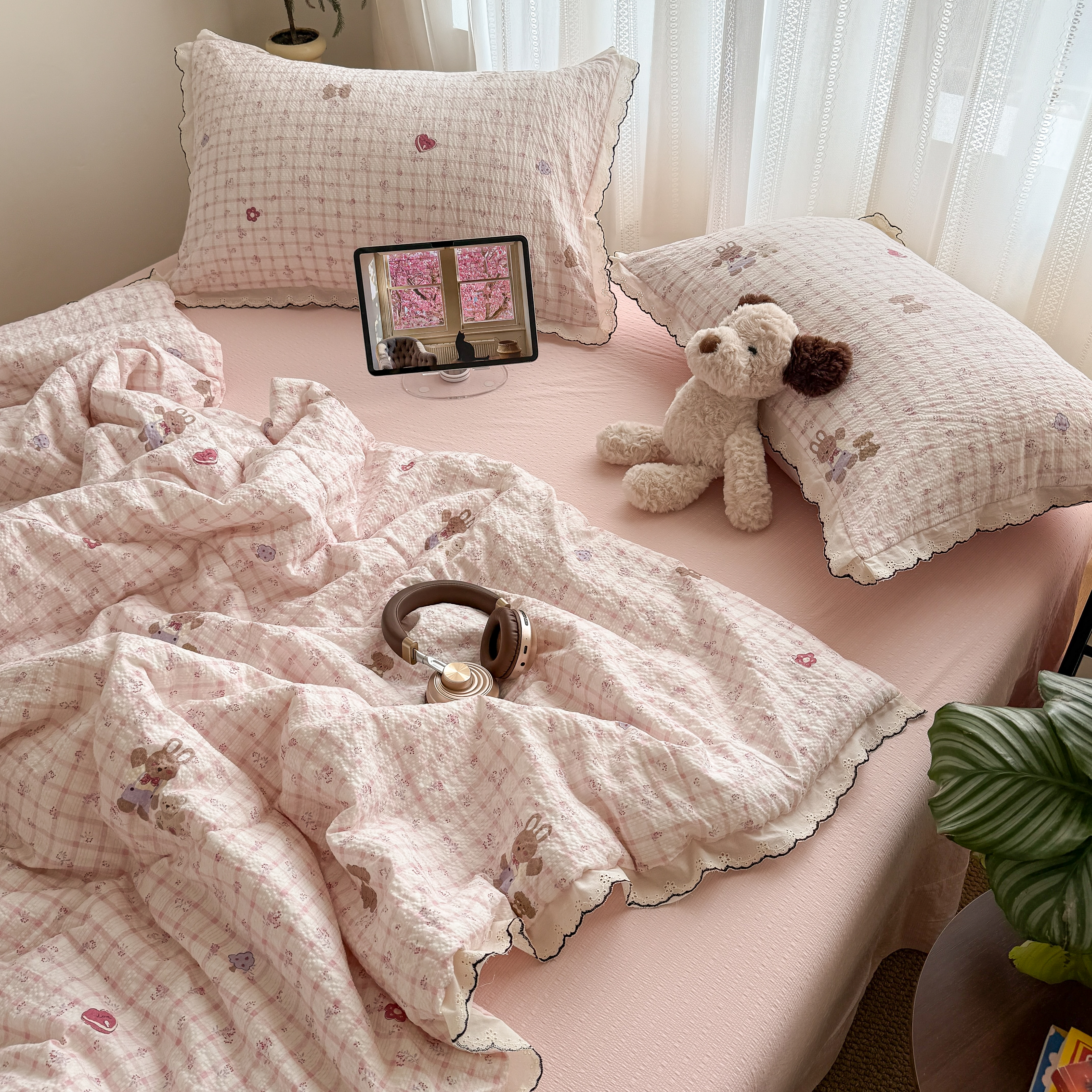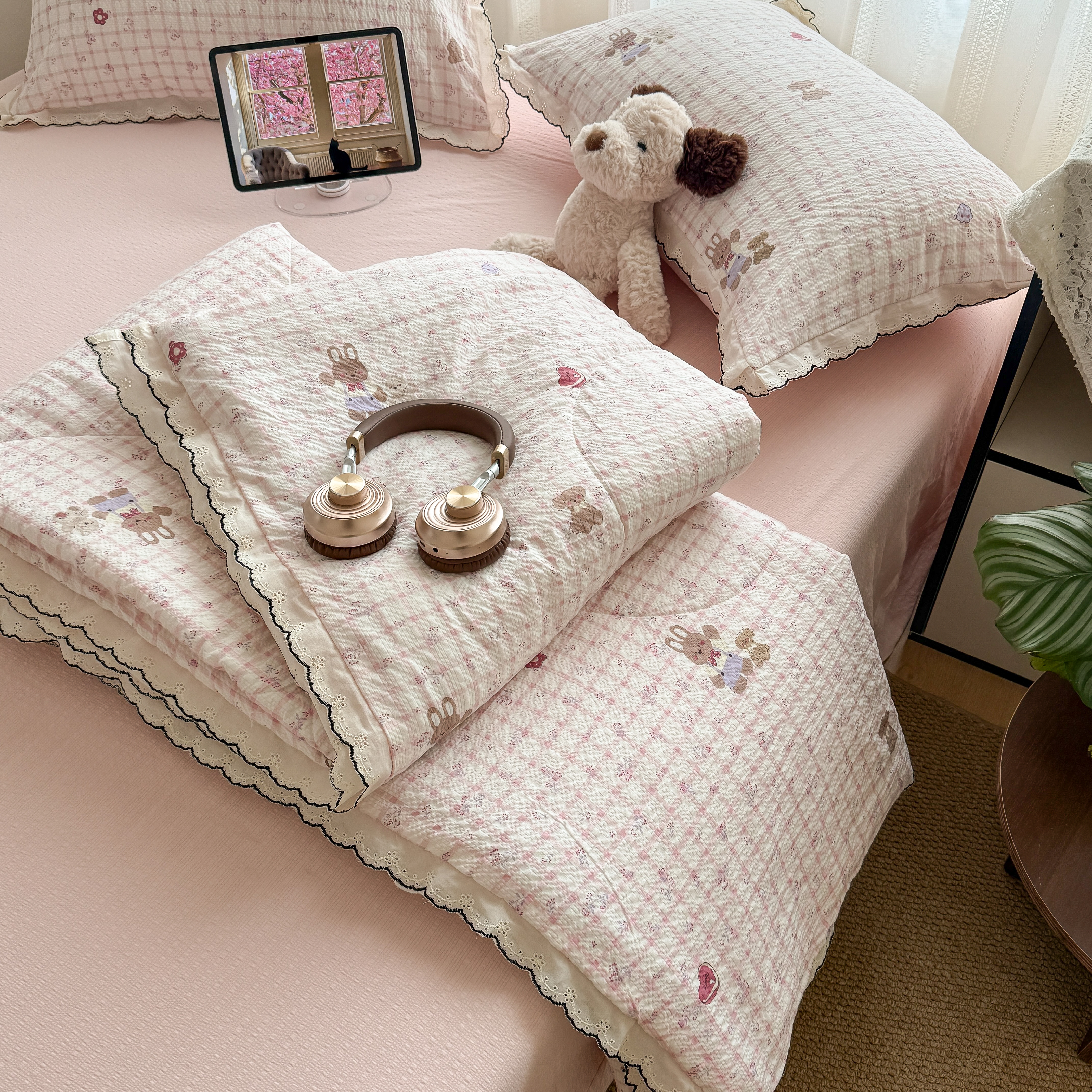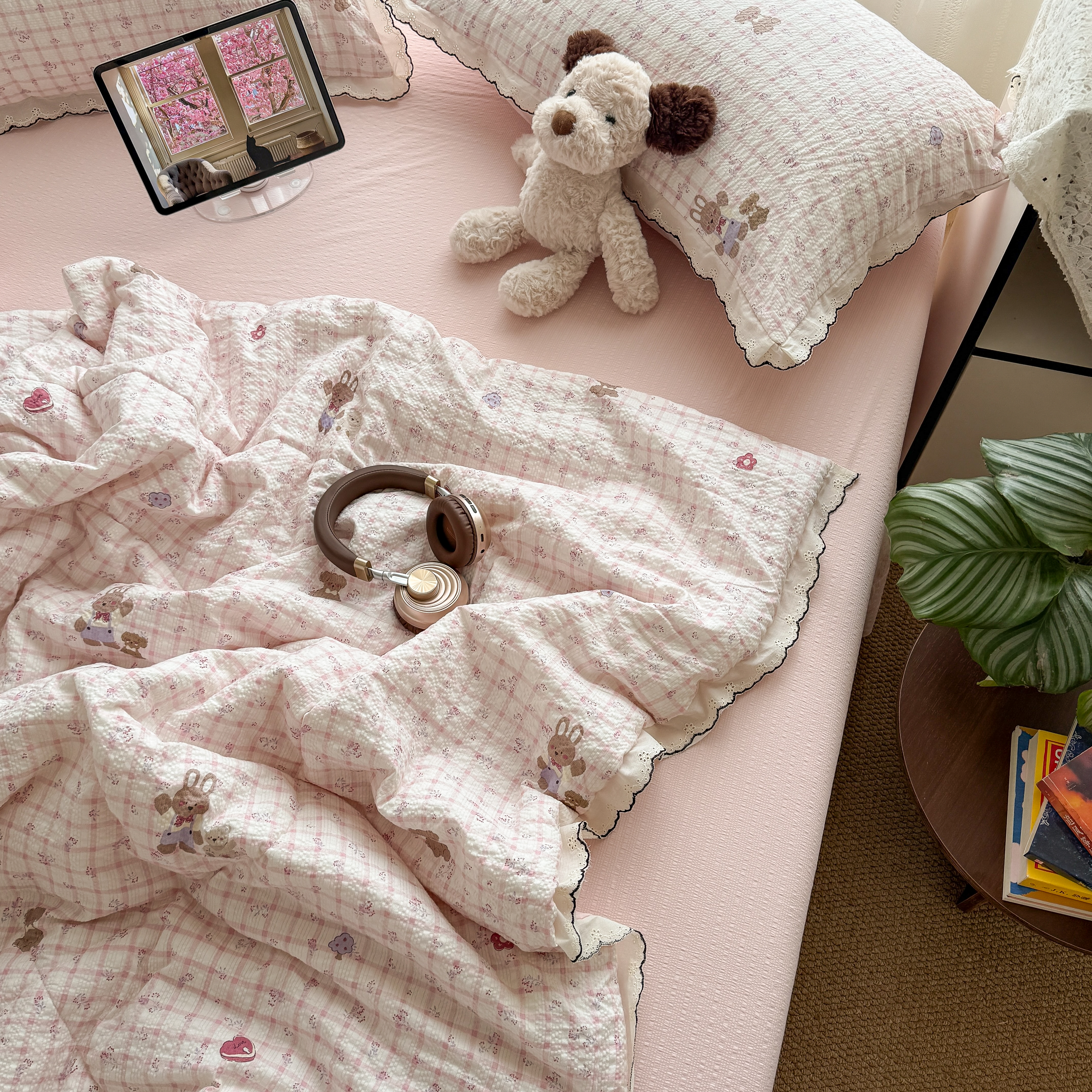 欧尚 2026新款蕾丝花边夏被款四件套 格系萌兔