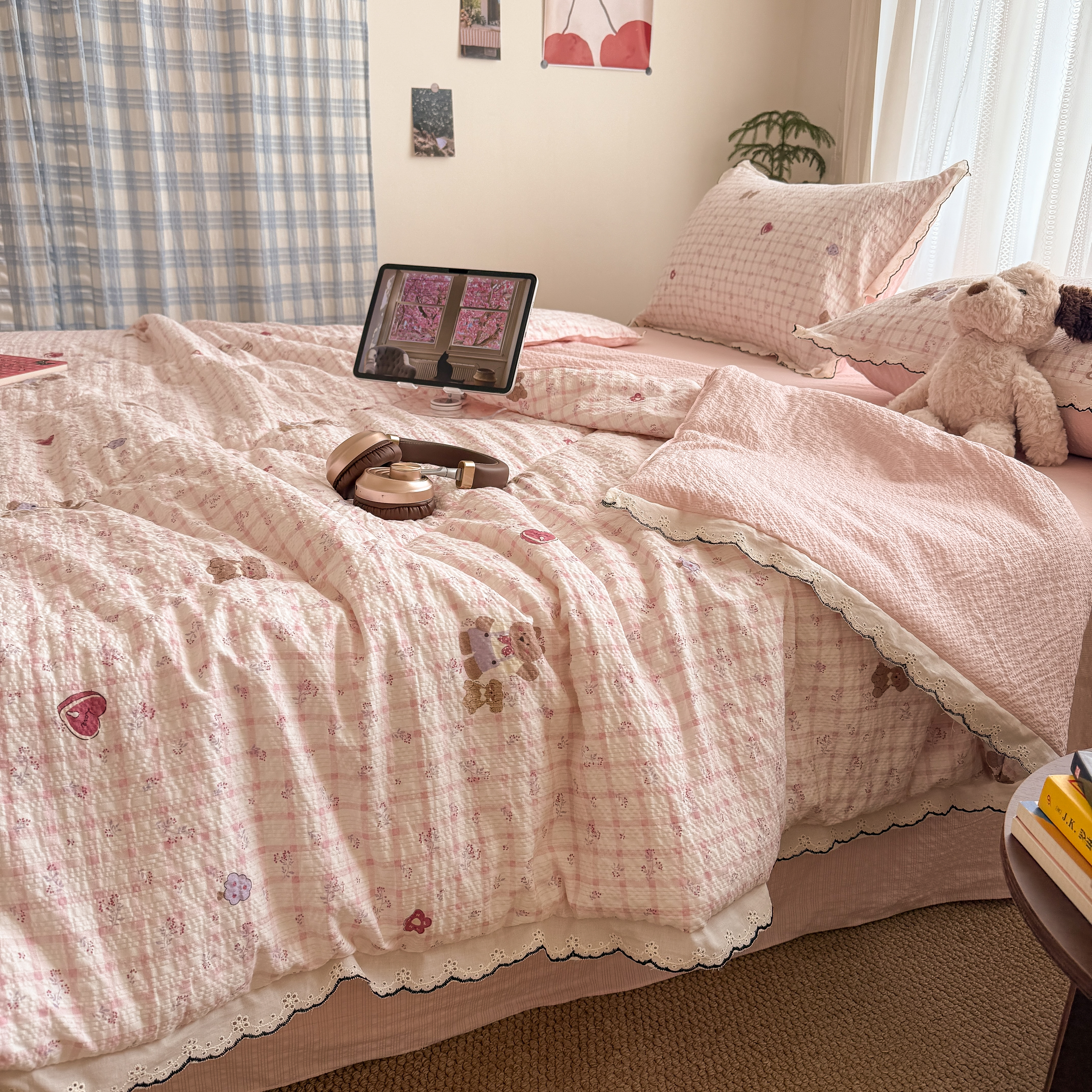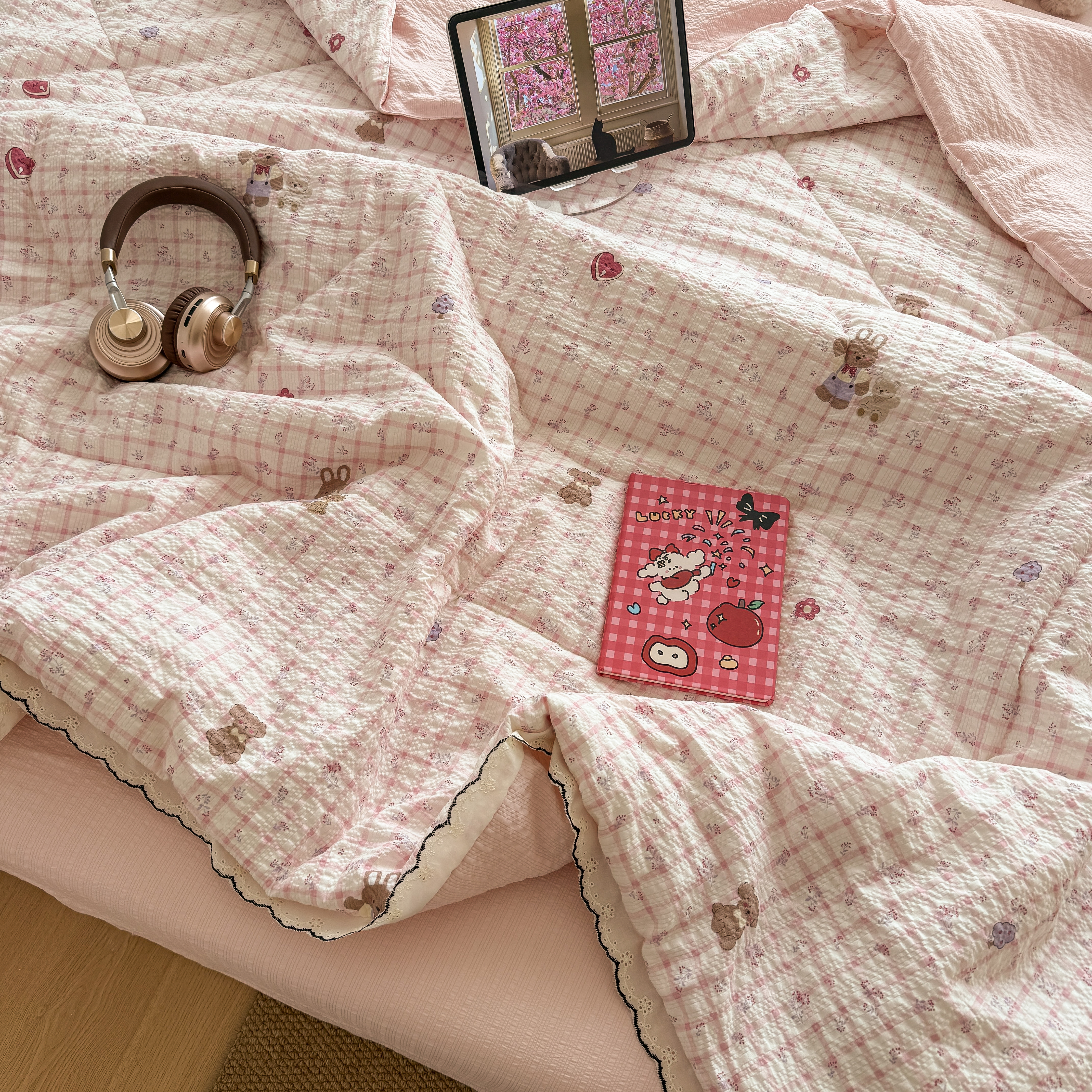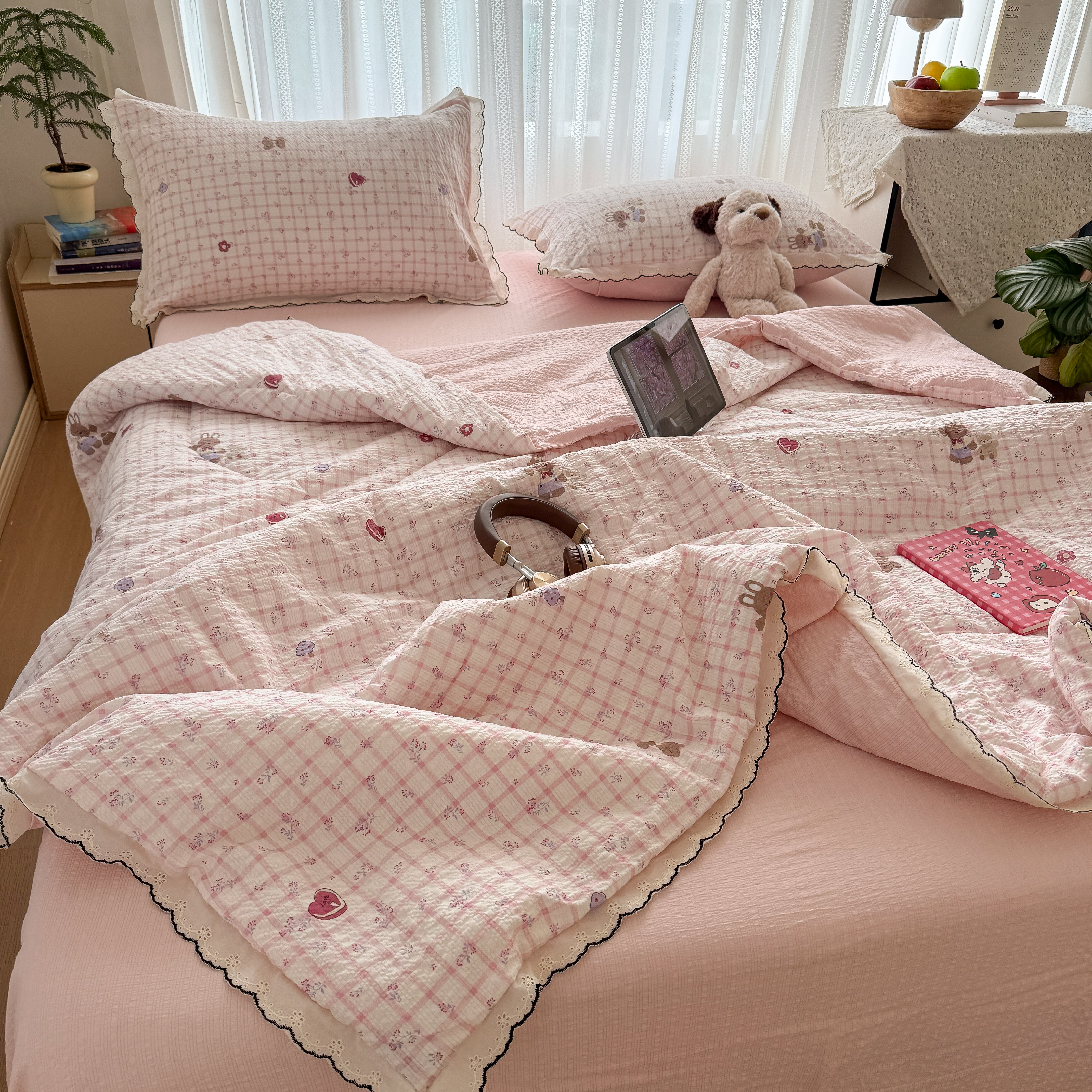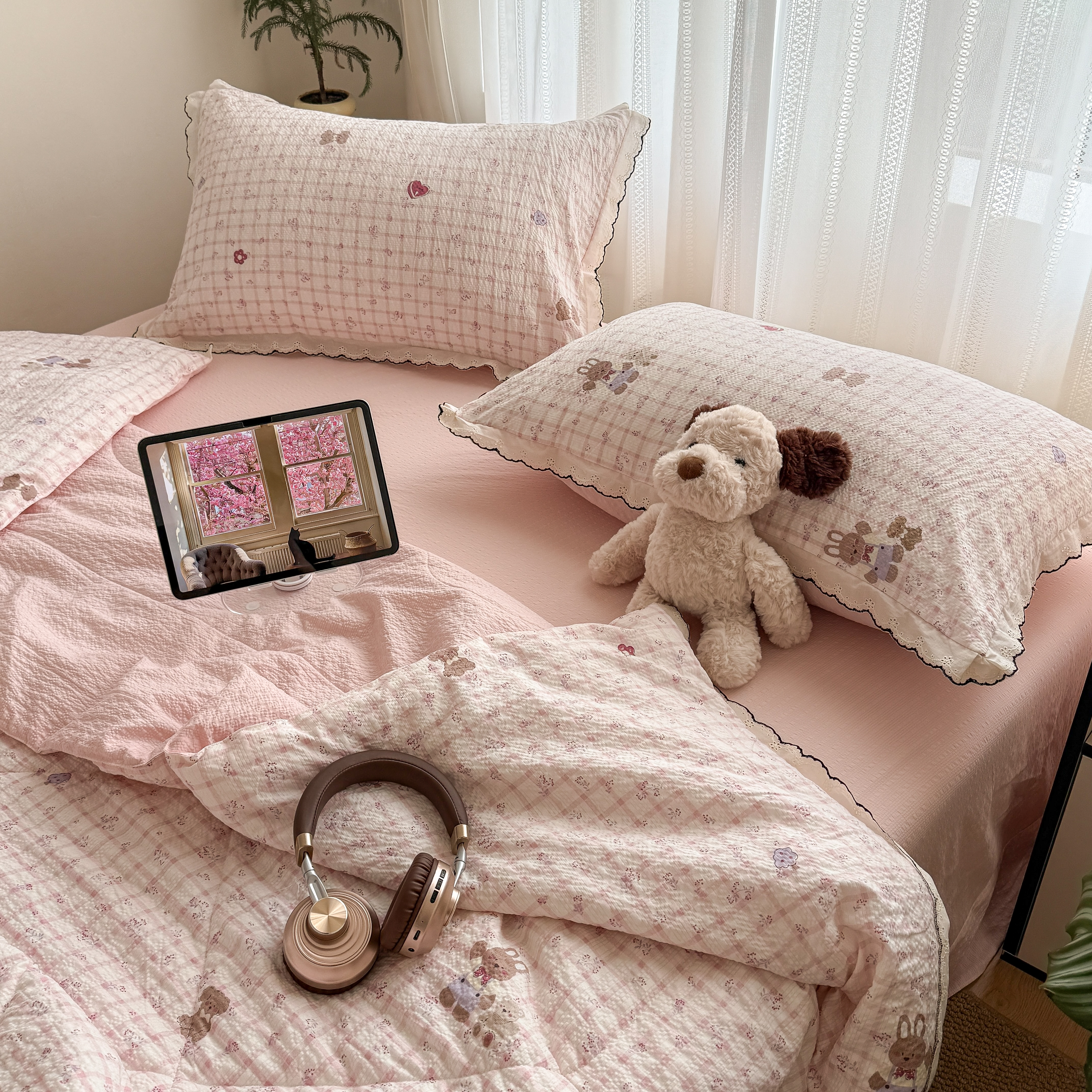 欧尚 2026新款蕾丝花边夏被款四件套 格系萌兔