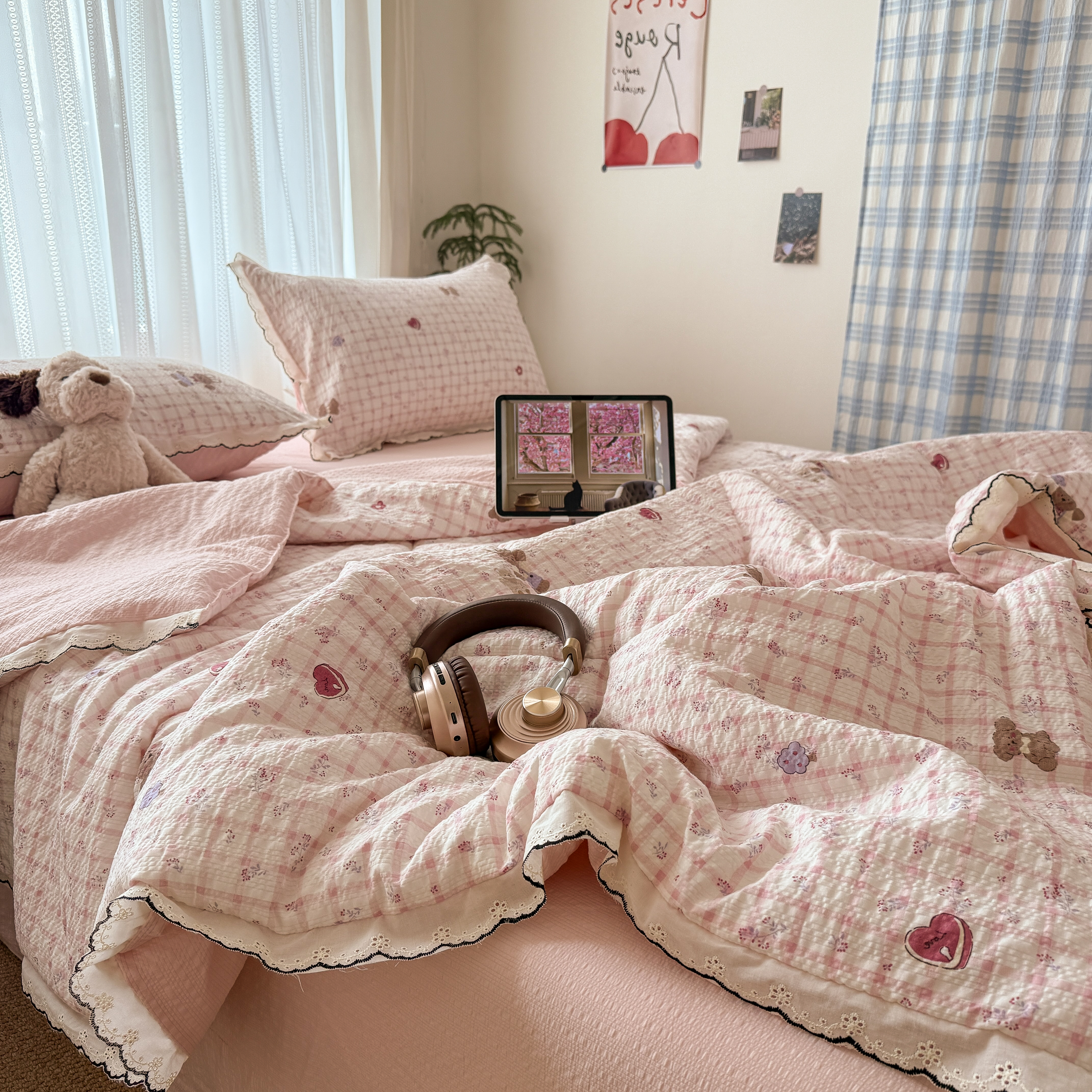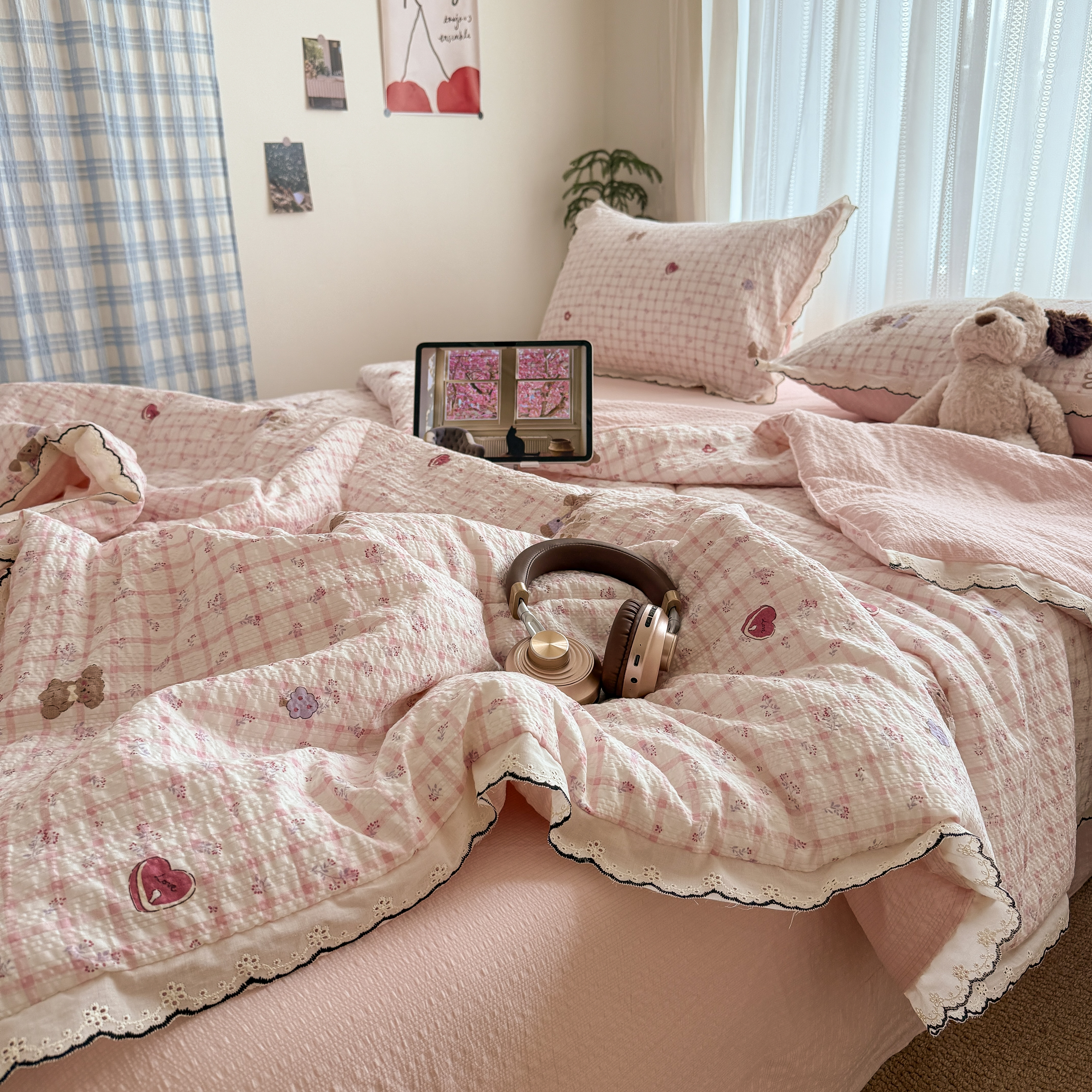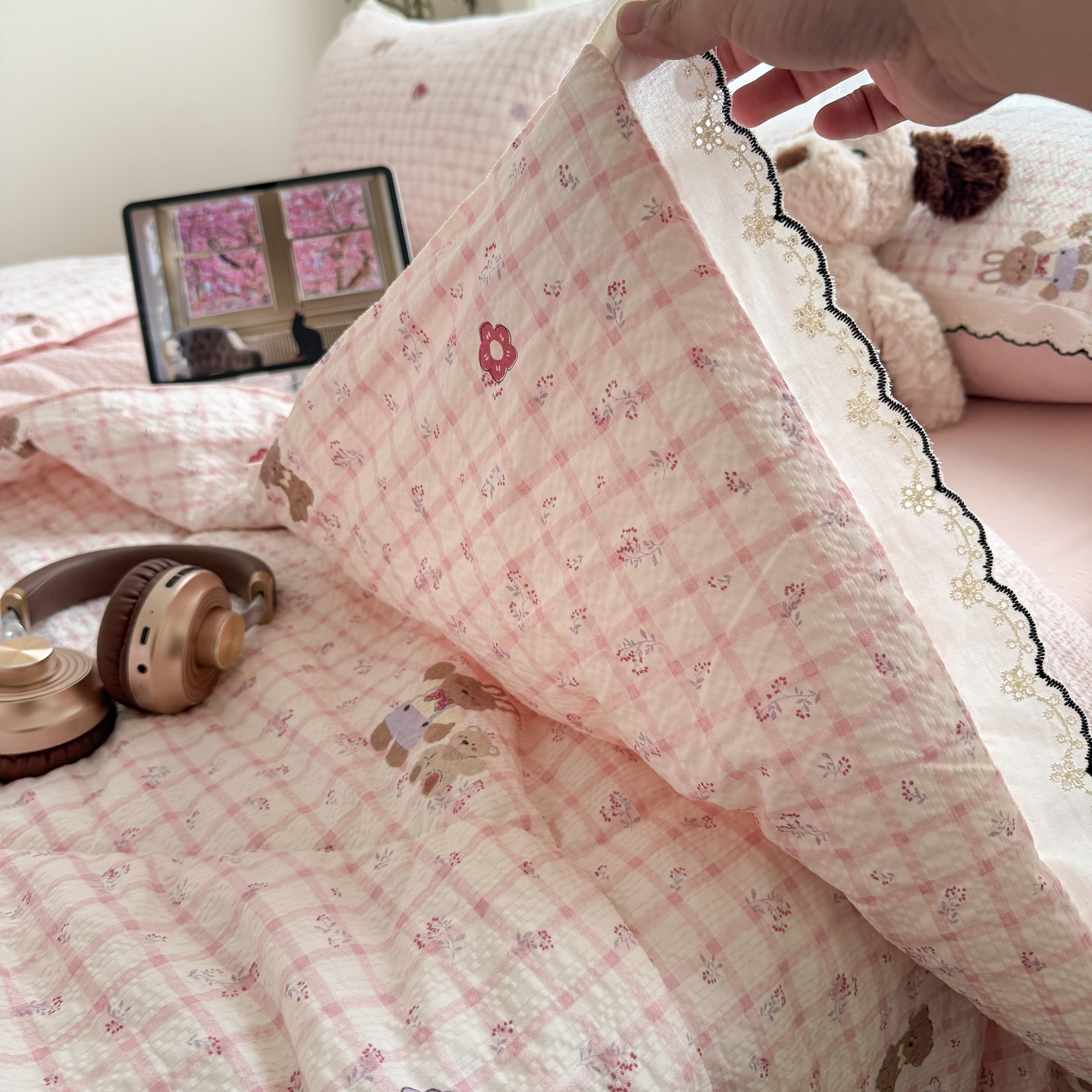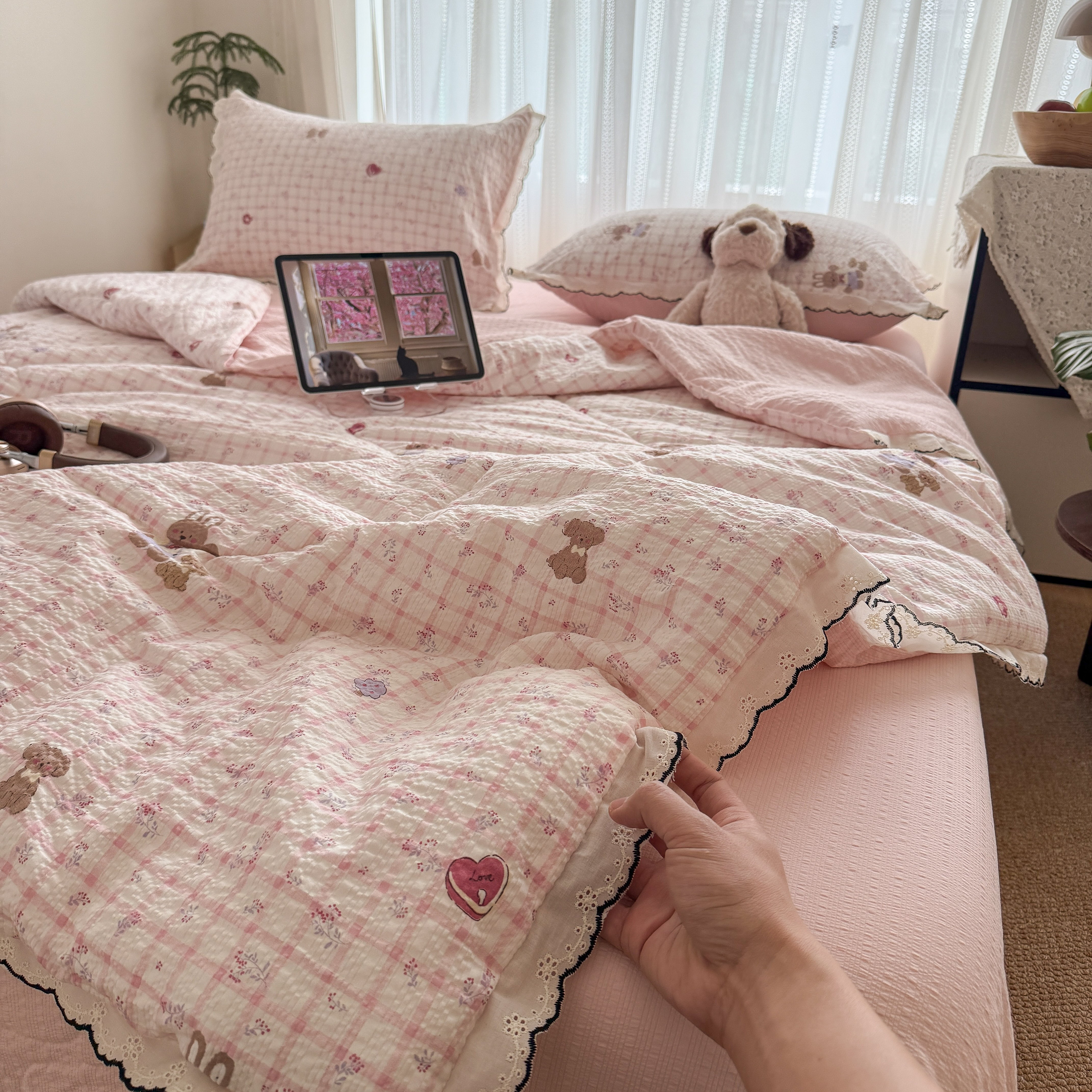 欧尚 2026新款蕾丝花边夏被款四件套 格系萌兔