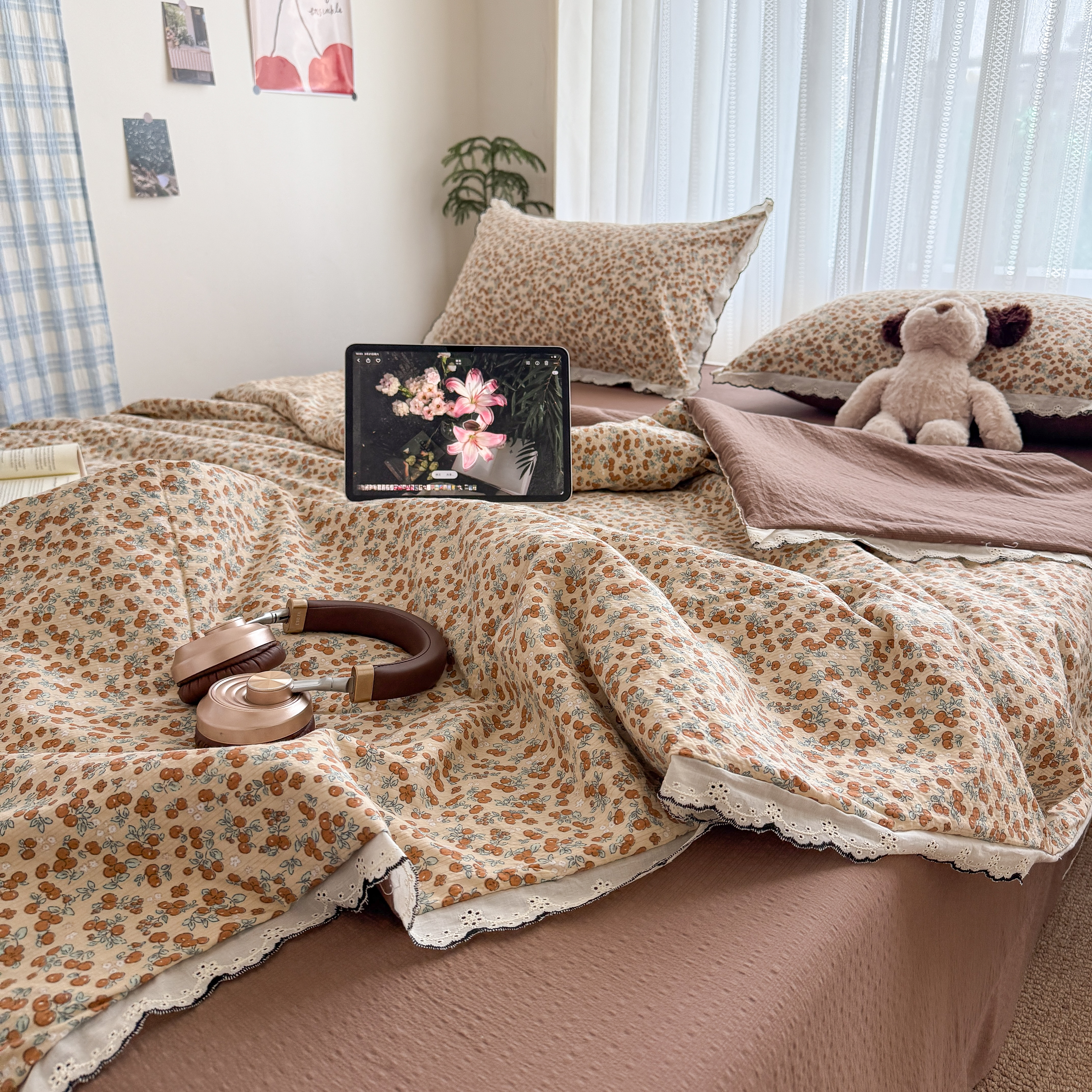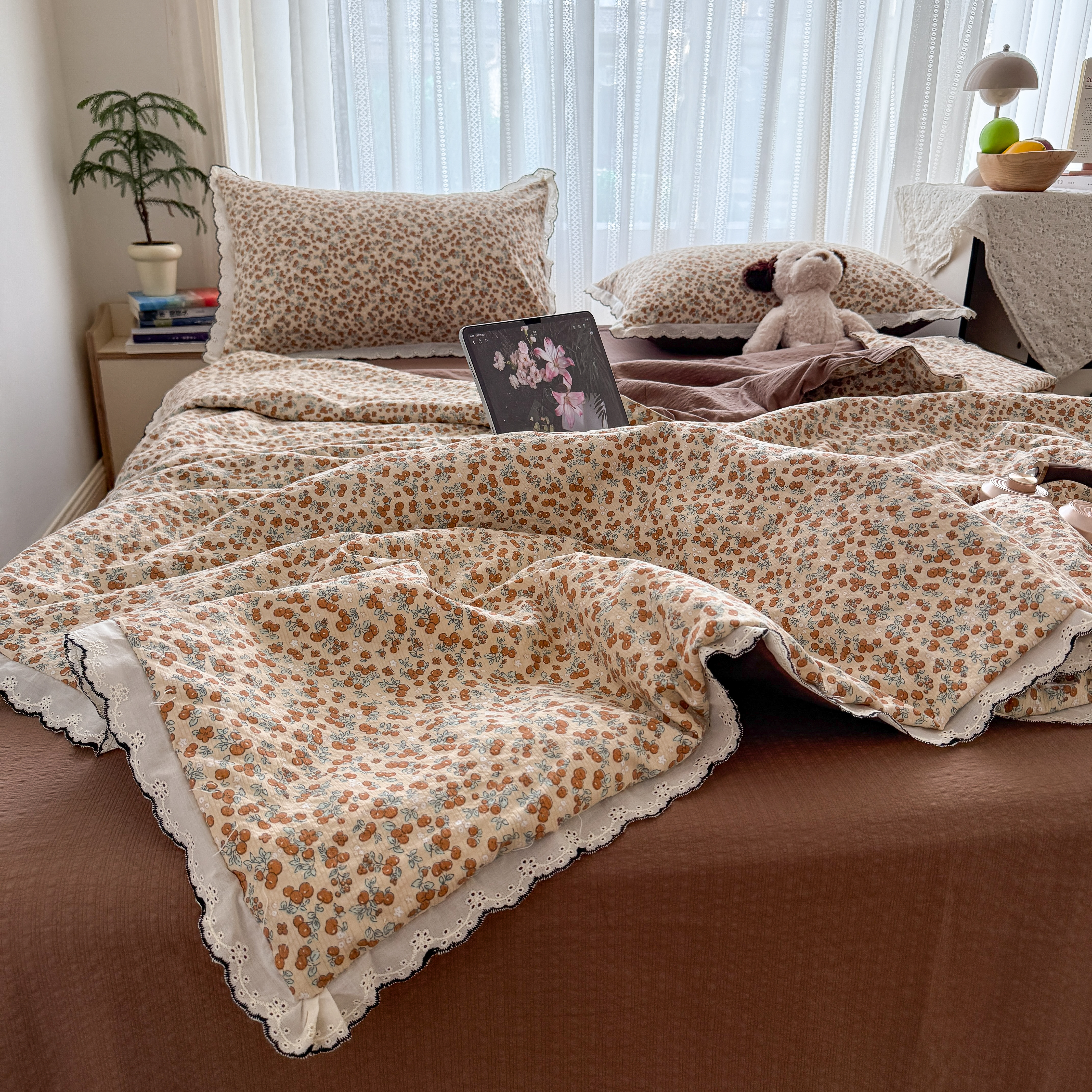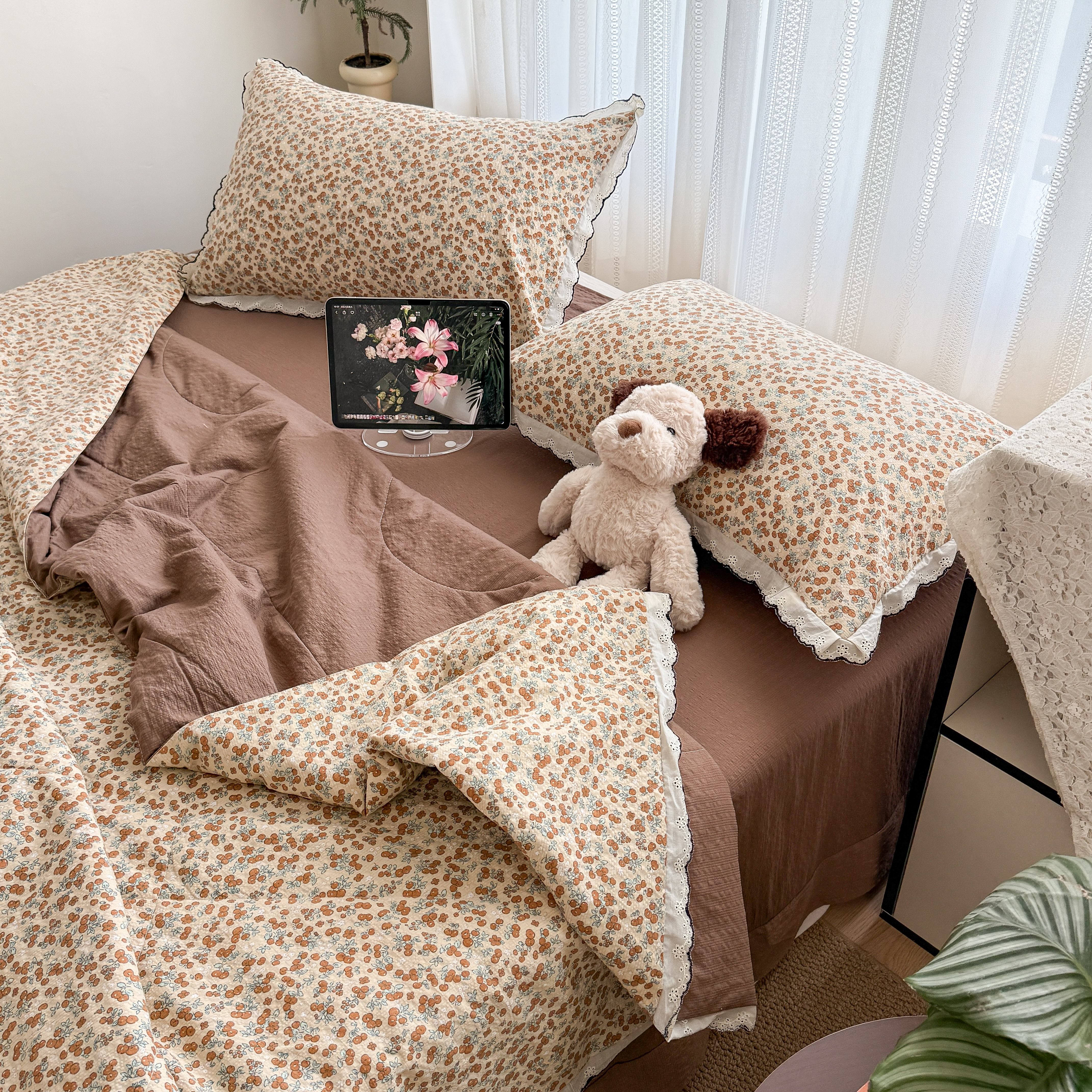 (总)2026新款泡芙纱床盖四件套,咖啡小猫,咖爱心,咖豹纹,小女孩,摇摇马,星愿,暖心,暖橘枝,梦境,梨花落,波点,甜甜兔,紫苏,花束,花花,蝶舞