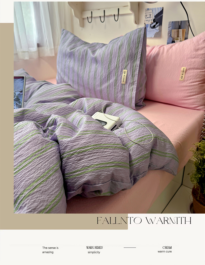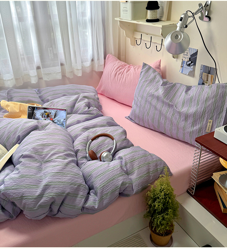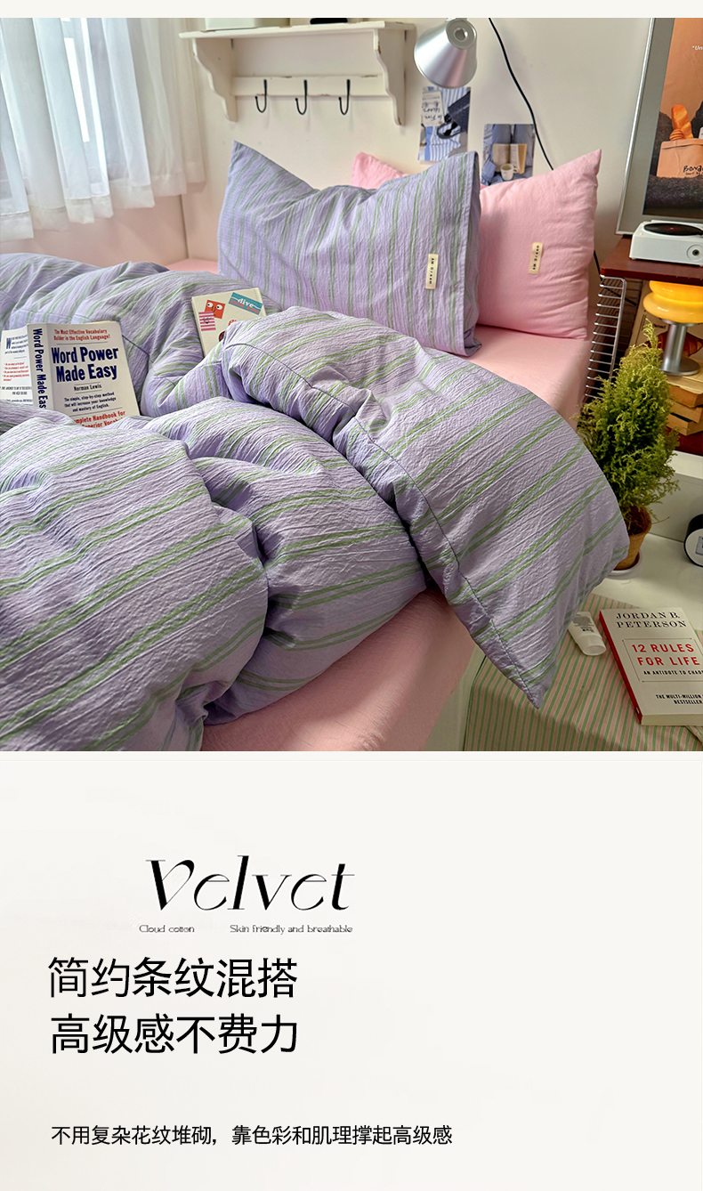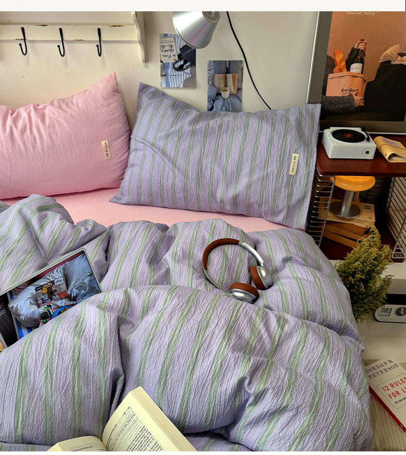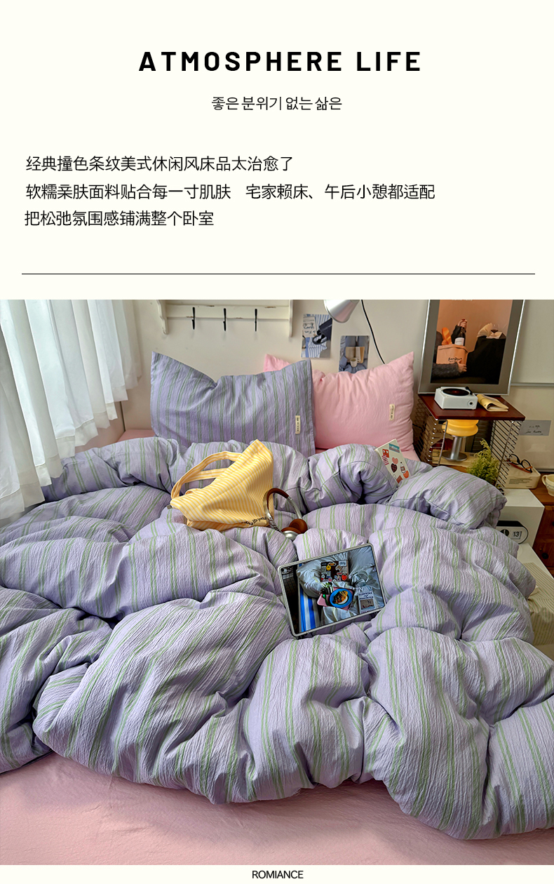 当前位置: 91家纺网 > 商品网购 > 床品套件 > 四件套 > 其它四件套 > 阿曼达 2026春夏新款简约美式条纹混搭四件套 美式休闲-柔紫条