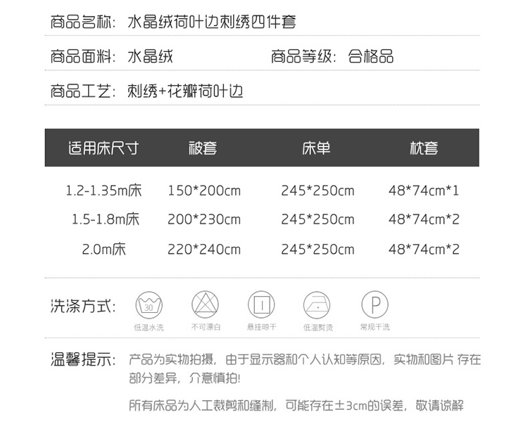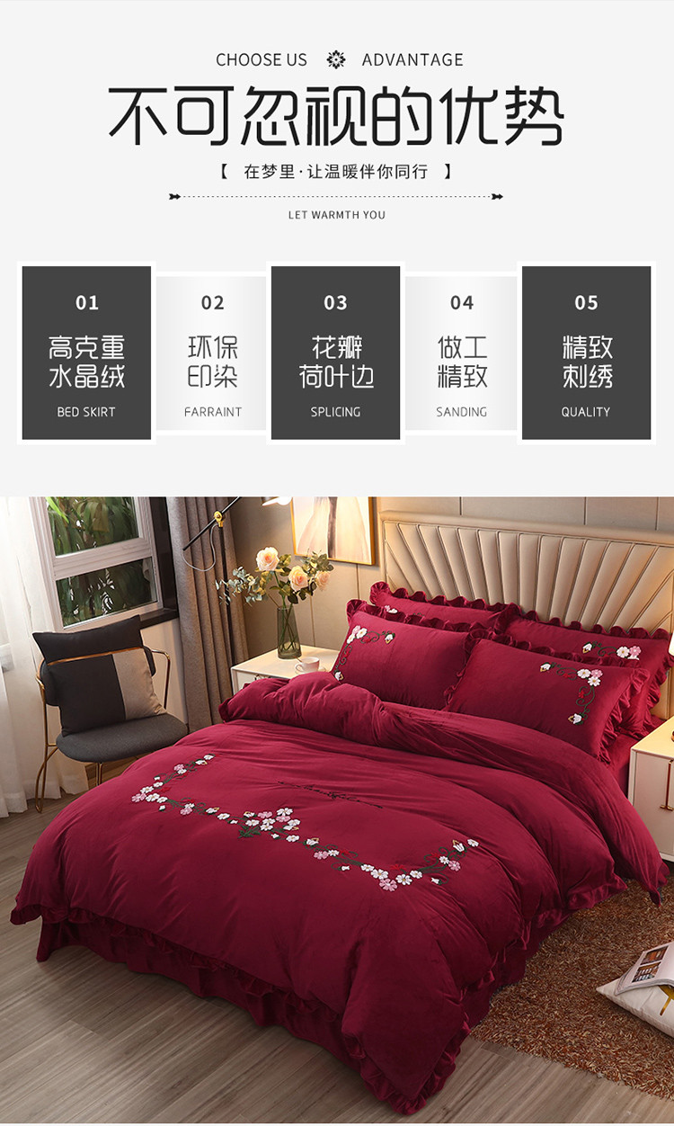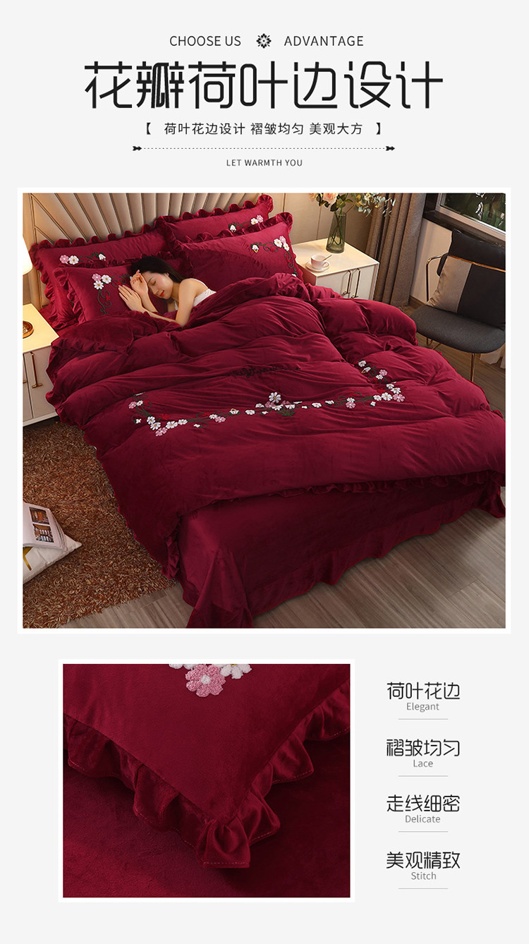 商品名称:恋佳居 2023新款水晶绒荷叶边毛巾绣四件套 百花争艳酒红