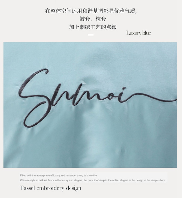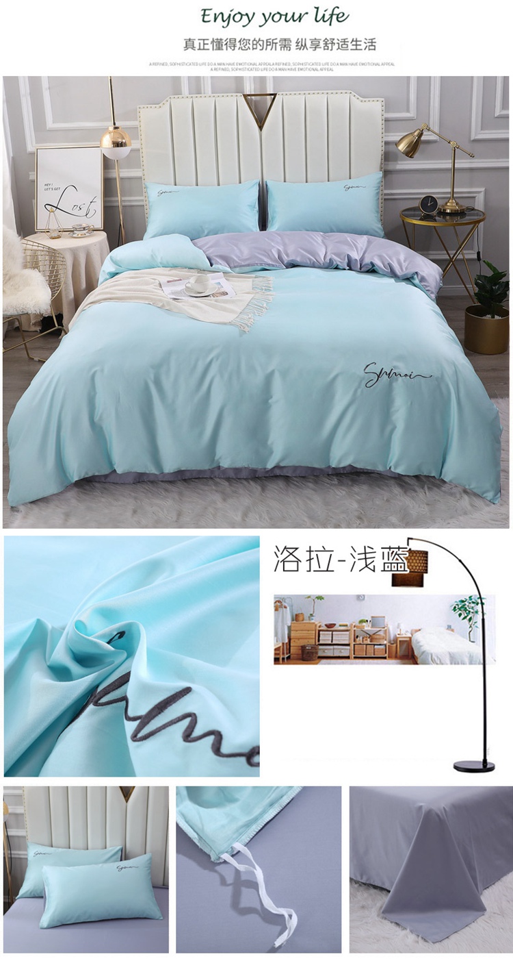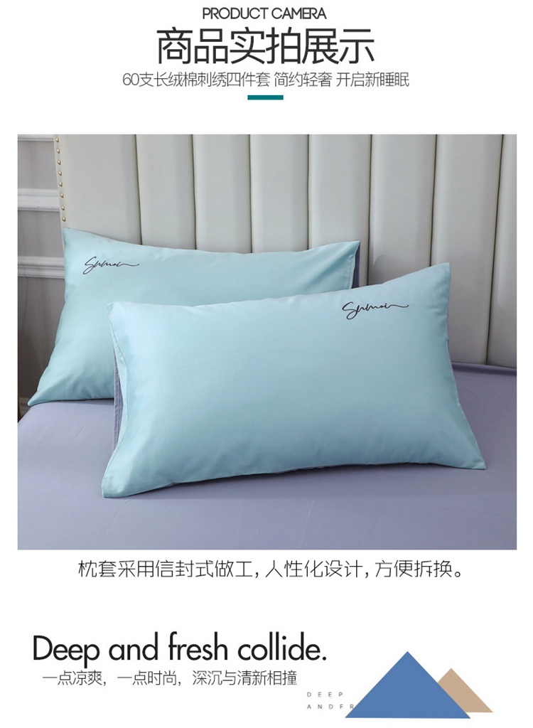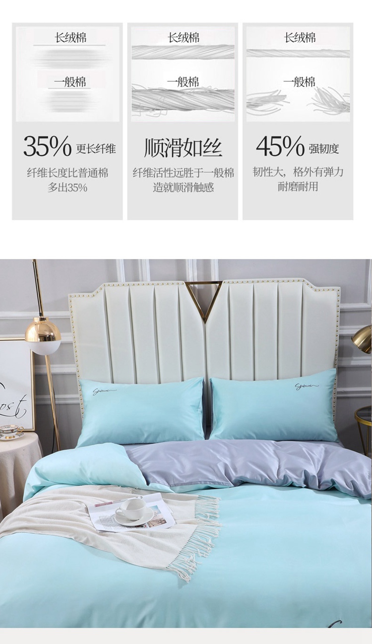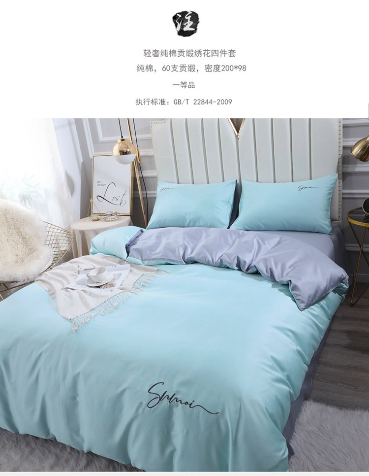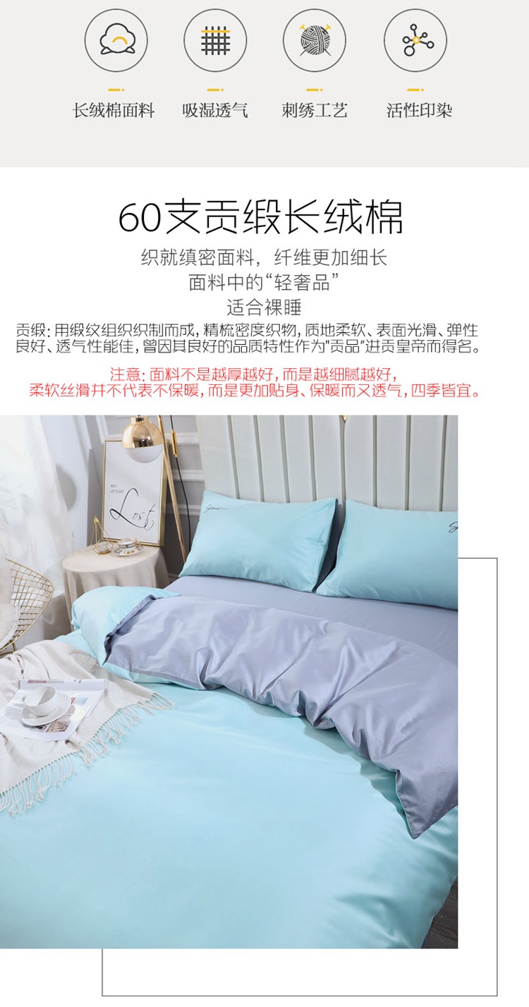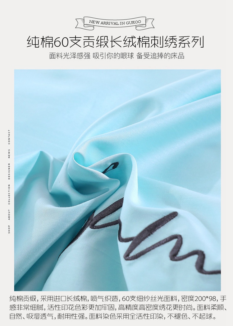 商品名称:2021新款纯色拼色纯棉全棉60S贡缎长绒棉绣花四件套 浅蓝
