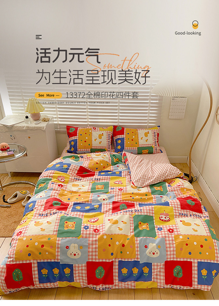 (总)雅居纺家纺 2022新款13070全棉印花四件套,波纹,多彩,简笔画,莓关系,奶油绿豹纹,倾心,数字
