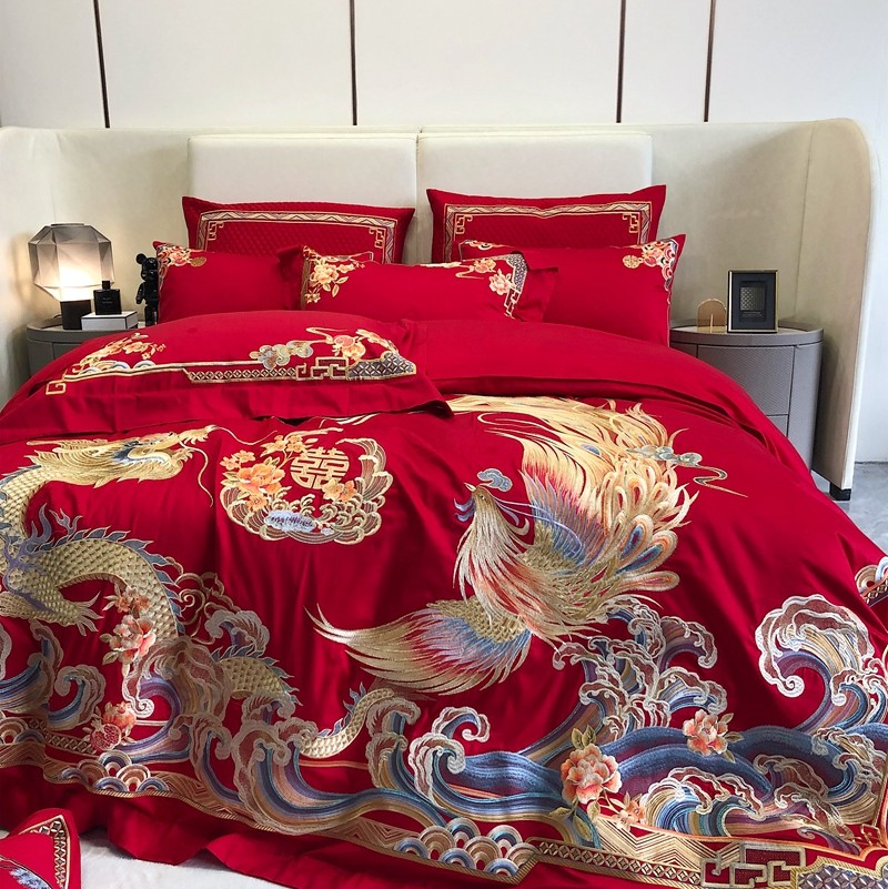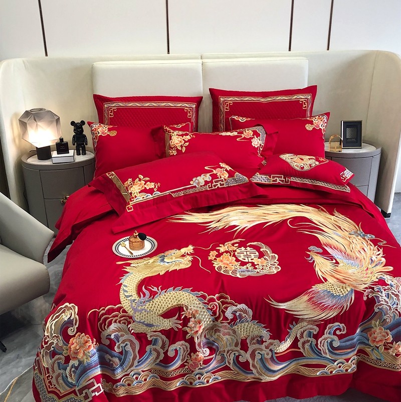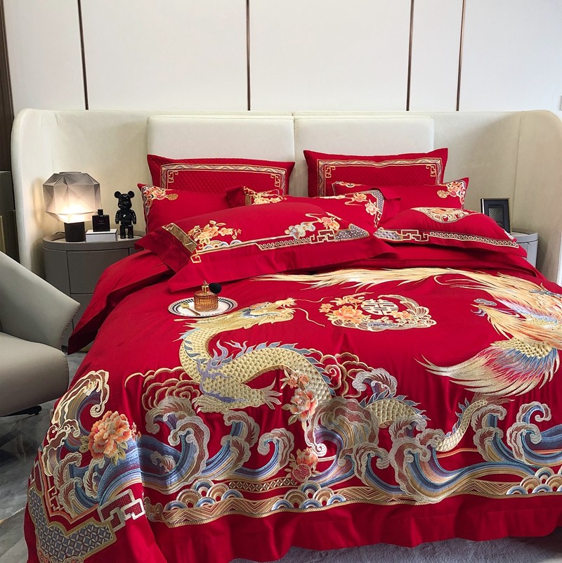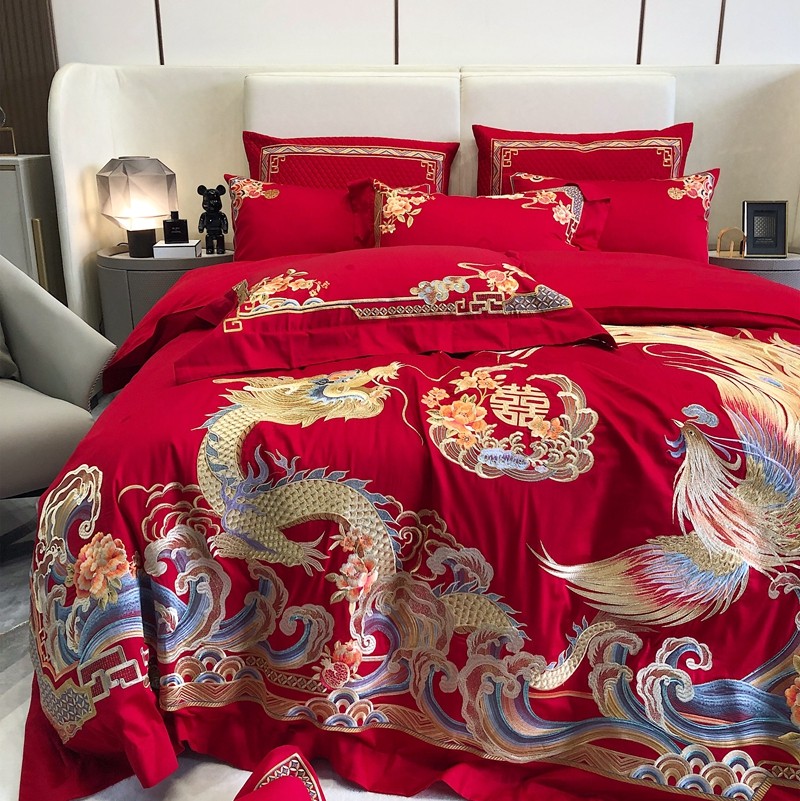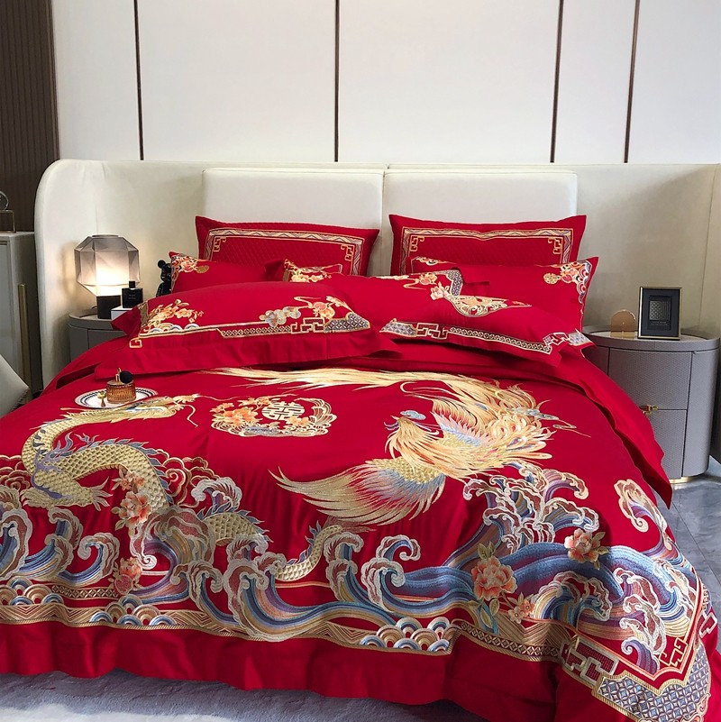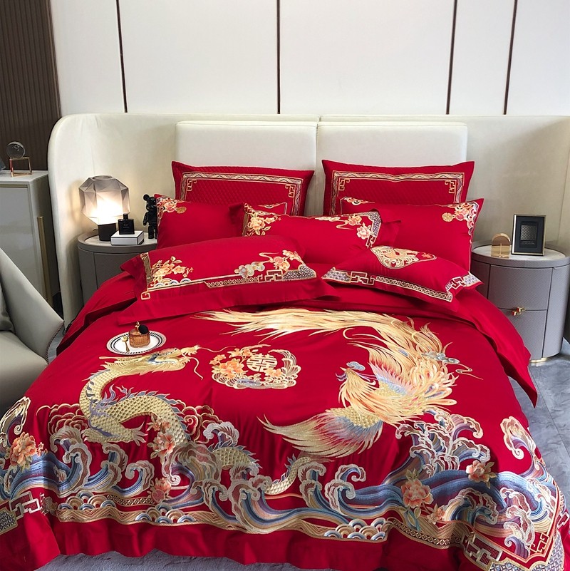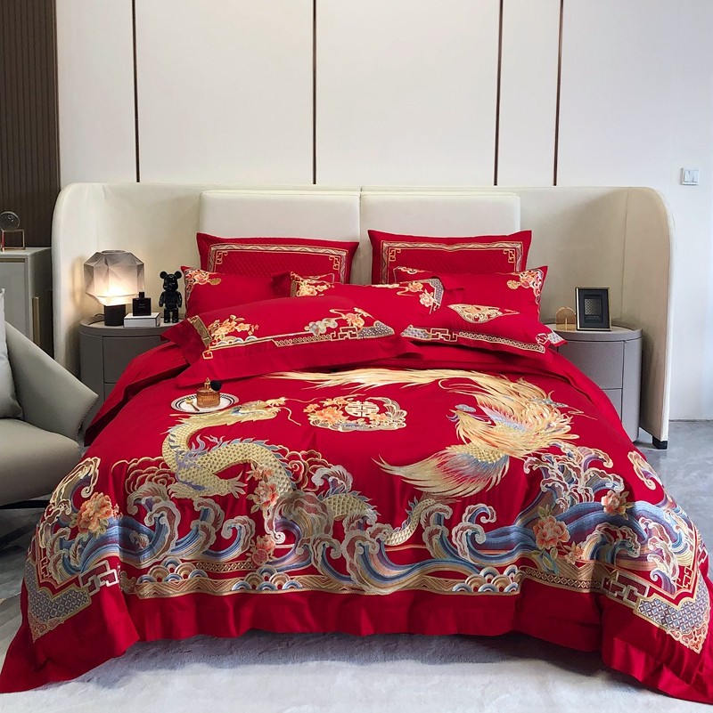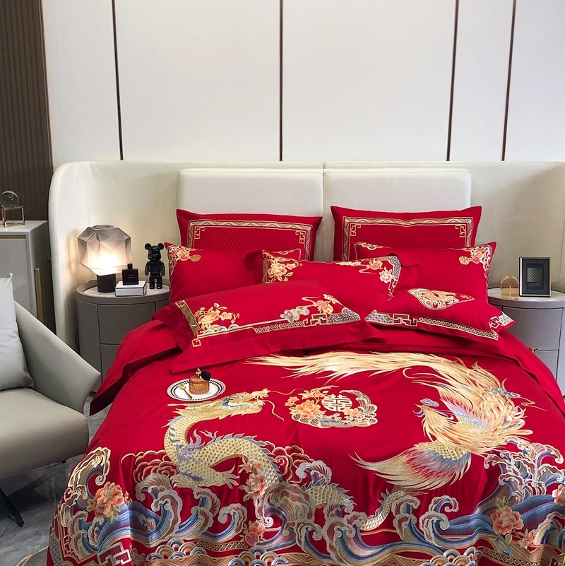 馨蕊家居2022新款140S全棉长绒棉刺绣婚庆四件套承龙御凤